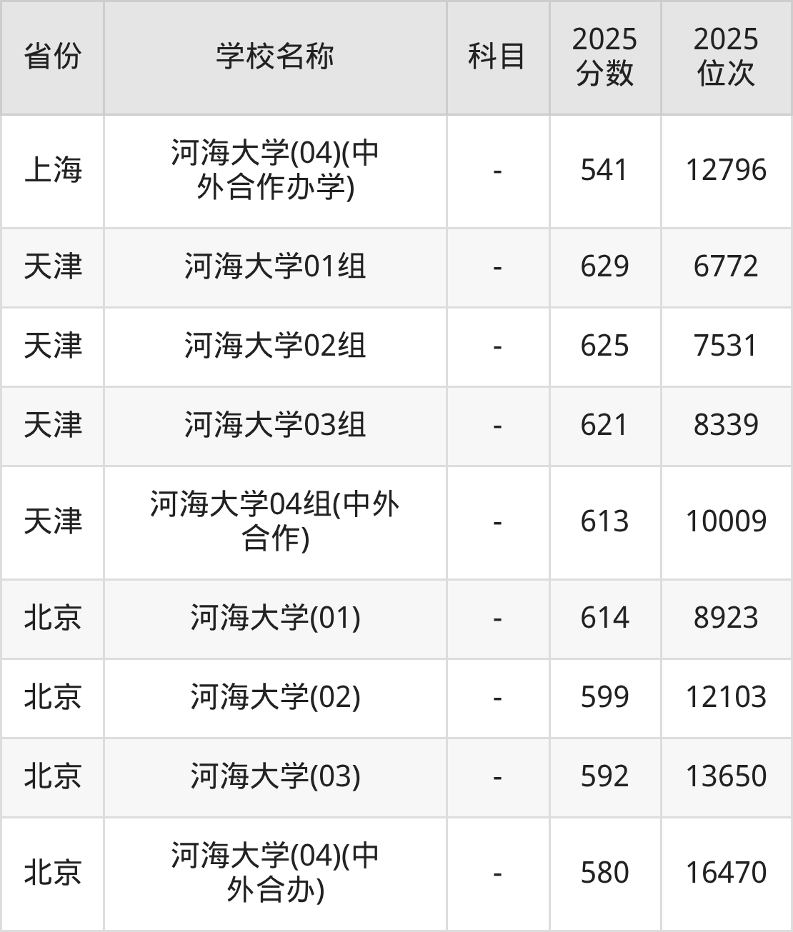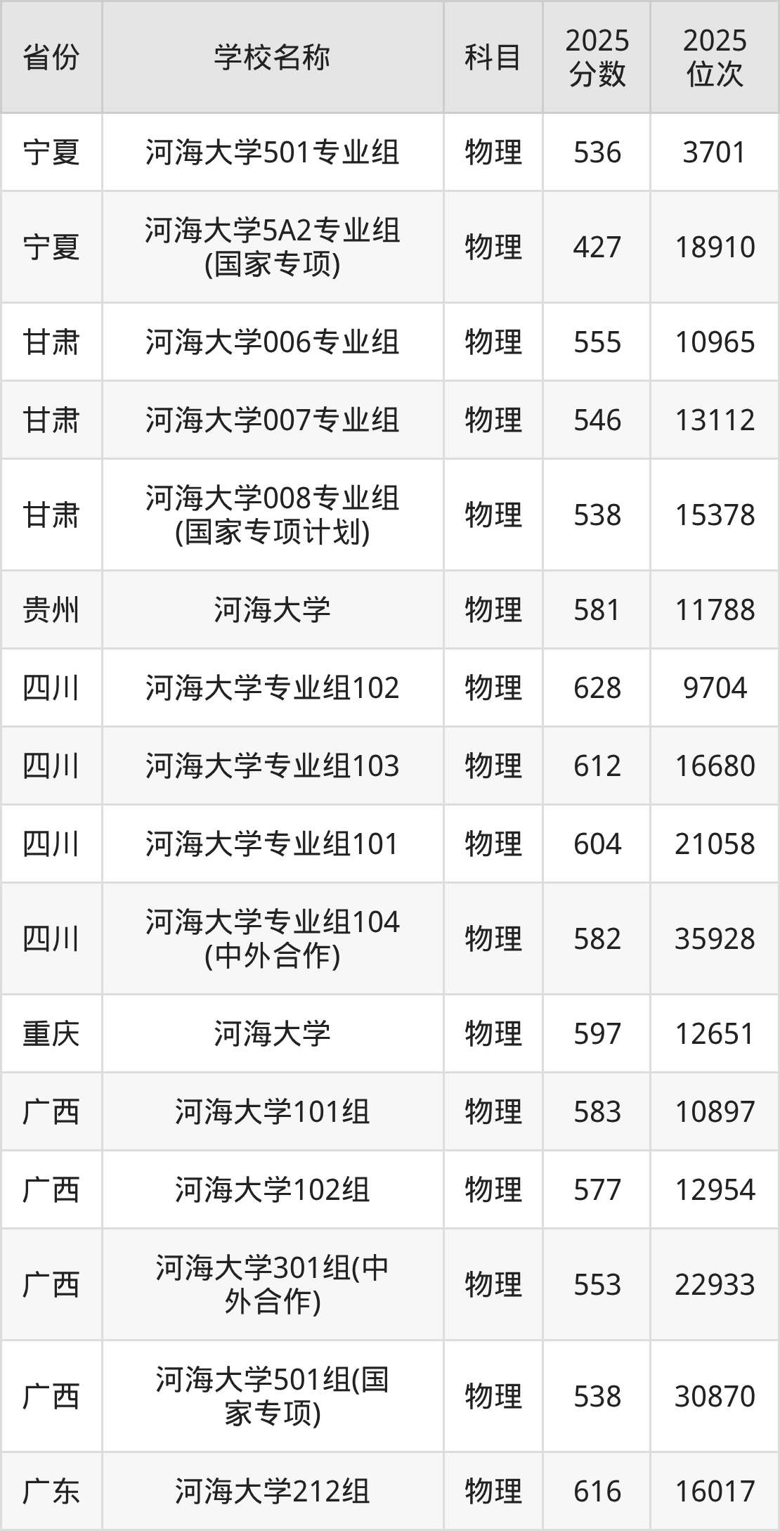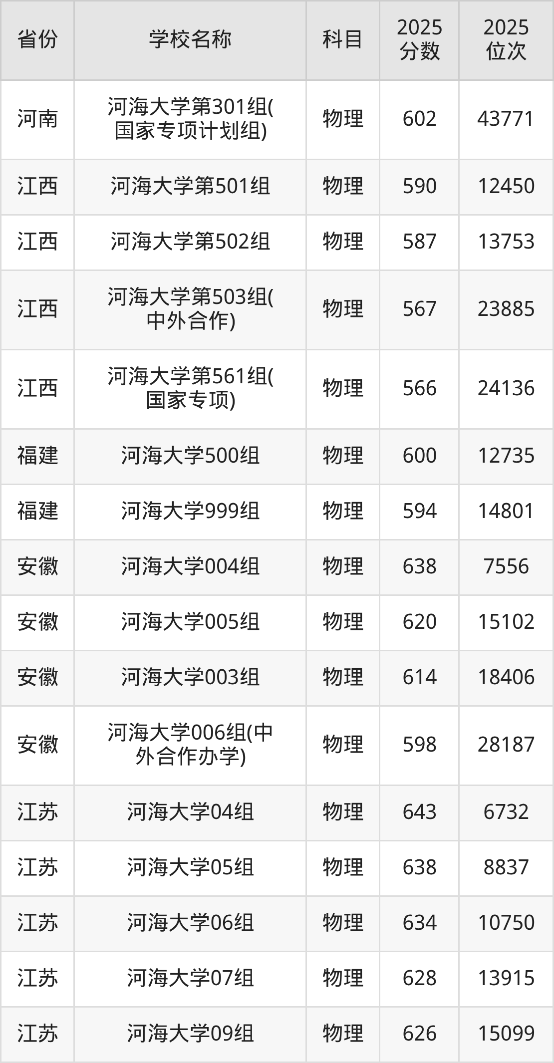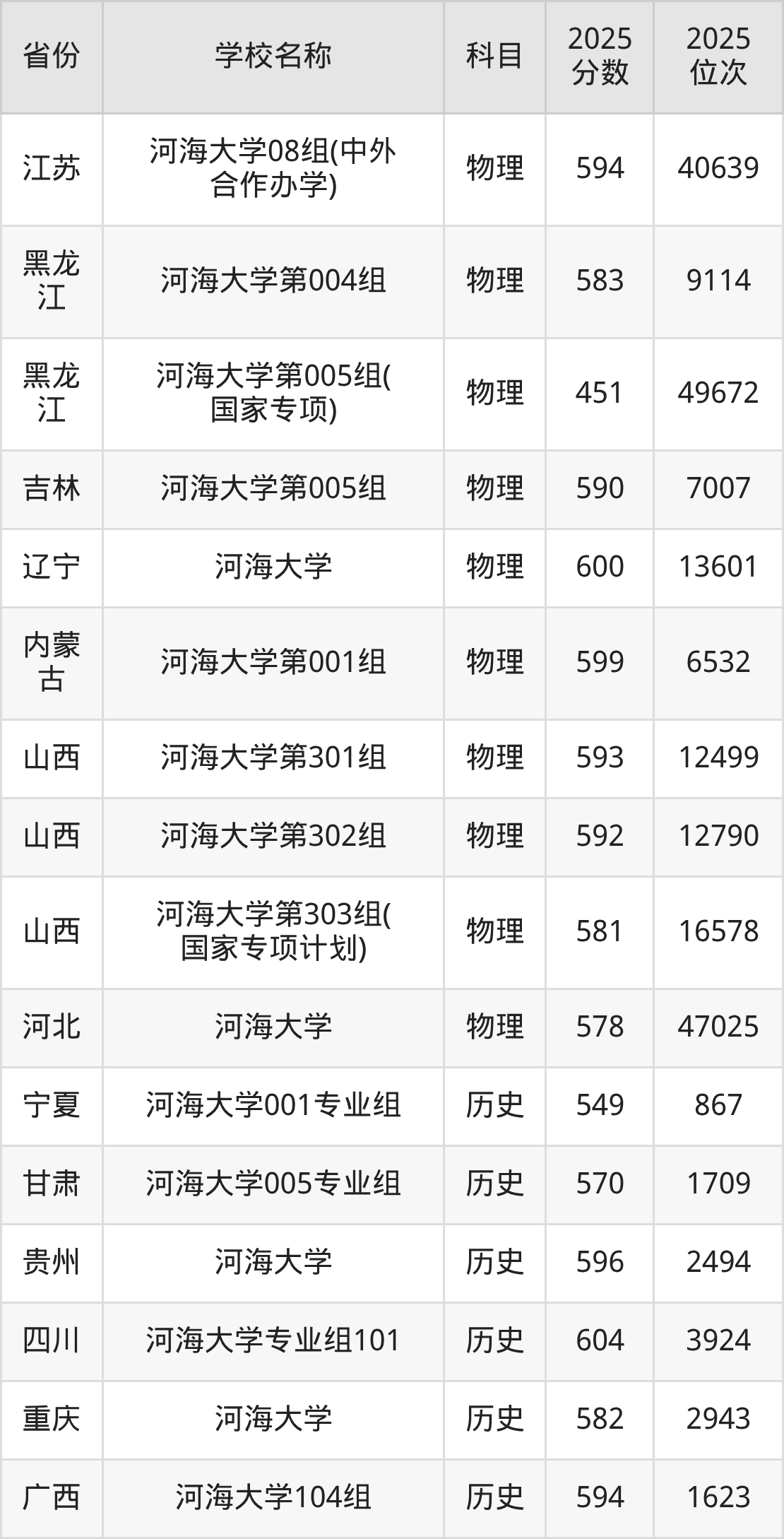 二、河海大学各专业录取分数线