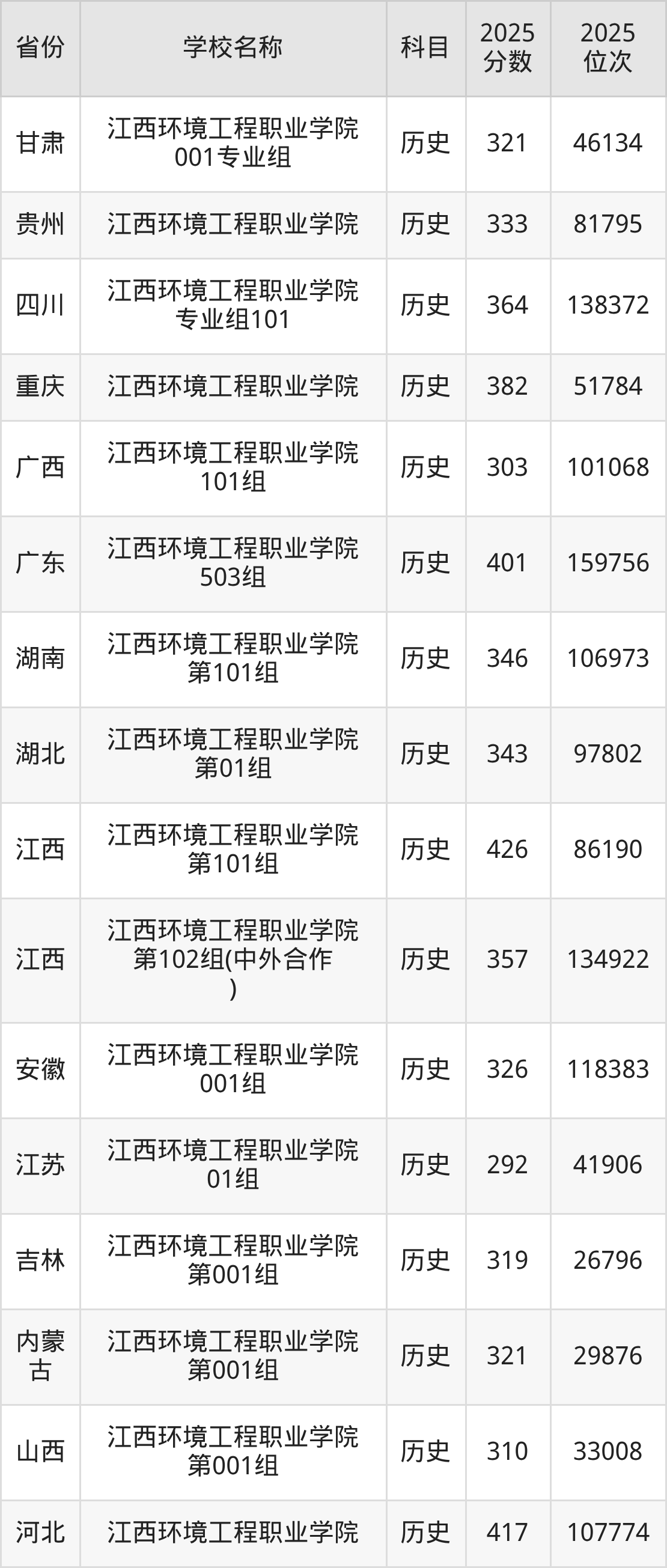 江西环境工程职业学院2025年有2个专业组面向江西省内首选了历史科目的考生招生: