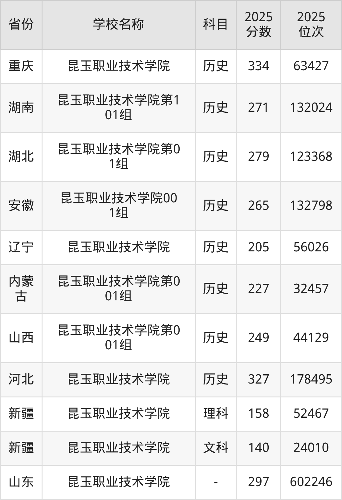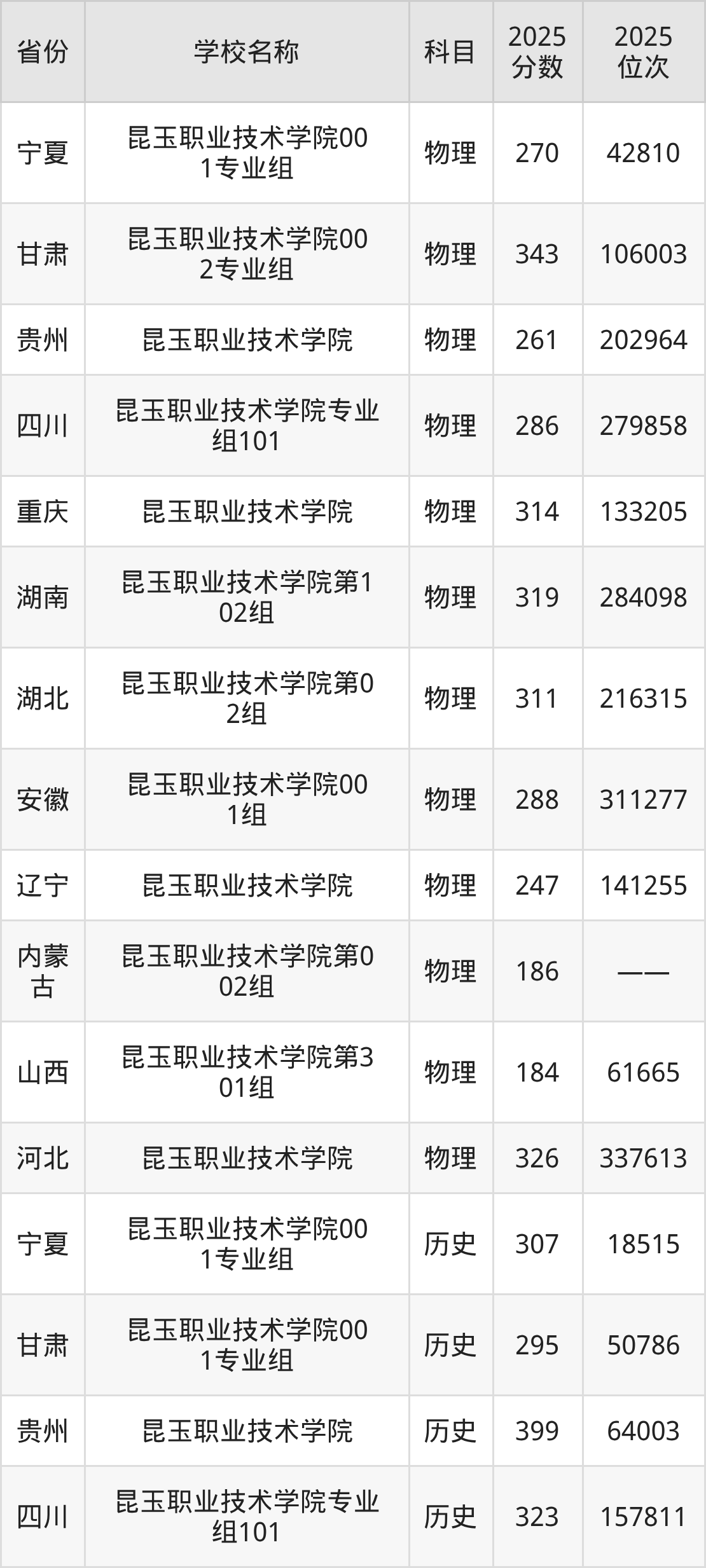 可见,昆玉职业技术学院的不同科目,在“招生专业、录取分数线”等方面有较大区别。不同科目组之间的分数线差距高达18分。