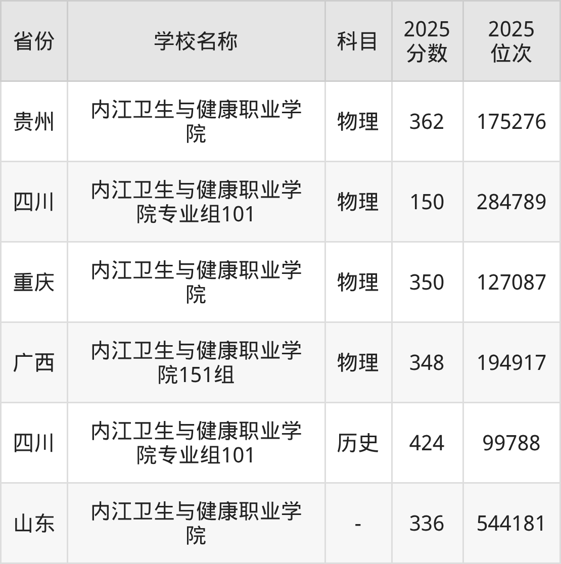 内江卫生与健康职业学院2025年有1个专业组面向四川省内首选了物理科目的考生招生: