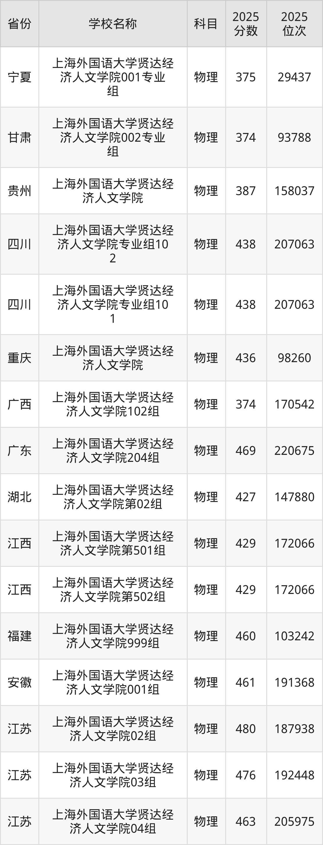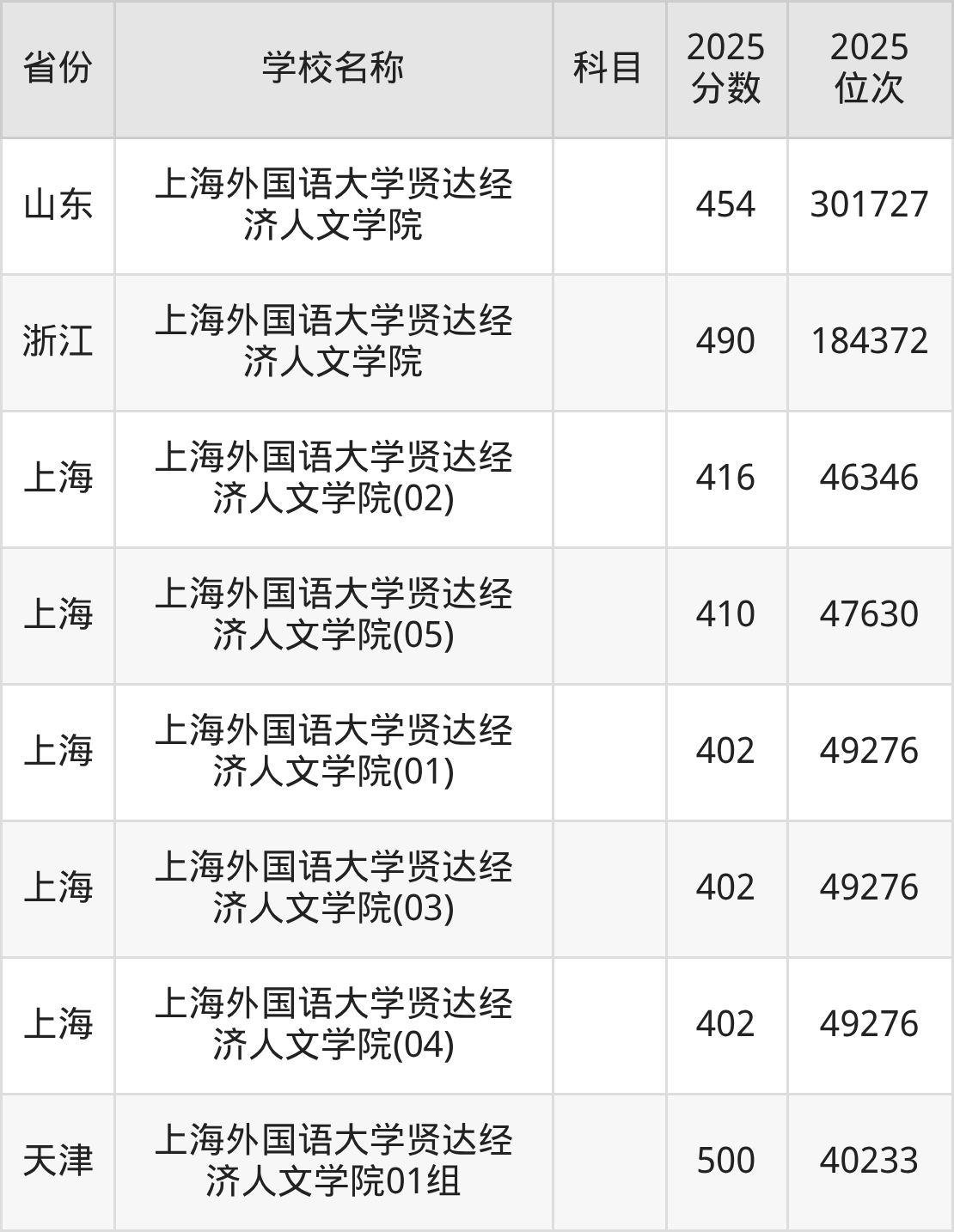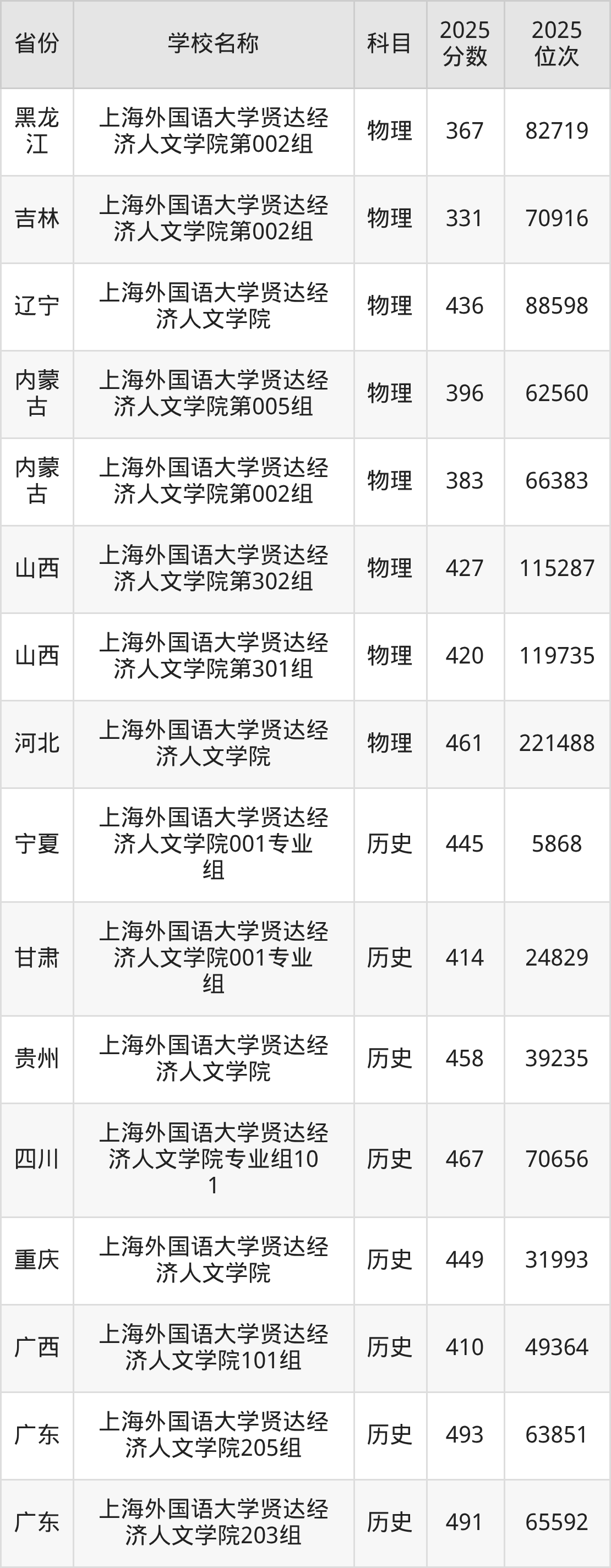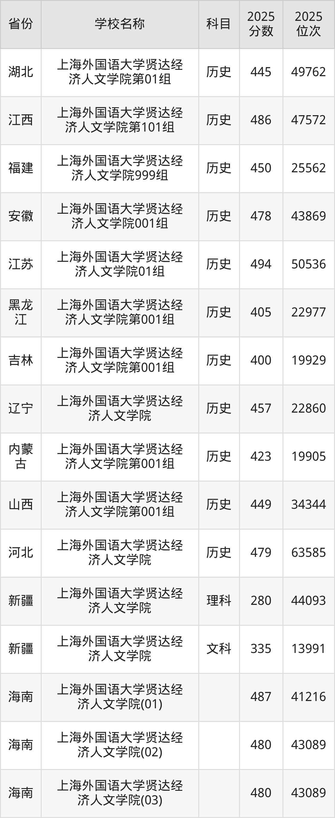 一、2025上海外国语大学贤达经济人文学院录取分数线