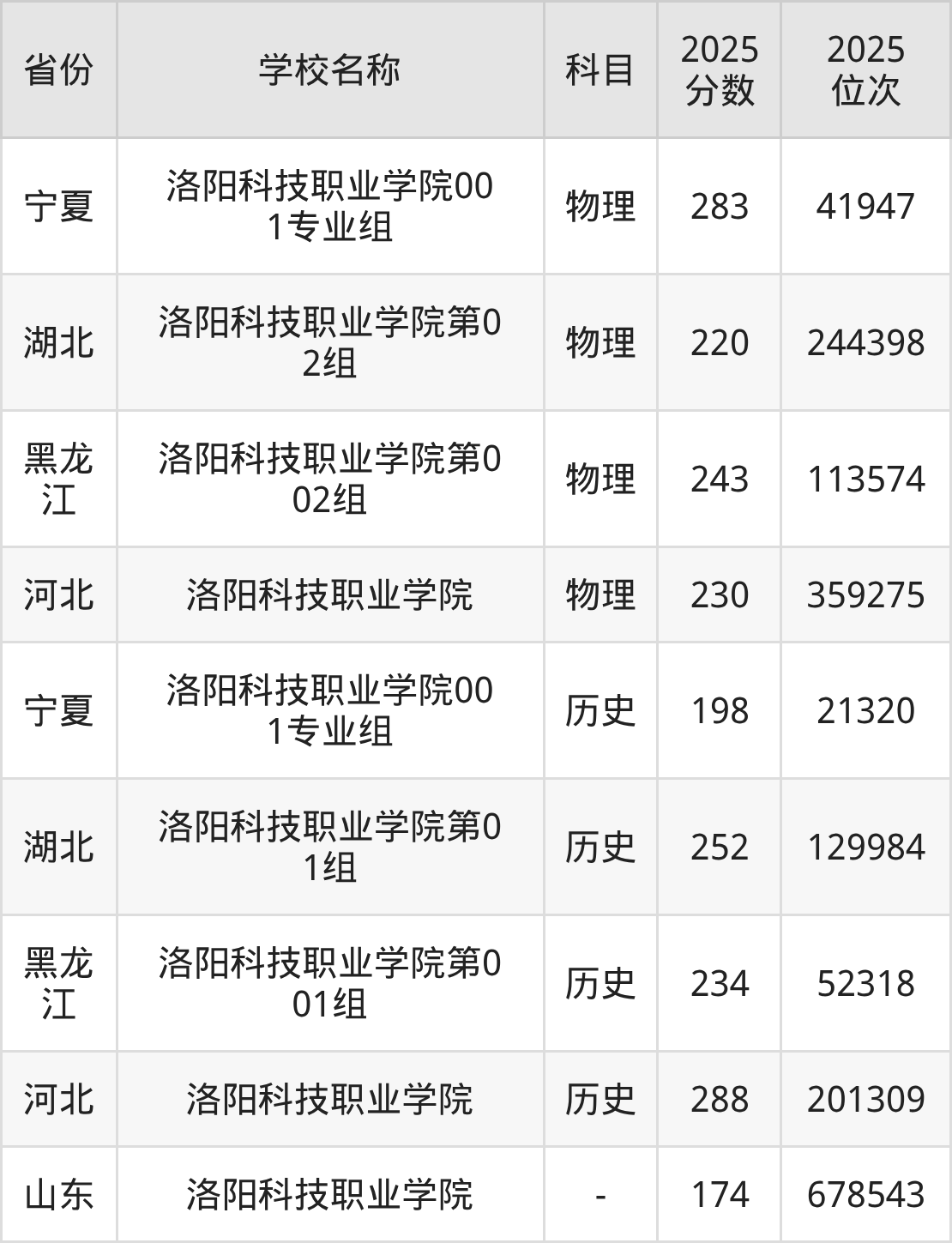 2025年洛阳科技职业学院在全国各省专科的最低录取分数线在174~288分之间。宁夏物理类高考生最低283分能上洛阳科技职业学院、黑龙江物理类高考生最低243分能上洛阳科技职业学院……下文将展示洛阳科技职业学院在全国5个高考省份中的专科最低投档录取分汇总!