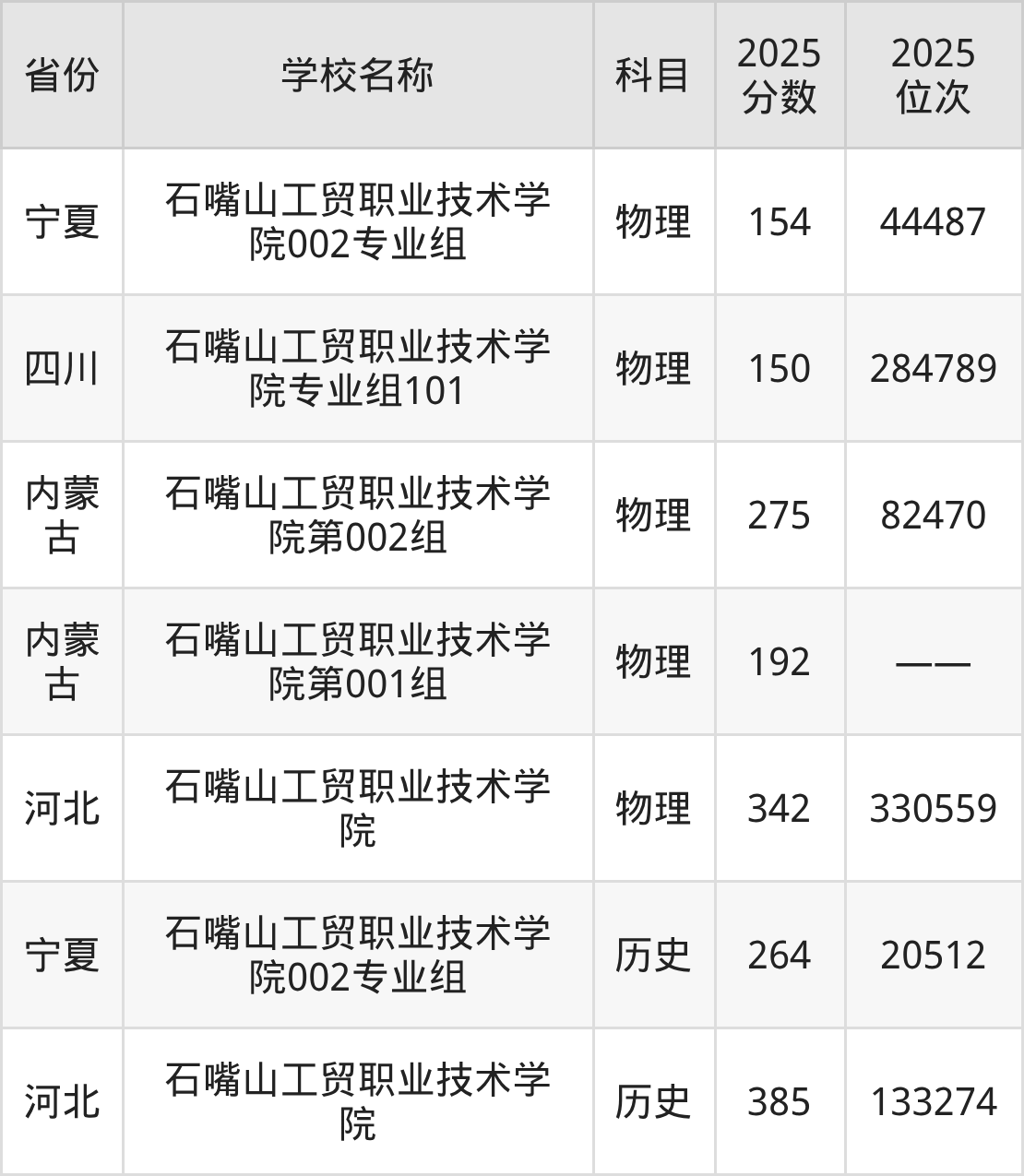 再看宁夏高考2025年专科批次线,历史类是150分、物理类是150分。通过对比发现:石嘴山工贸职业技术学院2025年历史类最低分比专科线高114分,物理类最低分比专科线高4分。2026届宁夏高考生,可通过每一次模考划线,来判断自己的成绩是否有机会被石嘴山工贸职业技术学院录取。