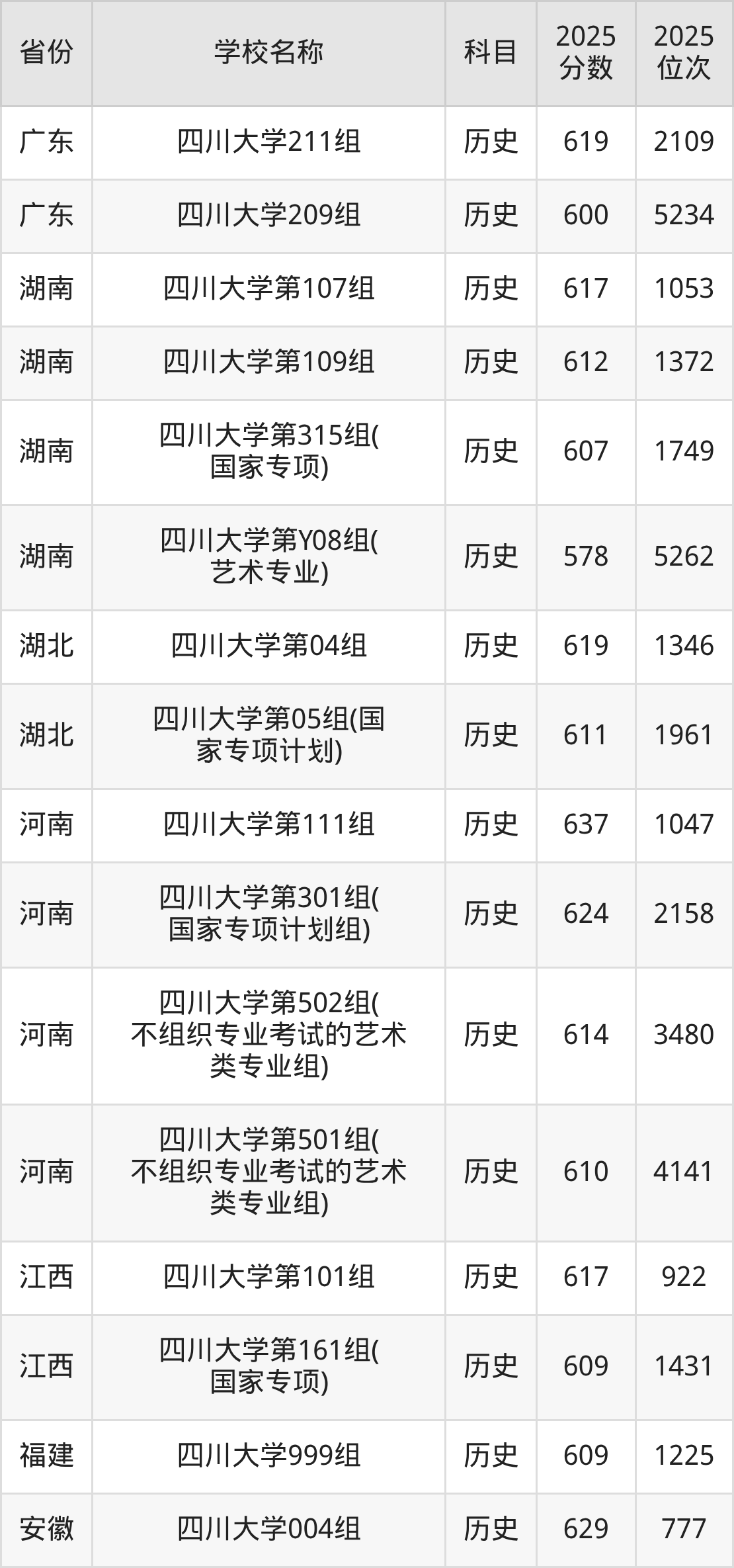 四川大学2025年有6个专业组面向四川省内首选了历史科目的考生招生: