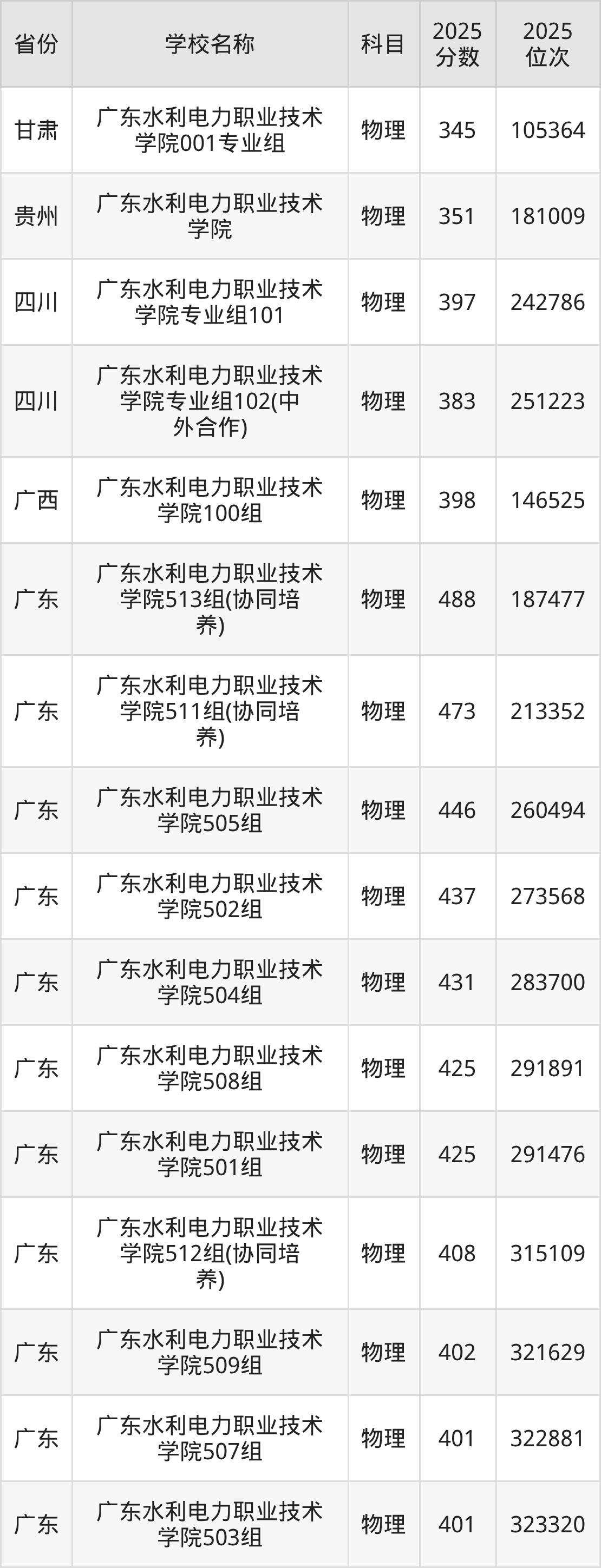 2025年广东水利电力职业技术学院在全国各省专科的最低录取分数线在149~488分之间。广东物理类高考生最低488分能上广东水利电力职业技术学院、江西物理类高考生最低429分能上广东水利电力职业技术学院……下文将展示广东水利电力职业技术学院在全国11个高考省份中的专科最低投档录取分汇总!