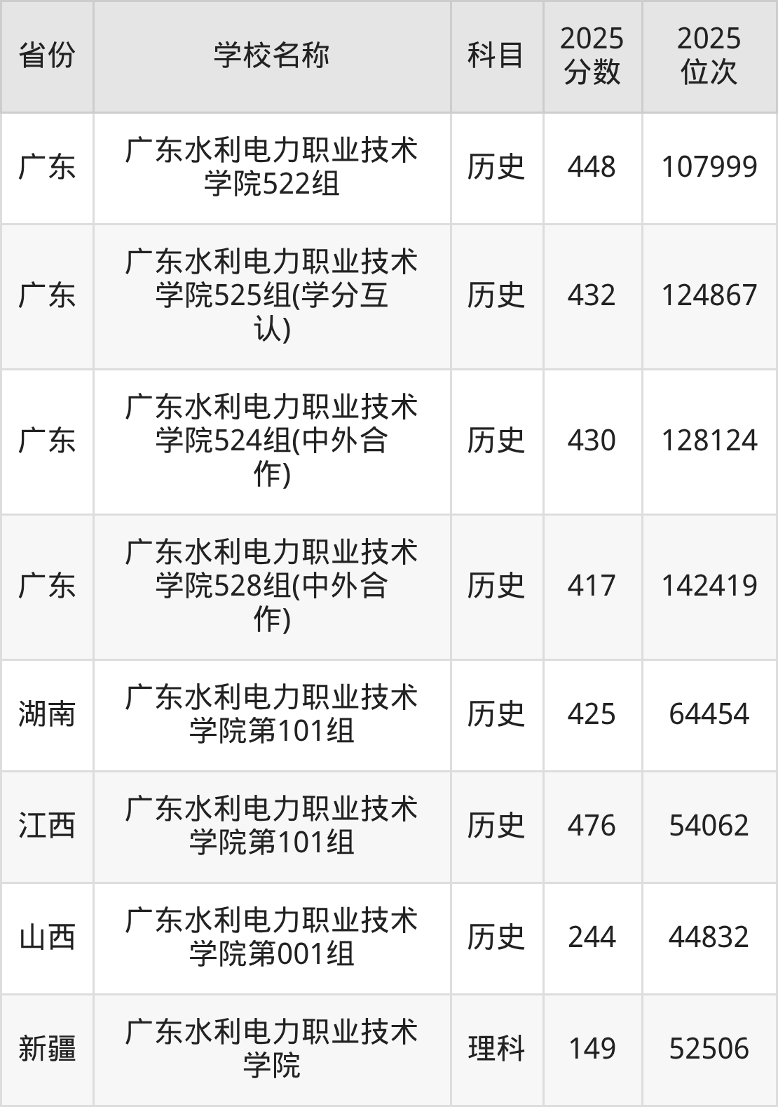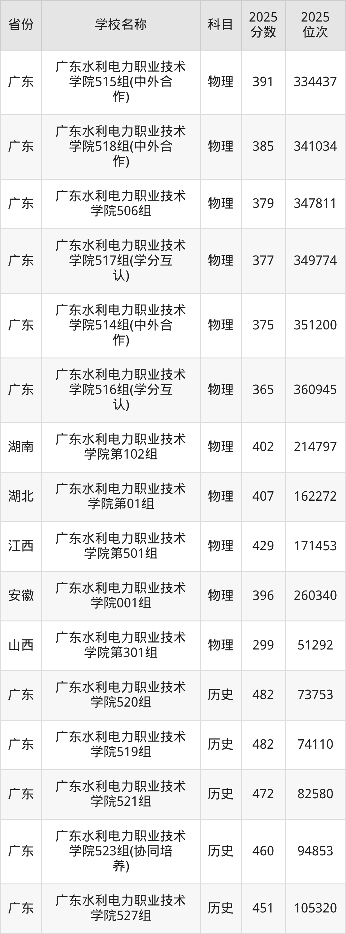 广东水利电力职业技术学院2025年有9个专业组面向广东省内首选了历史科目的考生招生:
