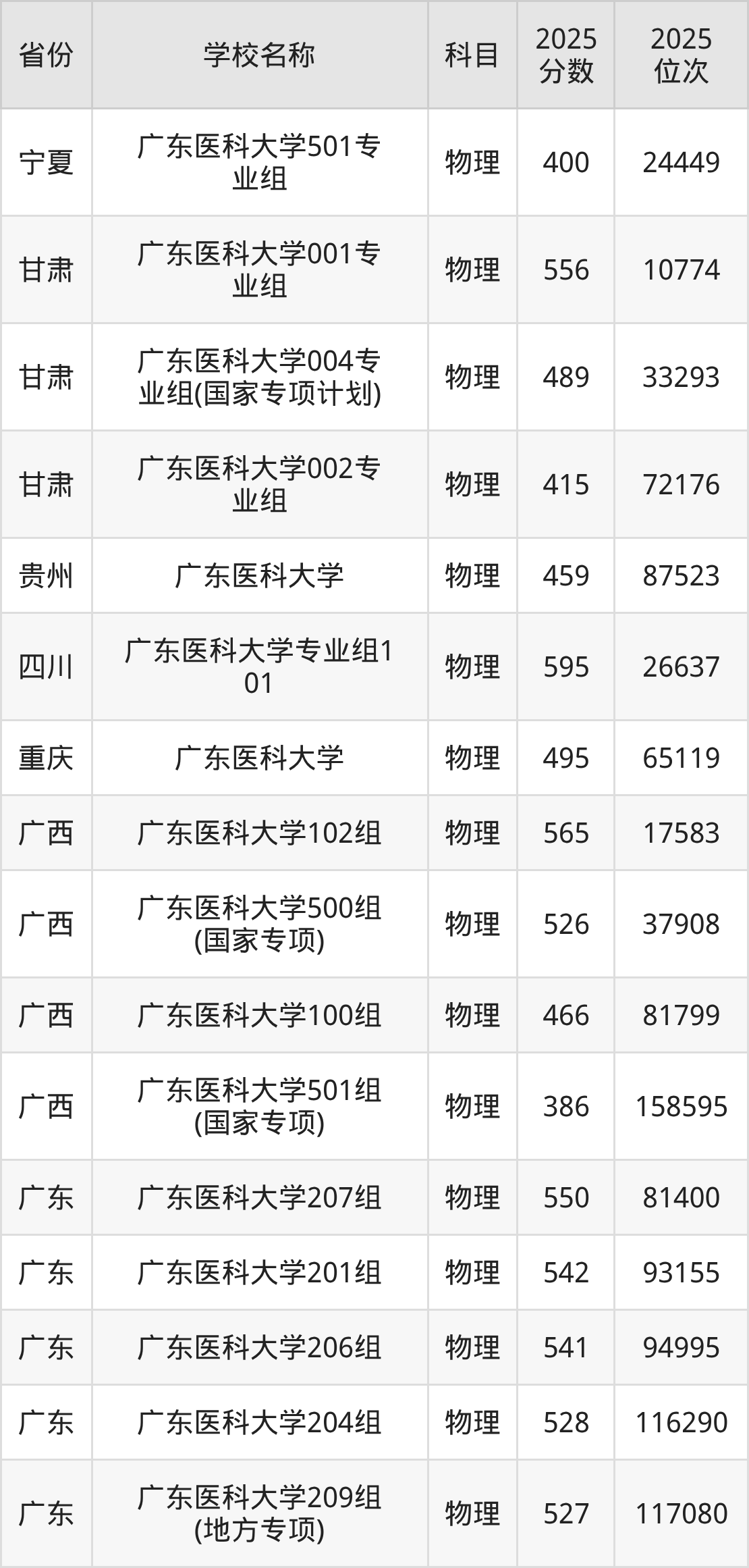 二、广东医科大学各专业录取分数线