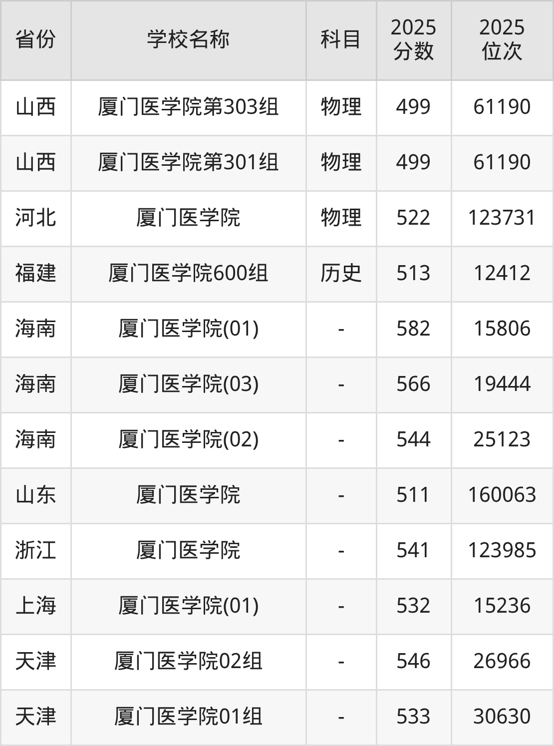 二、厦门医学院各专业录取分数线