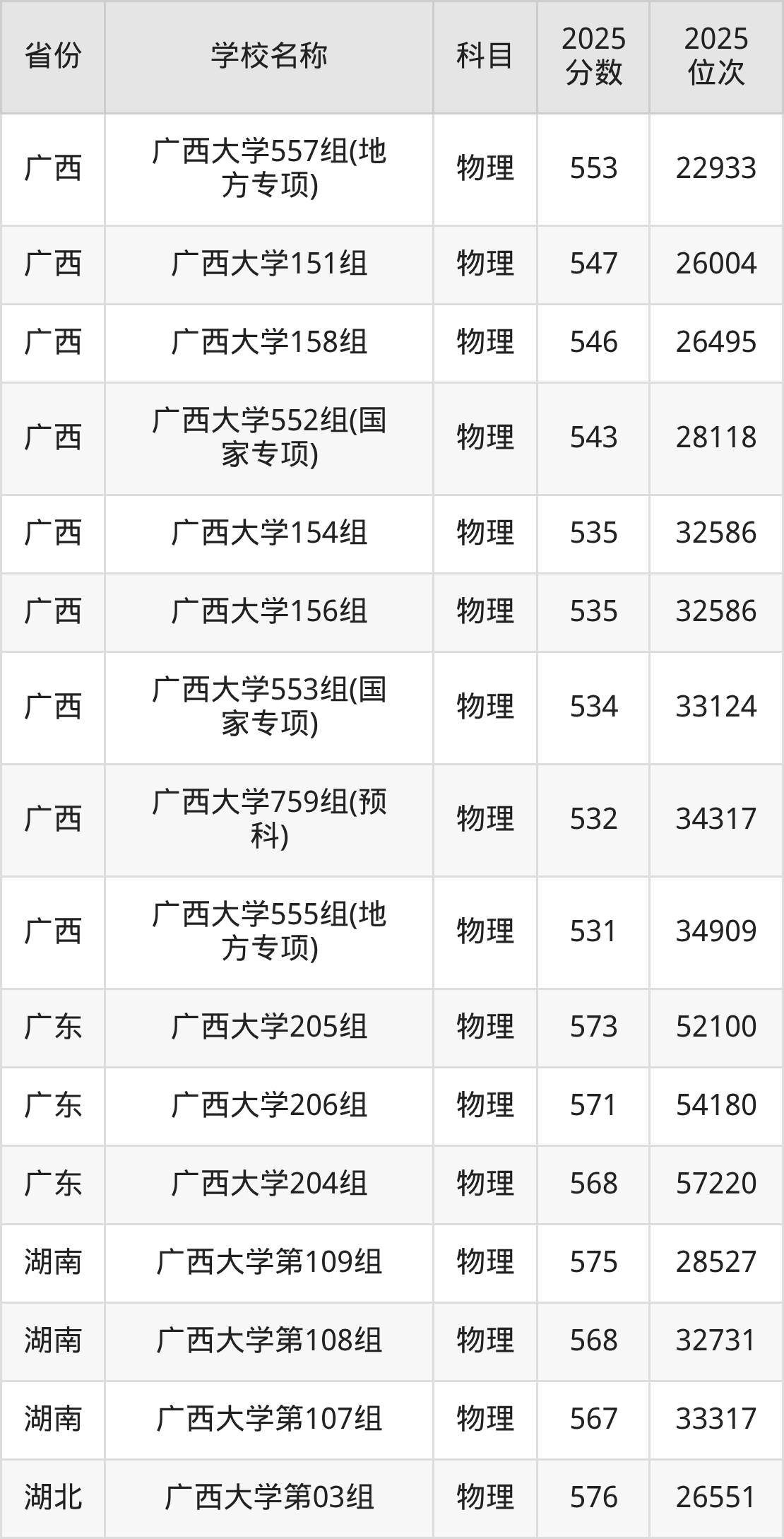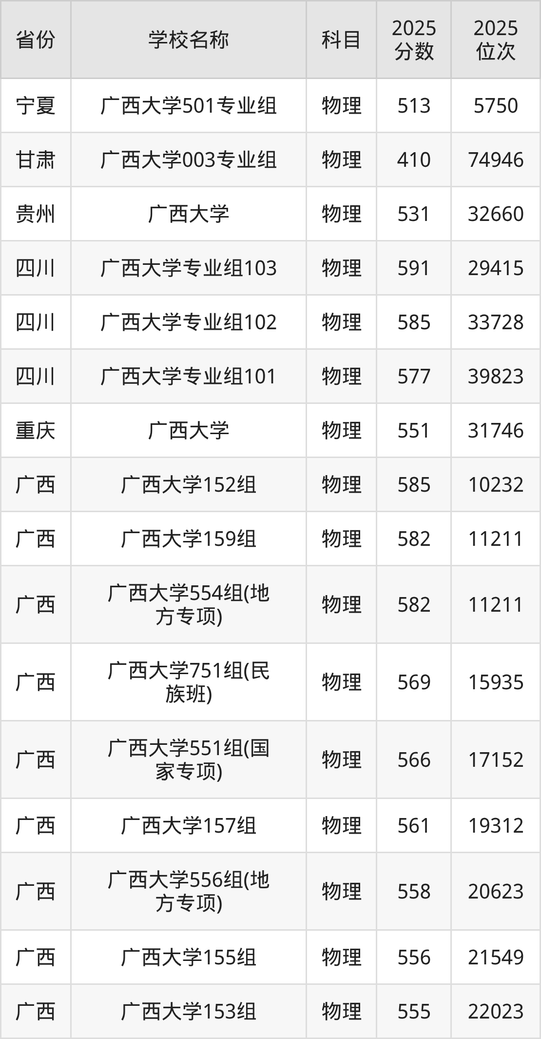 广西大学2025年有18个专业组面向广西壮族自治区内首选了物理科目的考生招生: