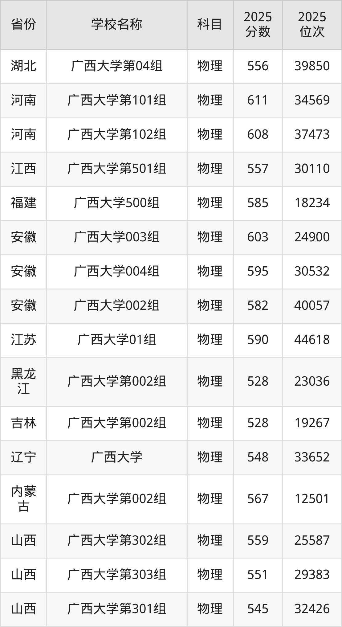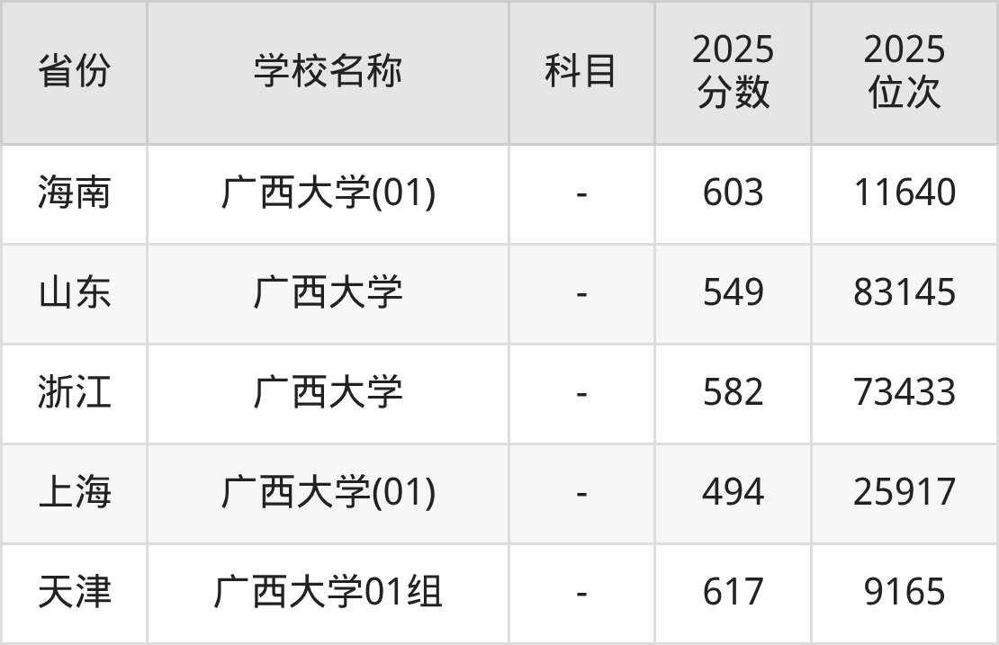 2025年广西大学在全国各省本科的最低录取分数线在410~617分之间。天津高考生最低617分能上广西大学、河南物理类高考生最低611分能上广西大学……下文将展示广西大学在全国26个高考省份中的本科最低投档录取分汇总!