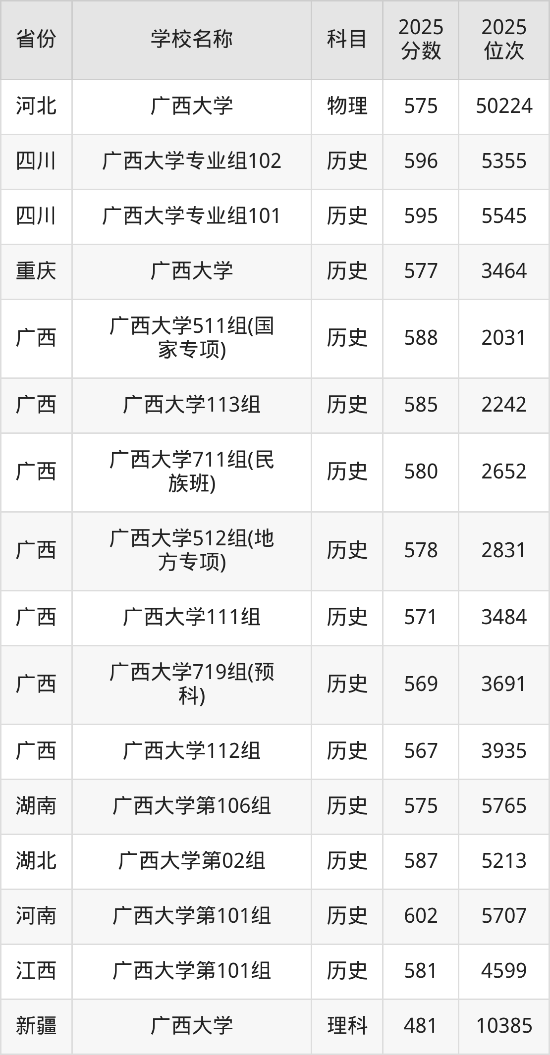 广西大学2025年有7个专业组面向广西壮族自治区内首选了历史科目的考生招生: