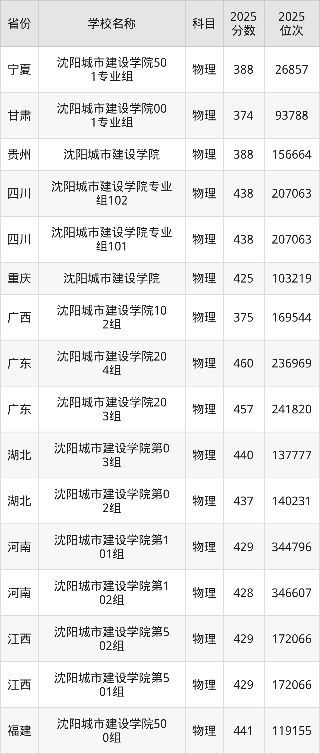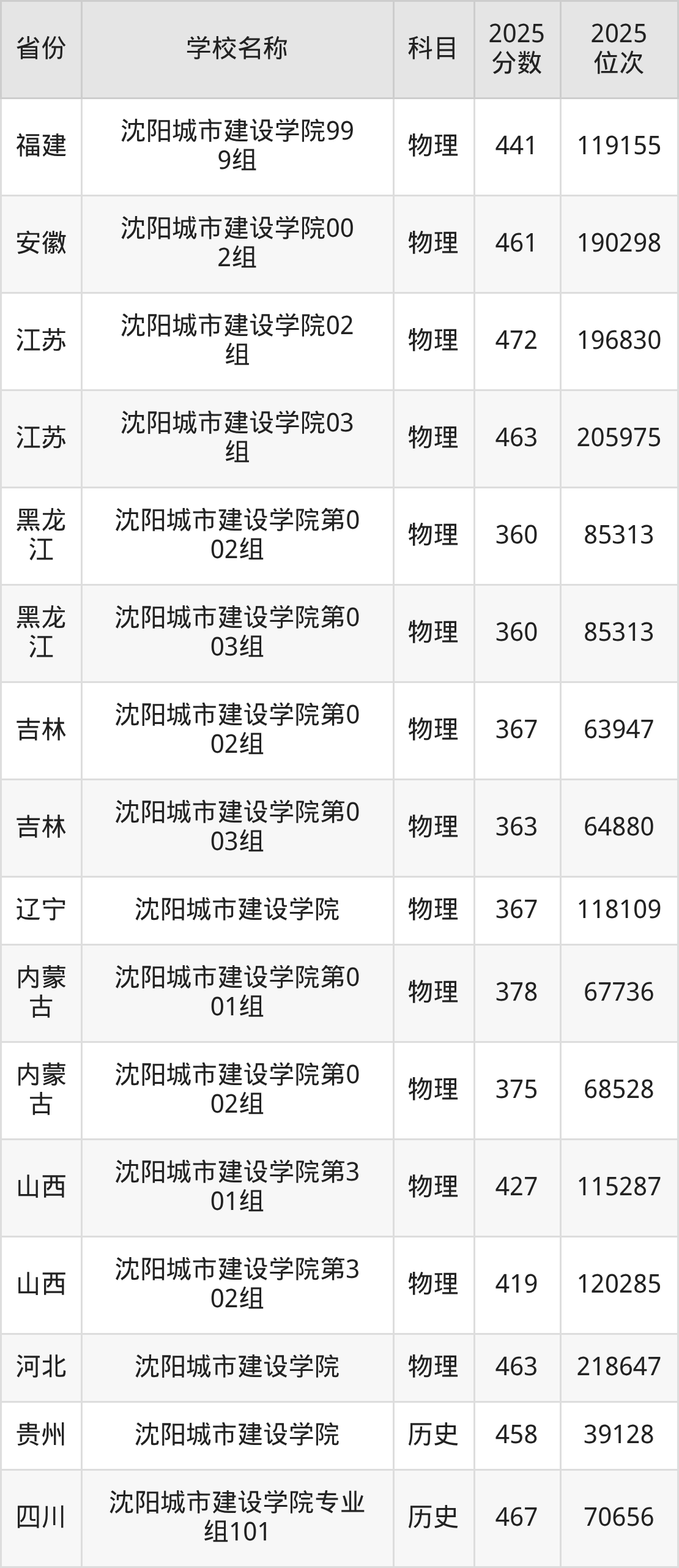 二、沈阳城市建设学院各专业录取分数线