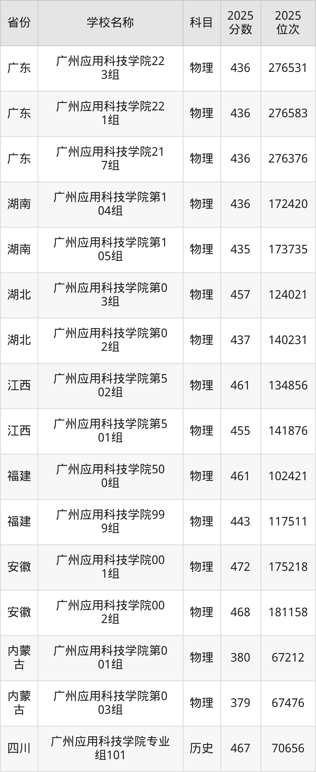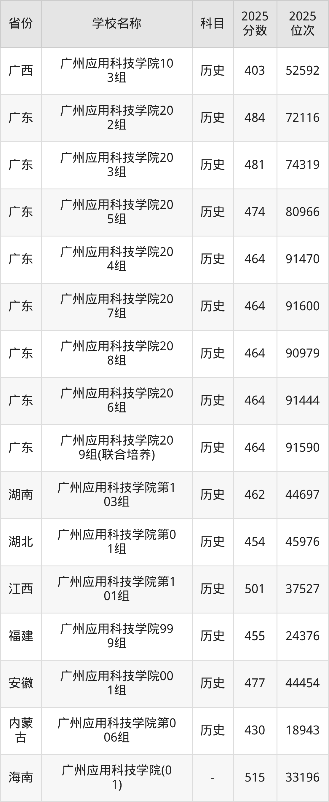 再看广东高考2025年本科批次线,历史类是464分、物理类是436分。通过对比发现:广州应用科技学院2025年历史类最低分与本科线相等,物理类最低分与本科线相等。2026届广东高考生,可通过每一次模考划线,来判断自己的成绩是否有机会被广州应用科技学院录取。