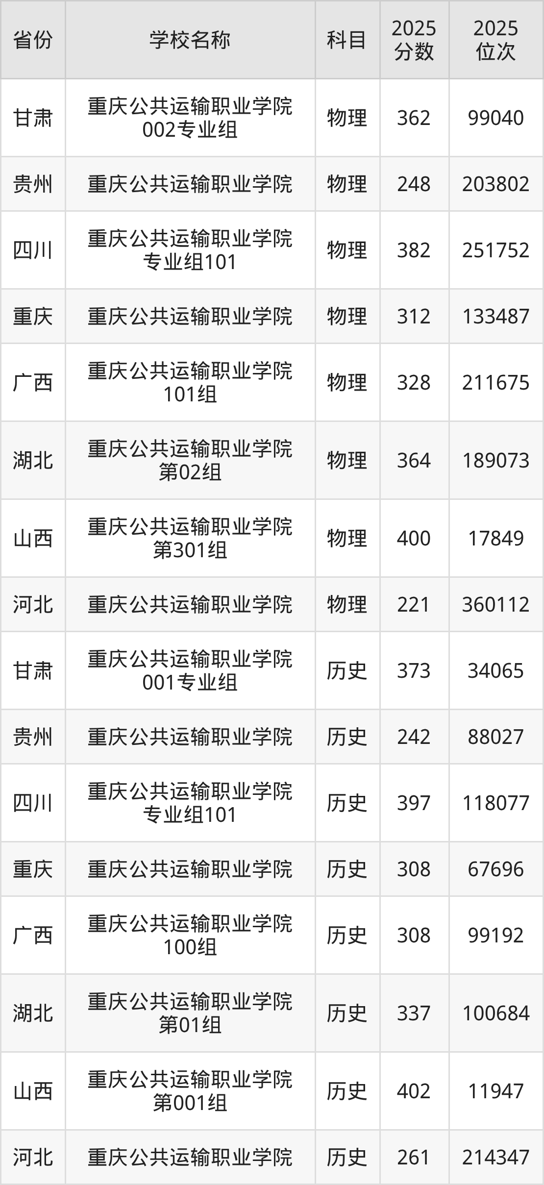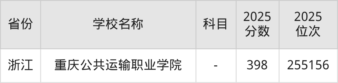 2025年重庆公共运输职业学院在全国各省专科的最低录取分数线在221~402分之间。山西物理类高考生最低400分能上重庆公共运输职业学院、浙江高考生最低398分能上重庆公共运输职业学院……下文将展示重庆公共运输职业学院在全国9个高考省份中的专科最低投档录取分汇总!