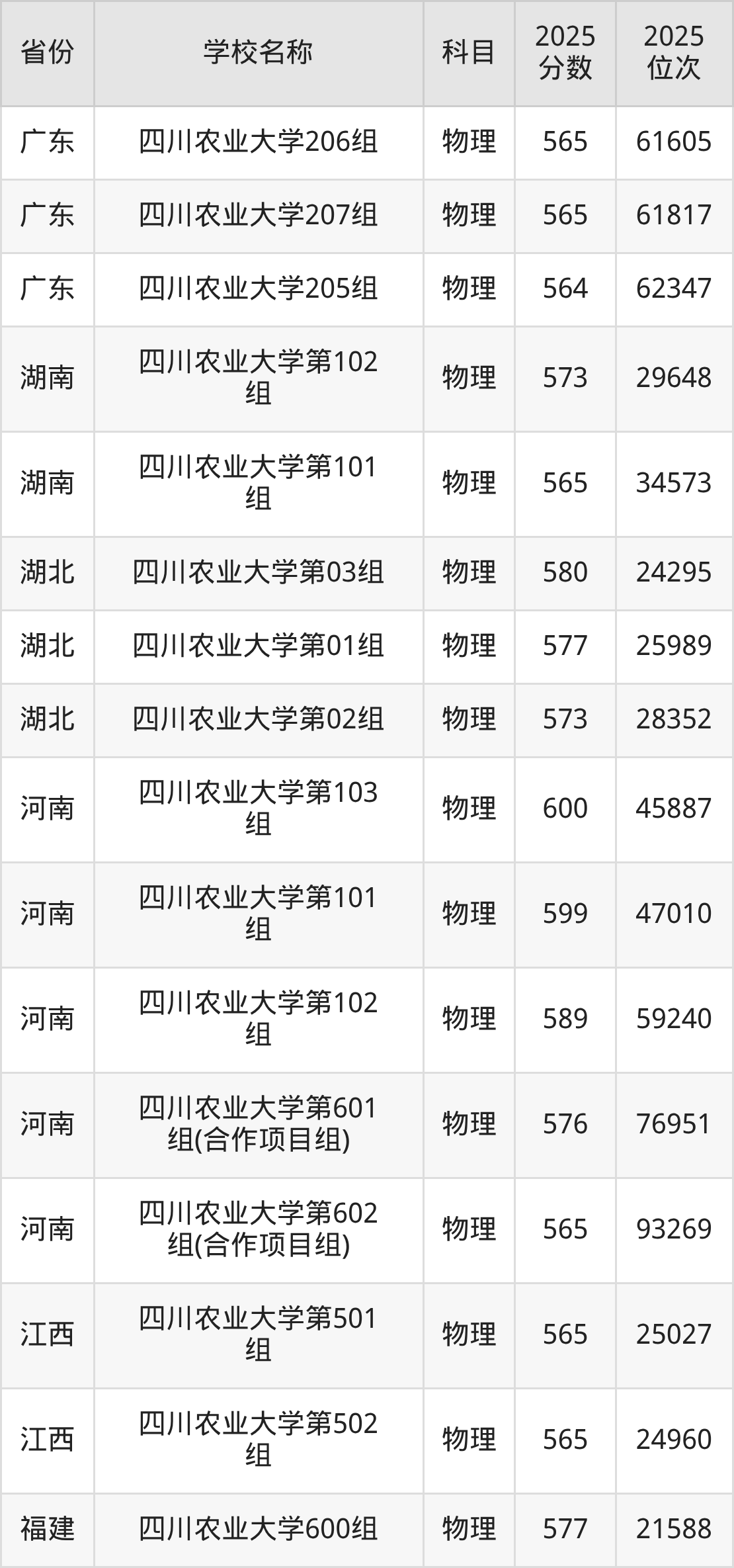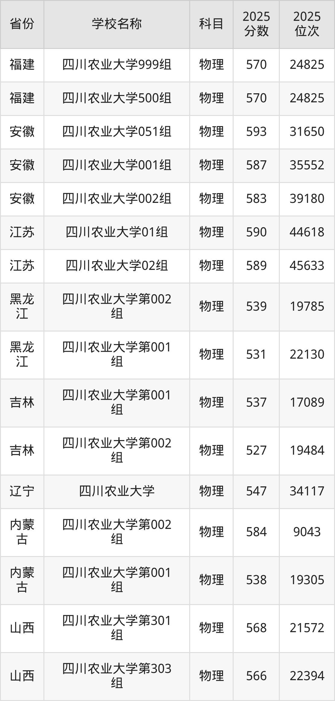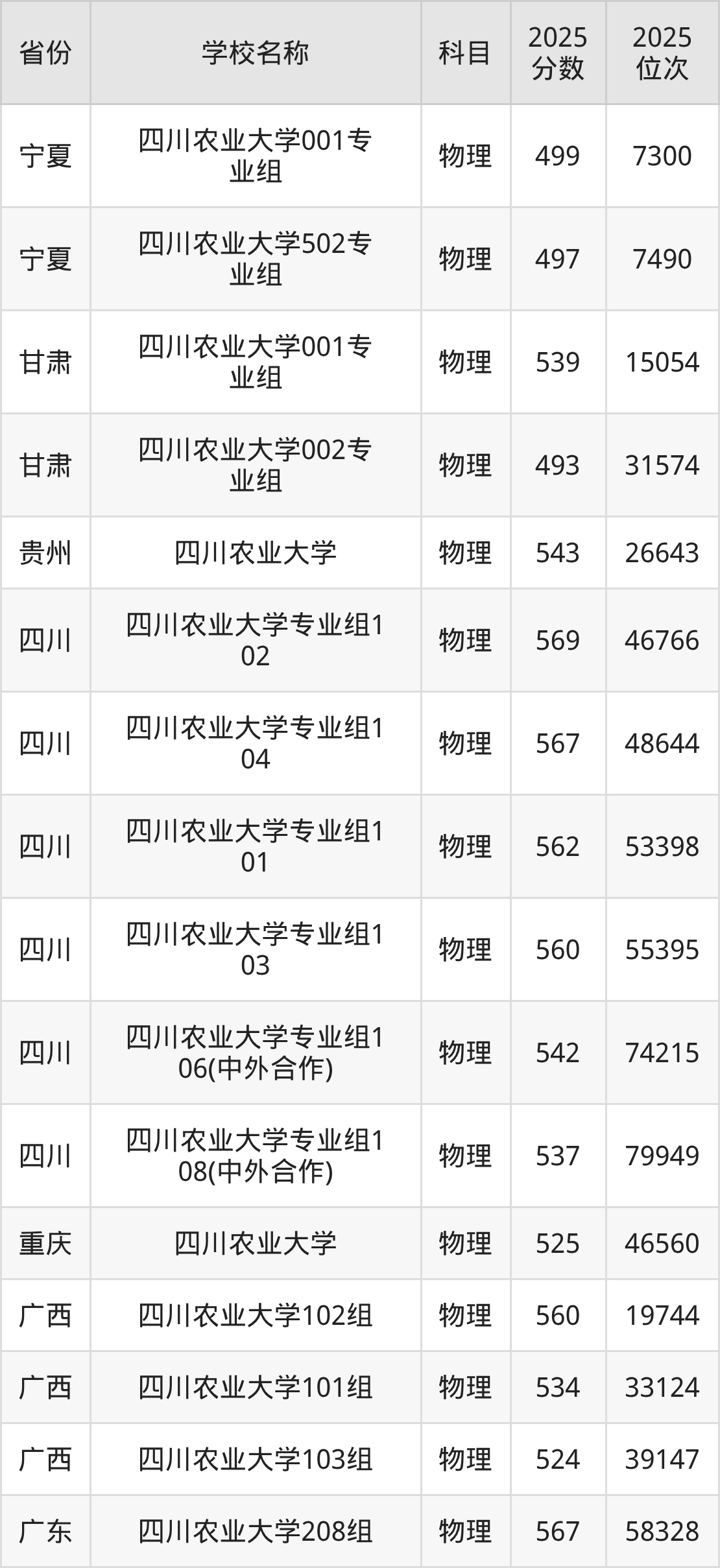 四川农业大学2025年有25个专业组面向四川省内首选了物理科目的考生招生: