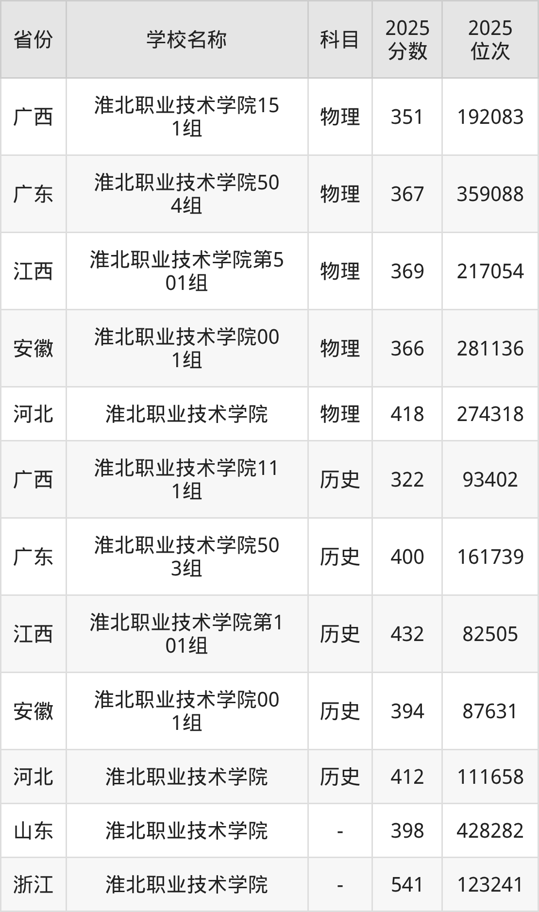再看安徽高考2025年专科批次线,历史类是200分、物理类是200分。通过对比发现:淮北职业技术学院2025年历史类最低分比专科线高194分,物理类最低分比专科线高166分。2026届安徽高考生,可通过每一次模考划线,来判断自己的成绩是否有机会被淮北职业技术学院录取。