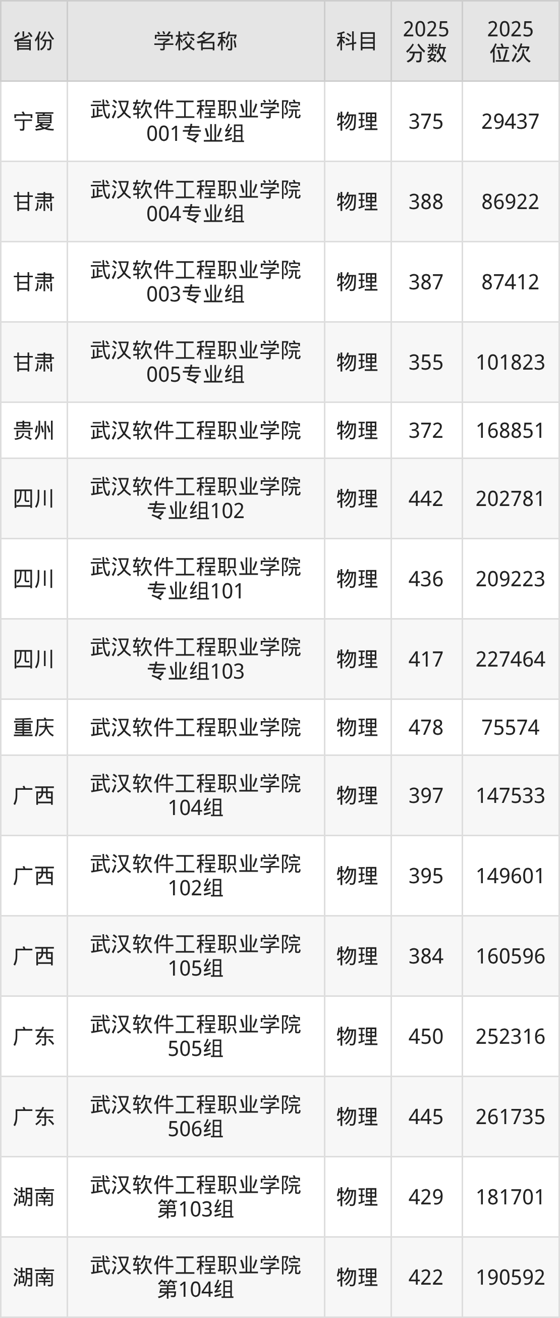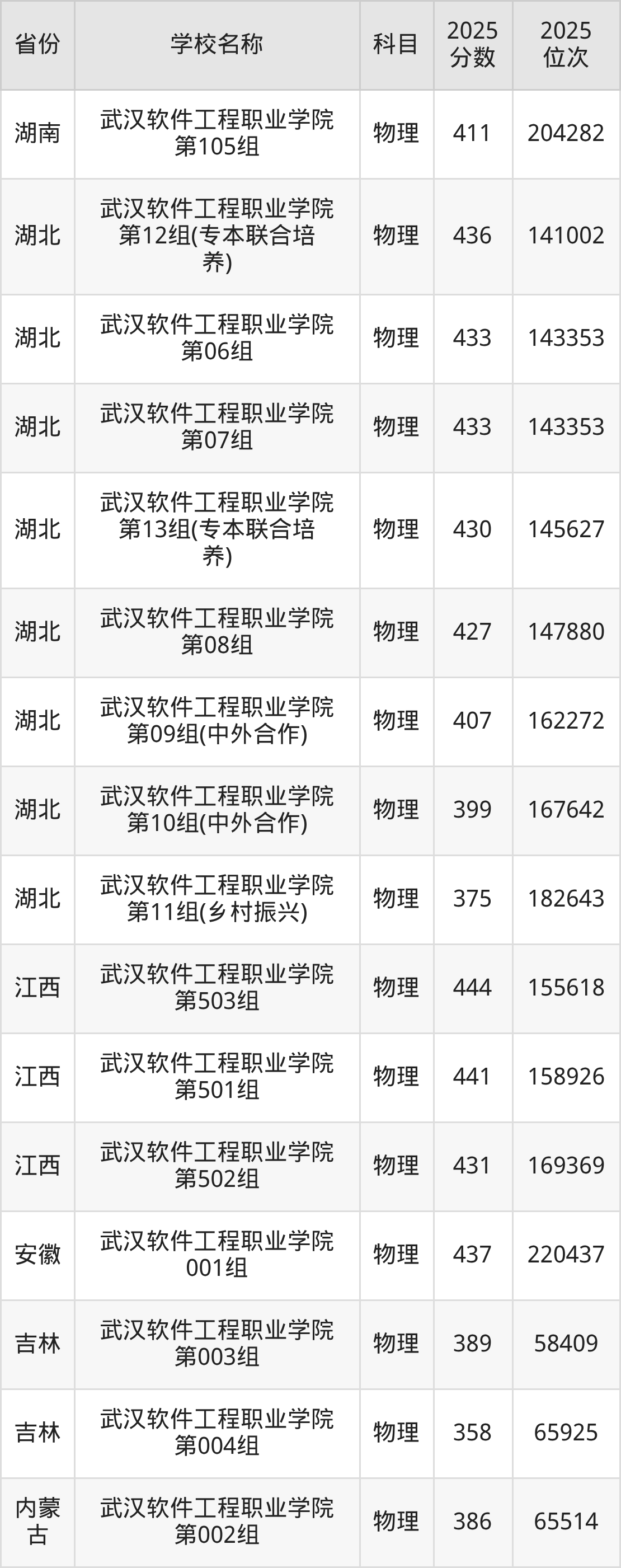 武汉软件工程职业学院2025年有8个专业组面向湖北省内首选了物理科目的考生招生: