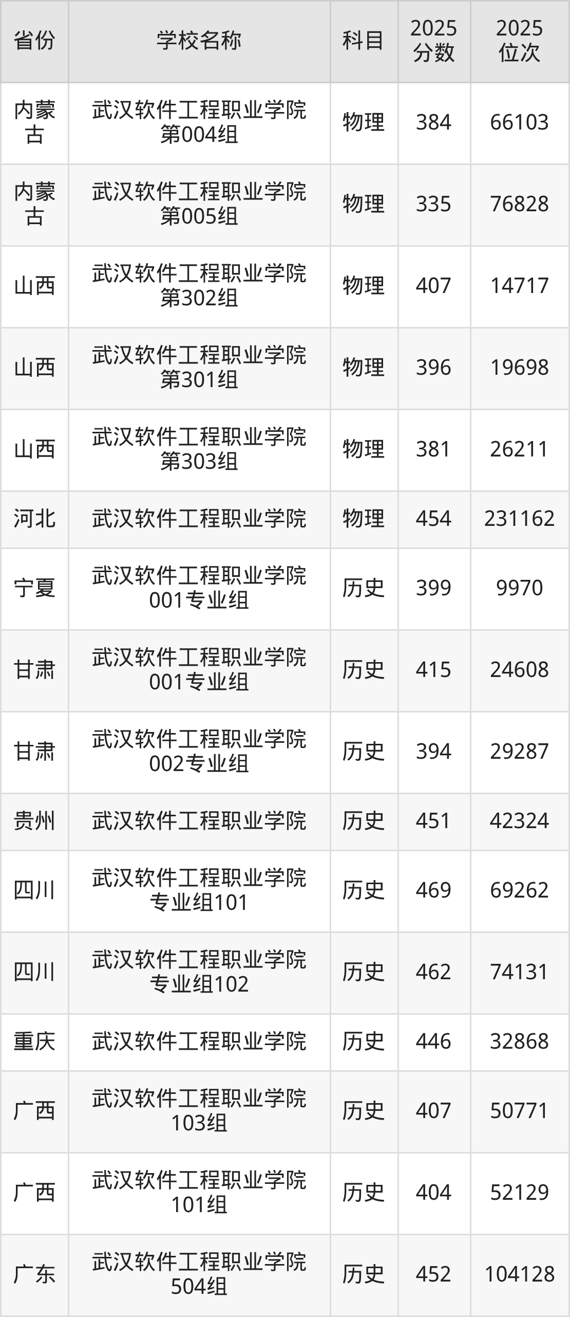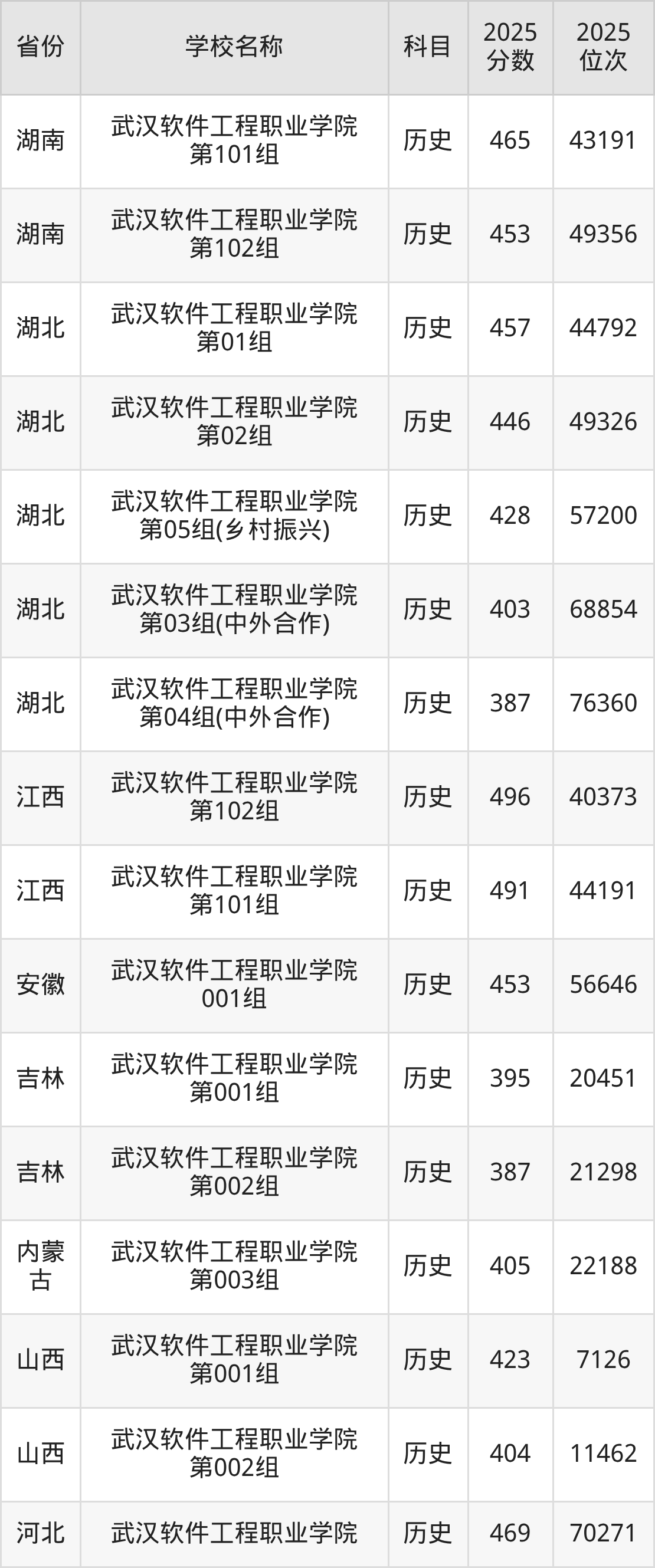 二、武汉软件工程职业学院各专业录取分数线