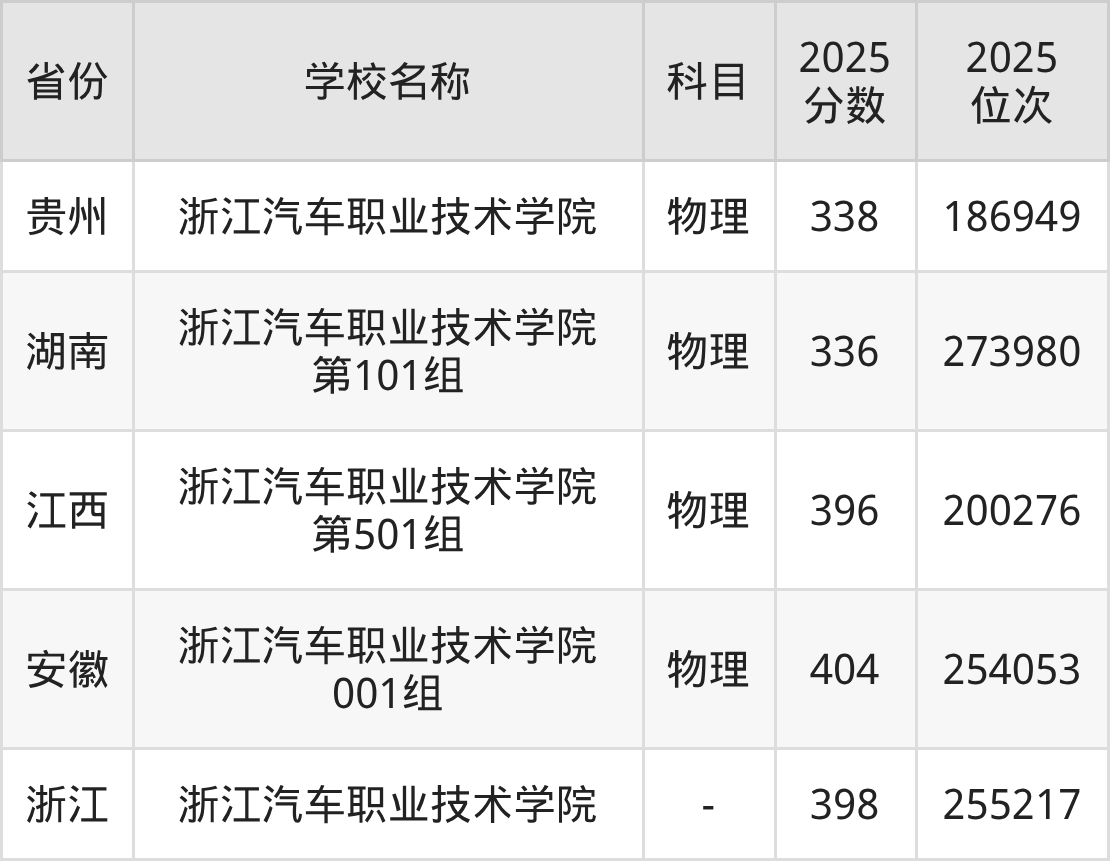 2025年浙江汽车职业技术学院在全国各省专科的最低录取分数线在336~404分之间。安徽物理类高考生最低404分能上浙江汽车职业技术学院、浙江高考生最低398分能上浙江汽车职业技术学院……下文将展示浙江汽车职业技术学院在全国5个高考省份中的专科最低投档录取分汇总!