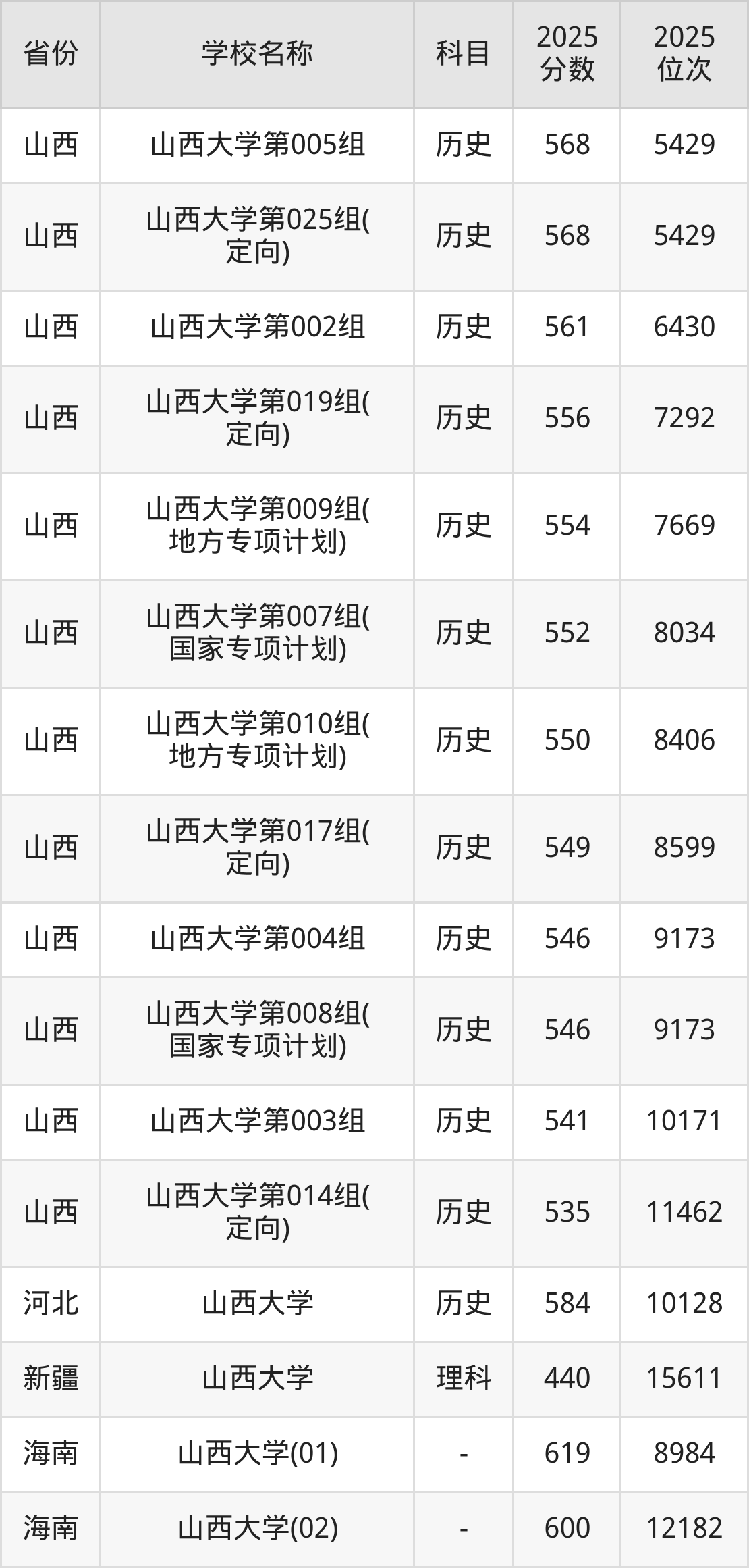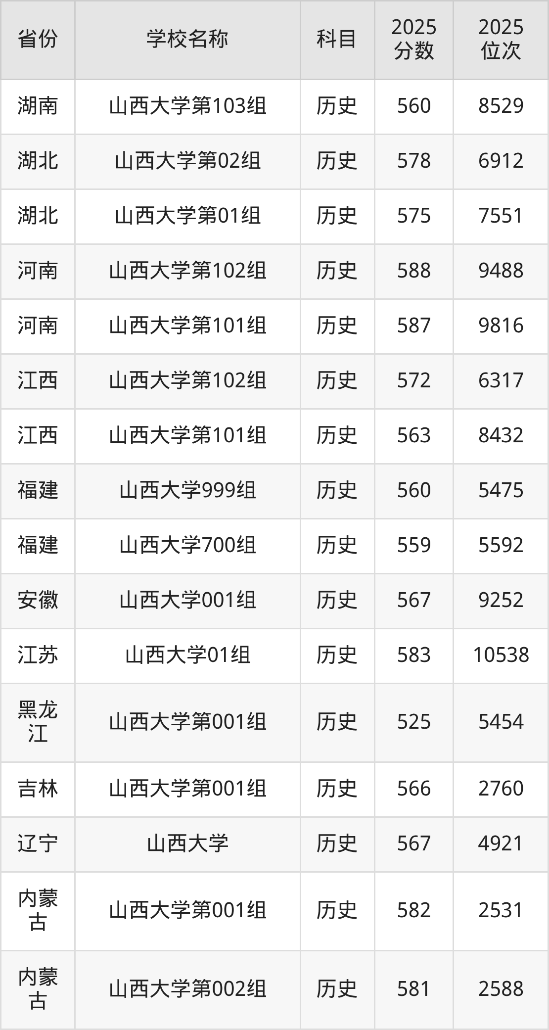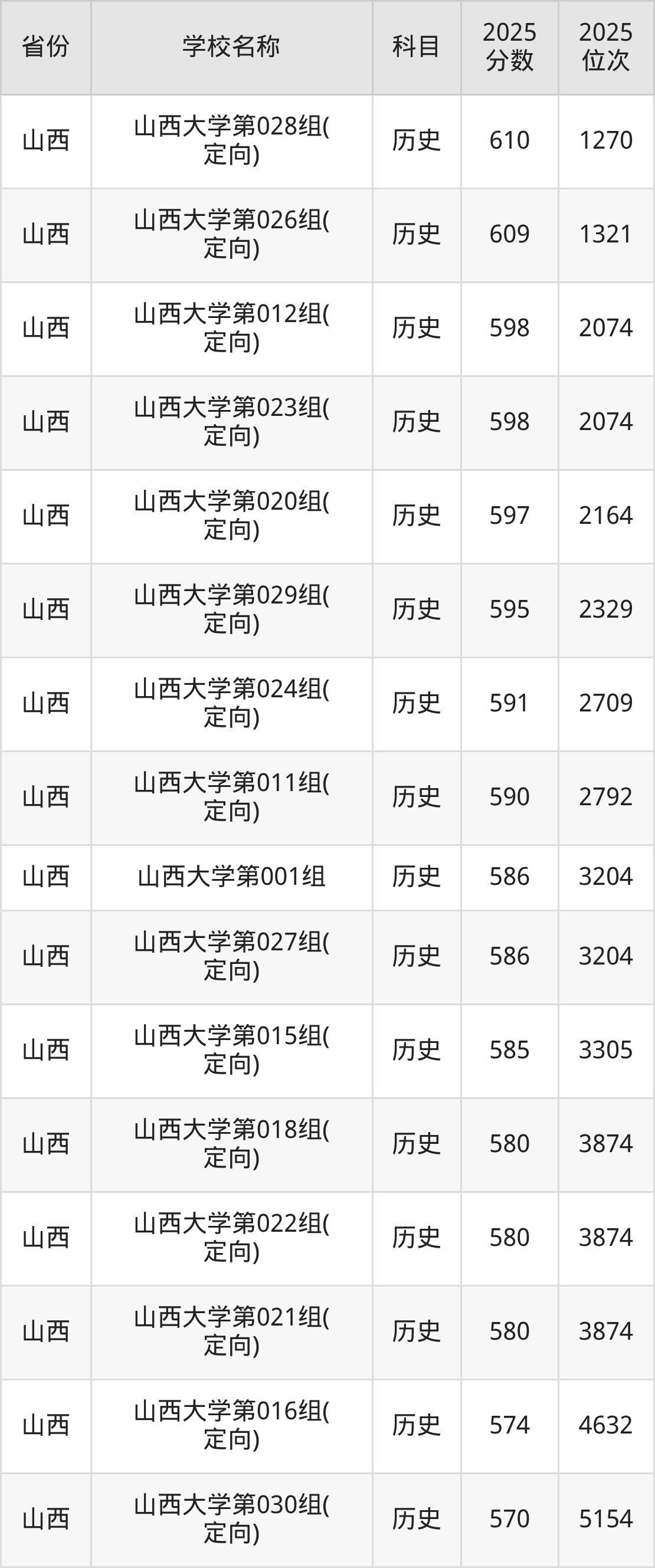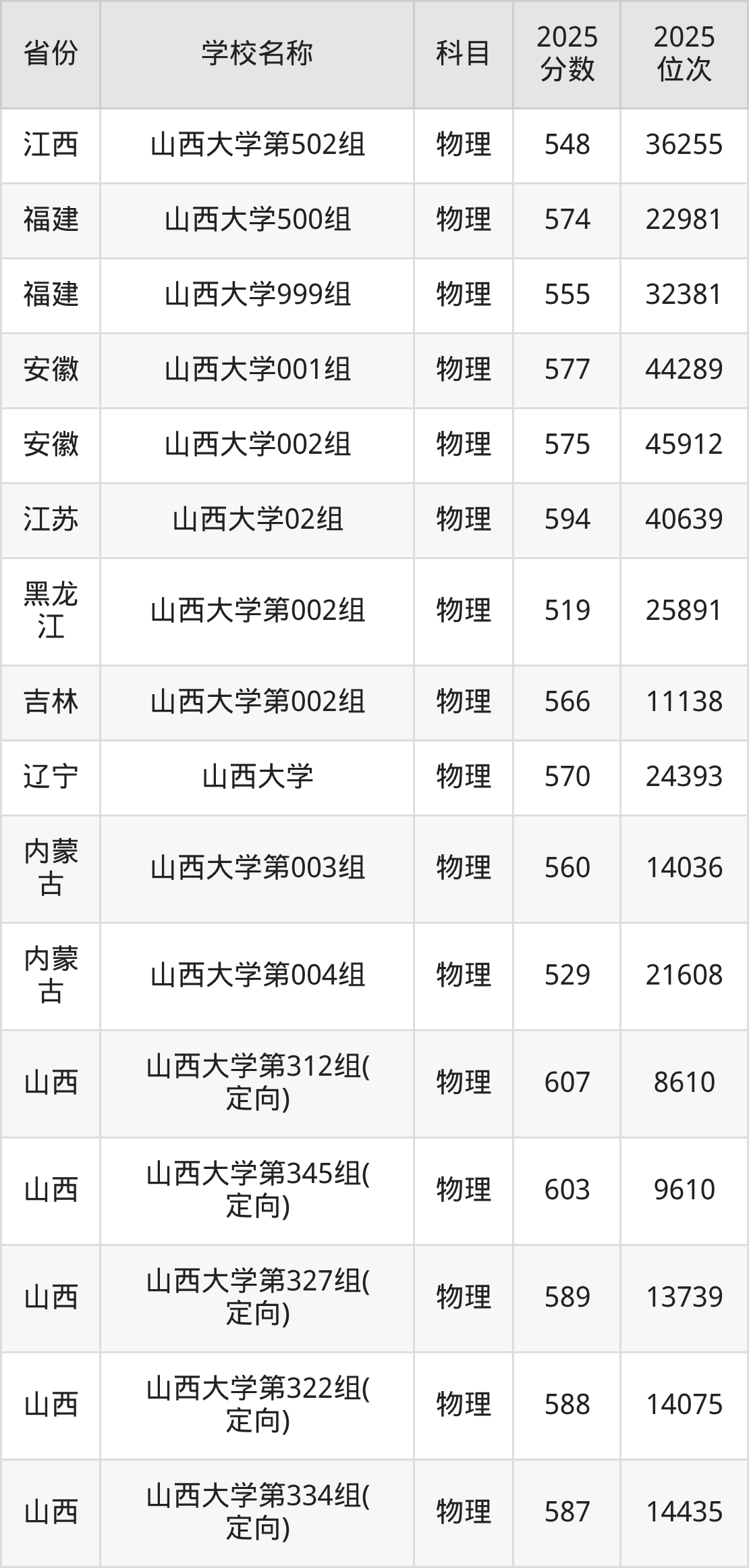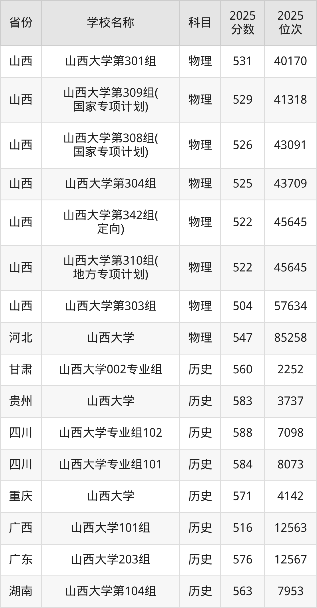 二、山西大学各专业录取分数线