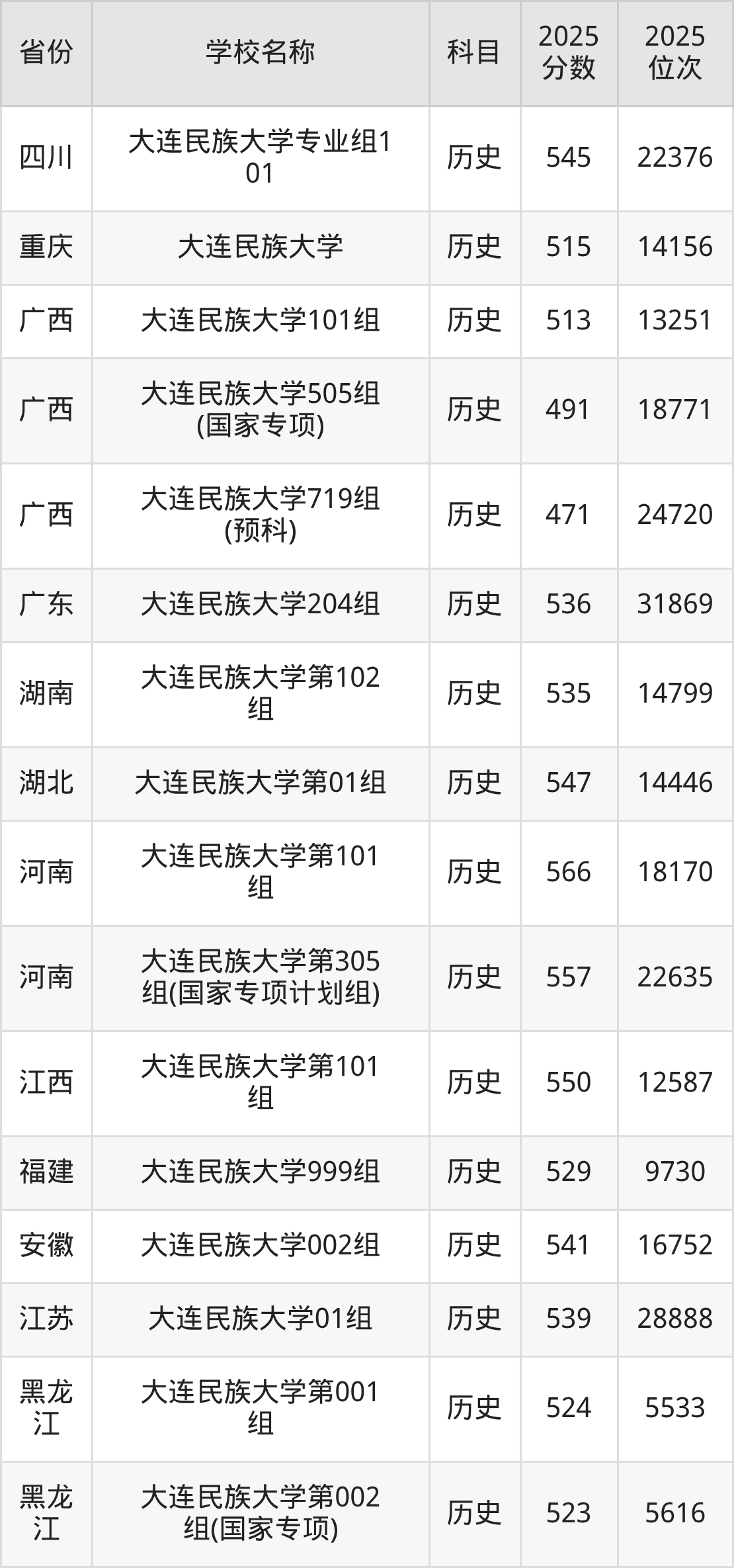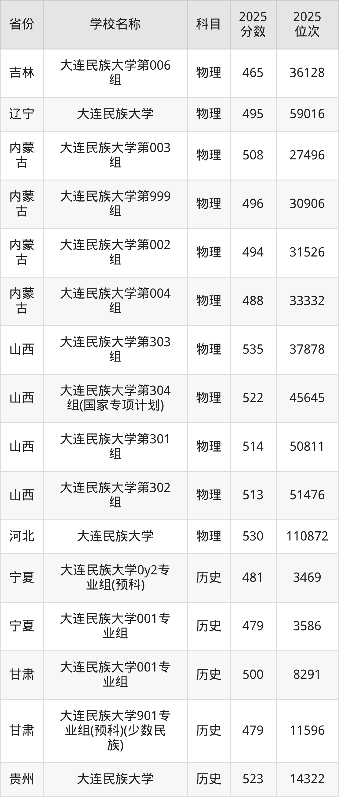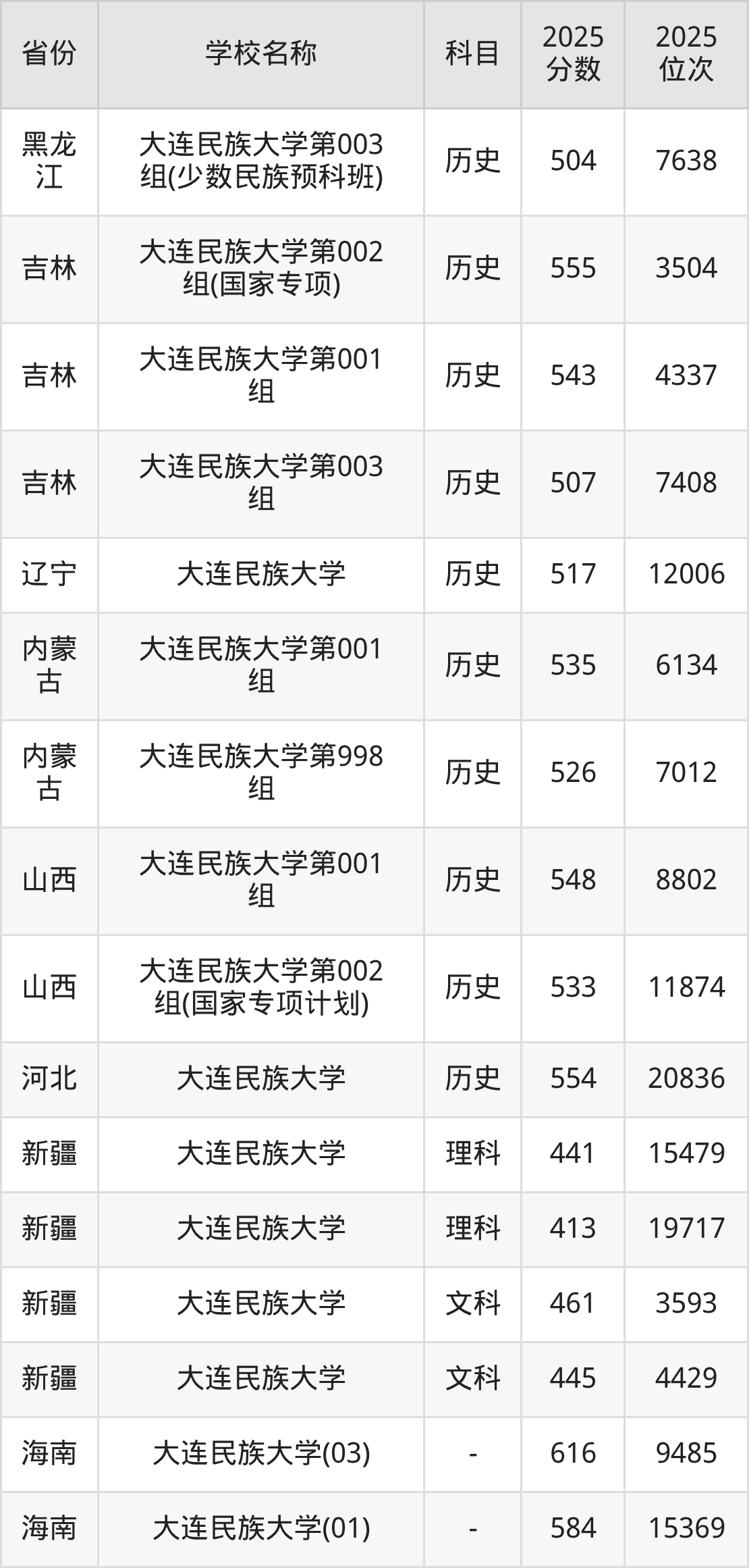 二、大连民族大学各专业录取分数线