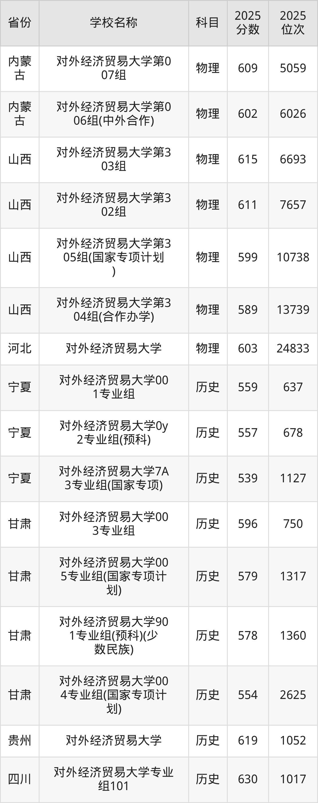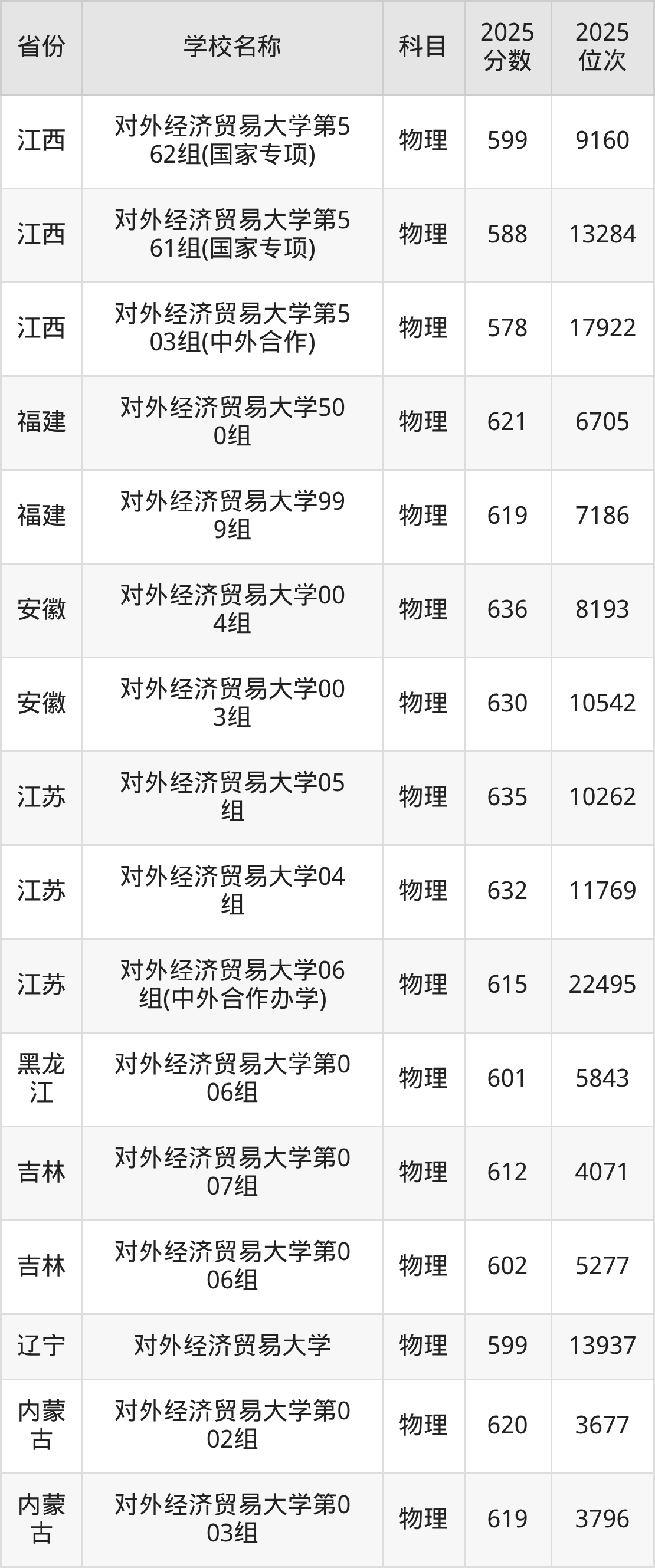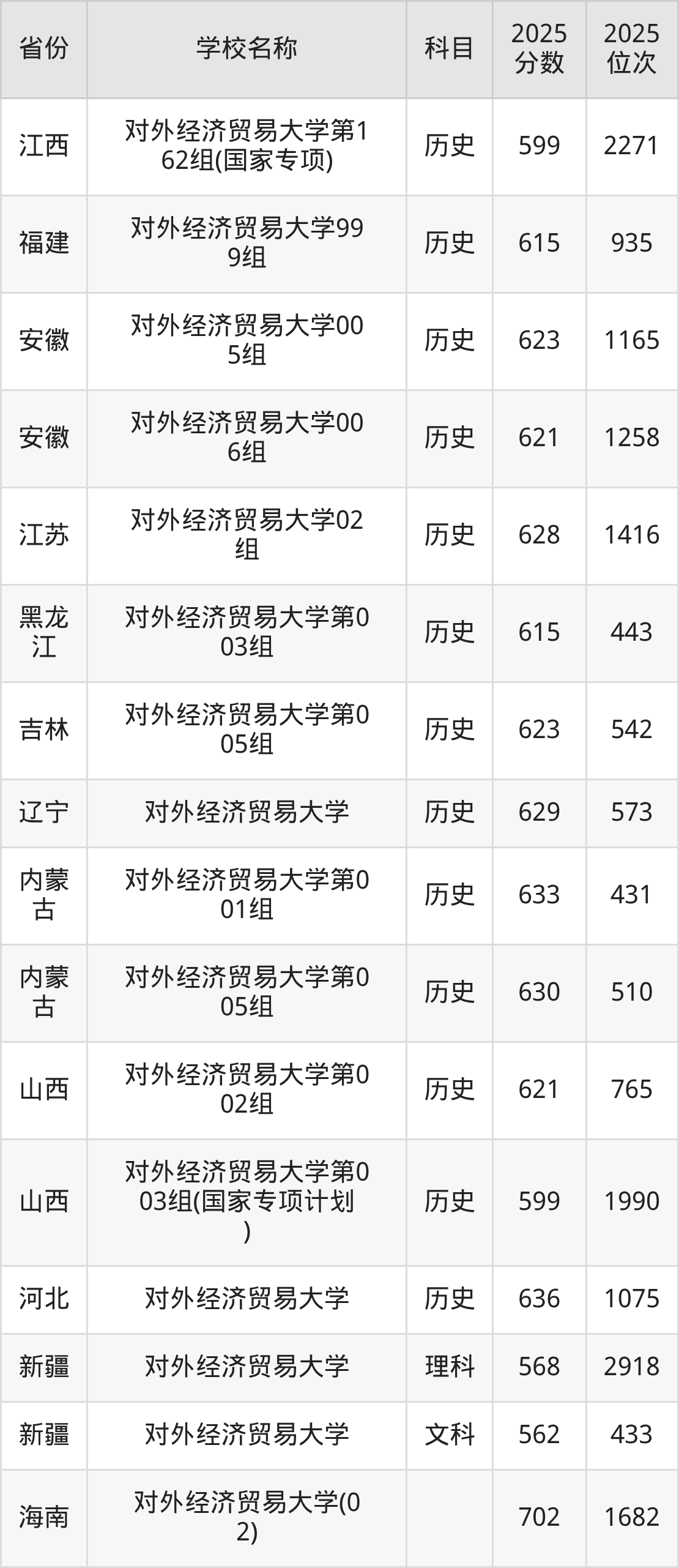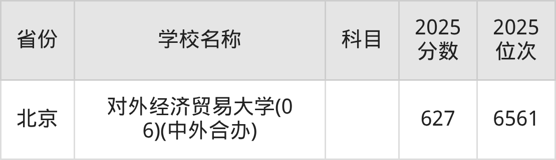 一、2025对外经济贸易大学录取分数线
