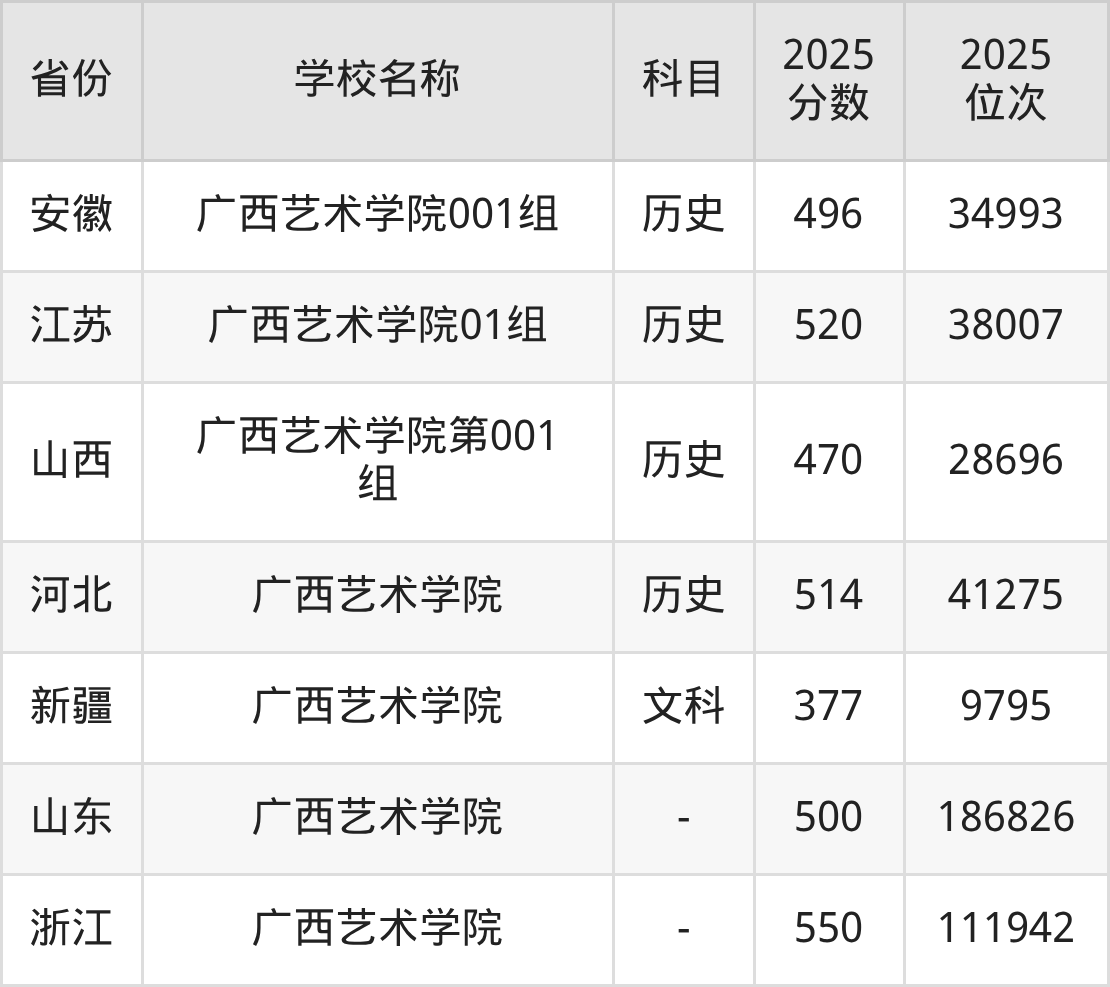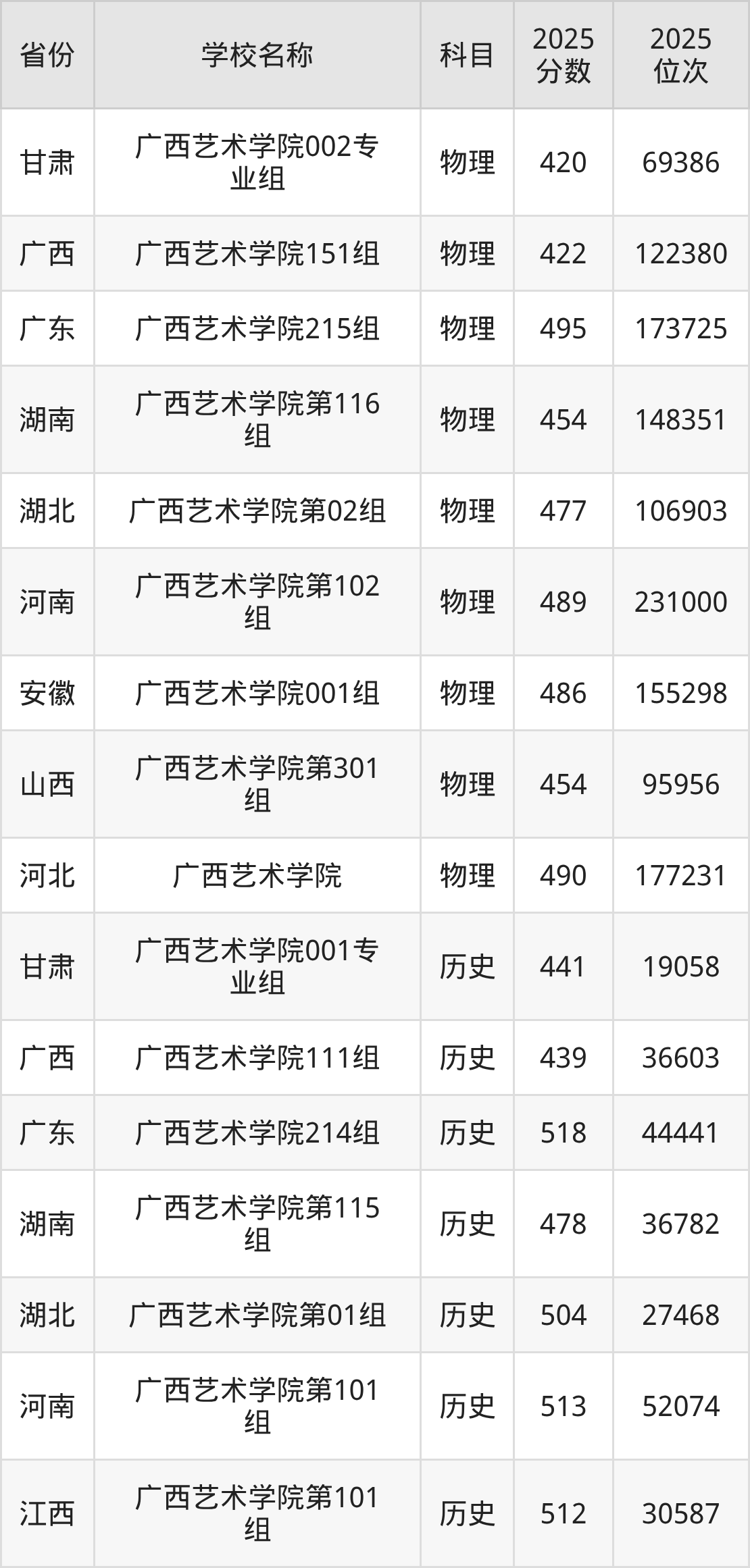 2025年广西艺术学院在全国各省本科的最低录取分数线在377~550分之间。浙江高考生最低550分能上广西艺术学院、江苏历史类高考生最低520分能上广西艺术学院……下文将展示广西艺术学院在全国14个高考省份中的本科最低投档录取分汇总!