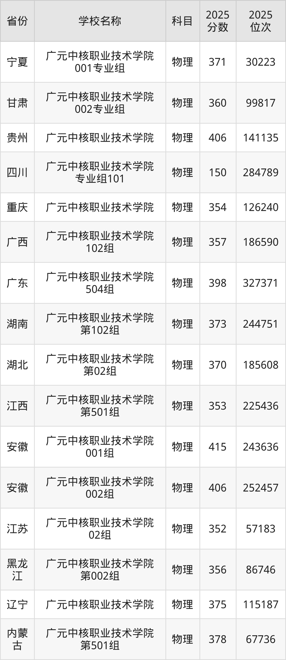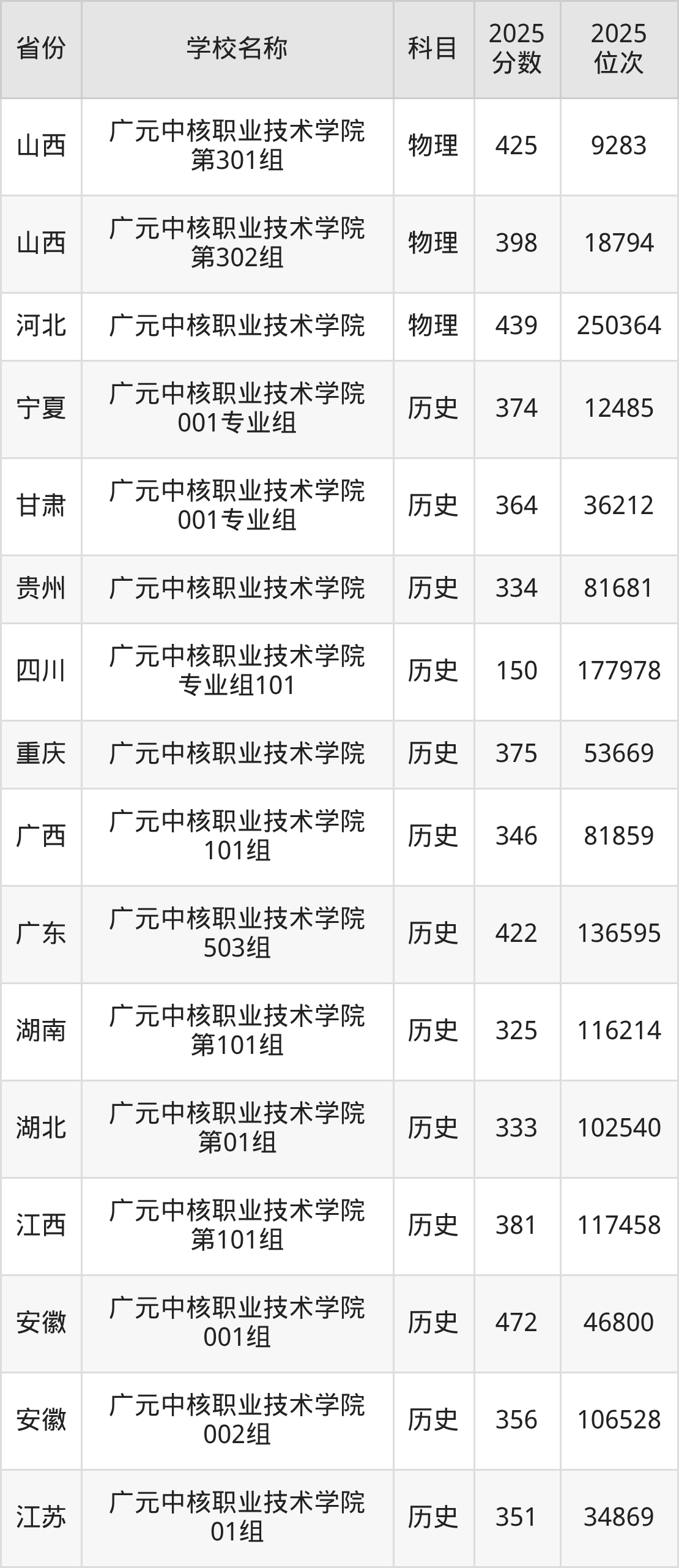 2025年广元中核职业技术学院在全国各省专科的最低录取分数线在150~472分之间。河北物理类高考生最低439分能上广元中核职业技术学院、山西物理类高考生最低425分能上广元中核职业技术学院……下文将展示广元中核职业技术学院在全国19个高考省份中的专科最低投档录取分汇总!