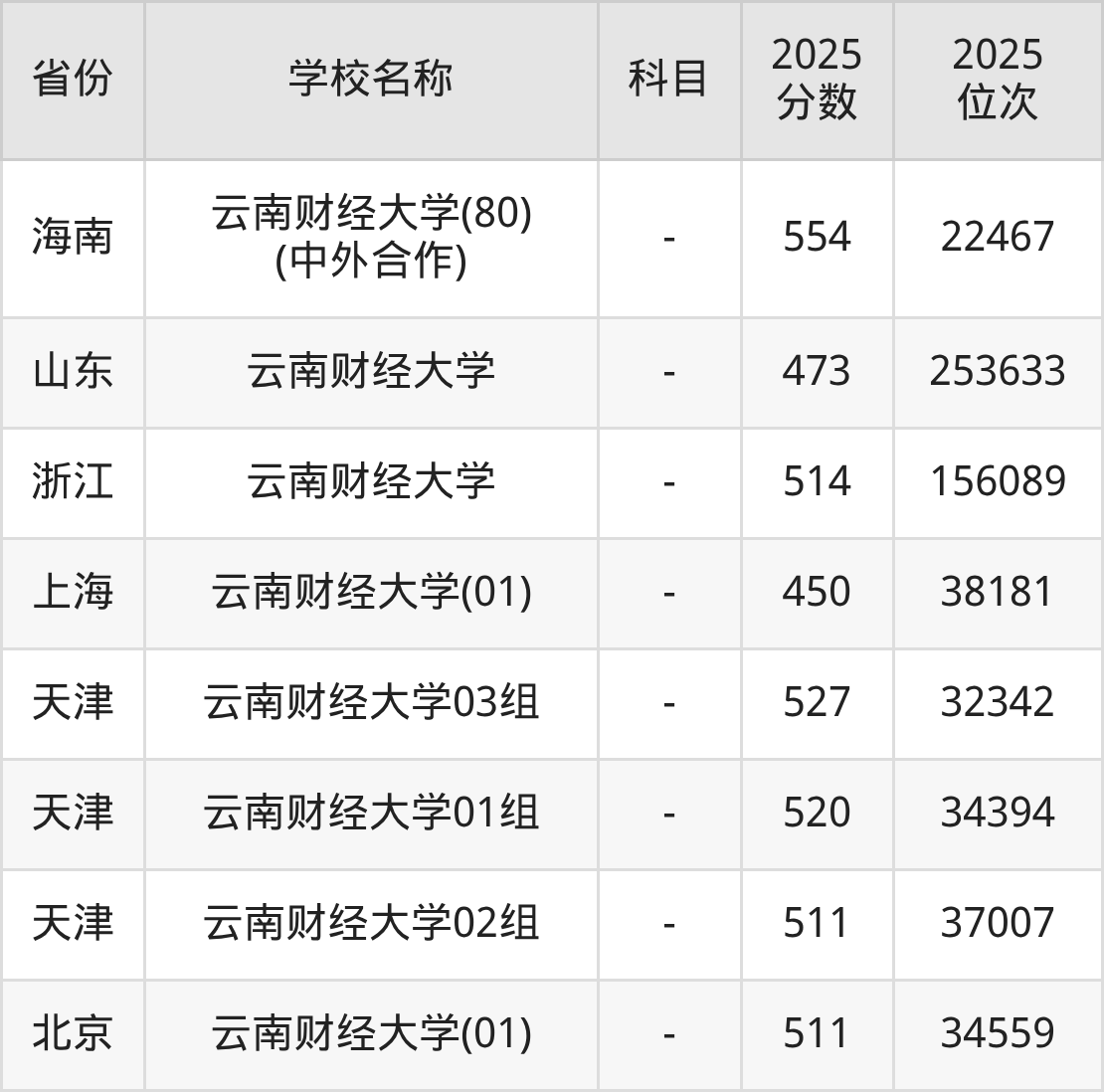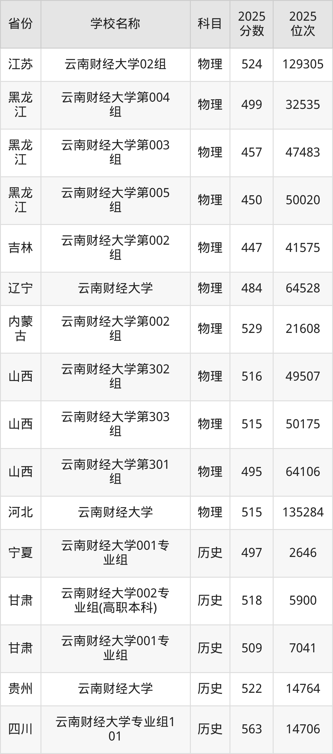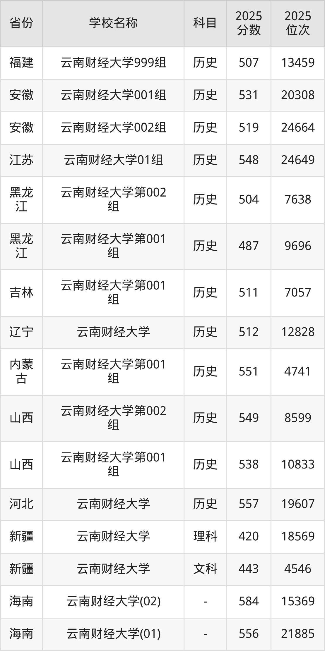 二、云南财经大学各专业录取分数线