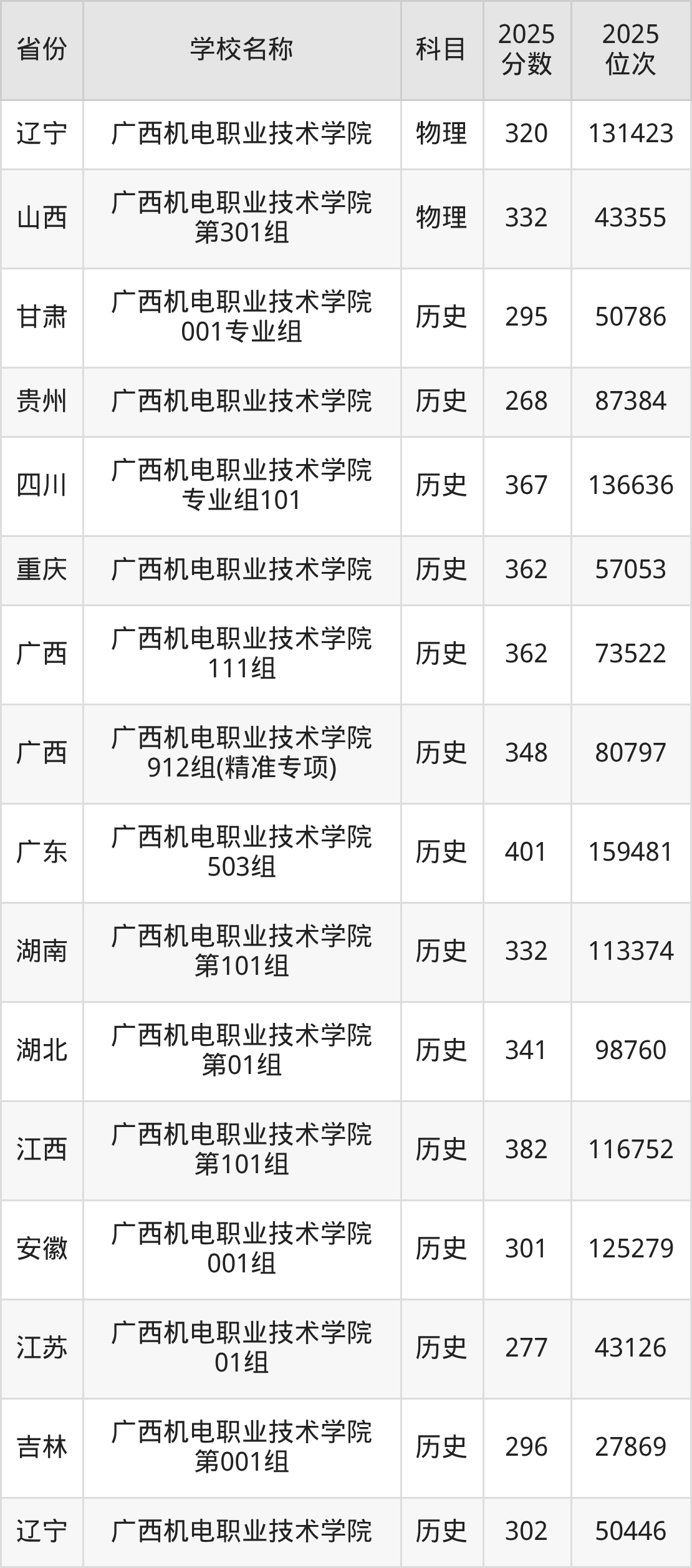 再看广西高考2025年专科批次线,历史类是200分、物理类是200分。通过对比发现:广西机电职业技术学院2025年历史类最低分比专科线高148分,物理类最低分比专科线高150分。2026届广西高考生,可通过每一次模考划线,来判断自己的成绩是否有机会被广西机电职业技术学院录取。