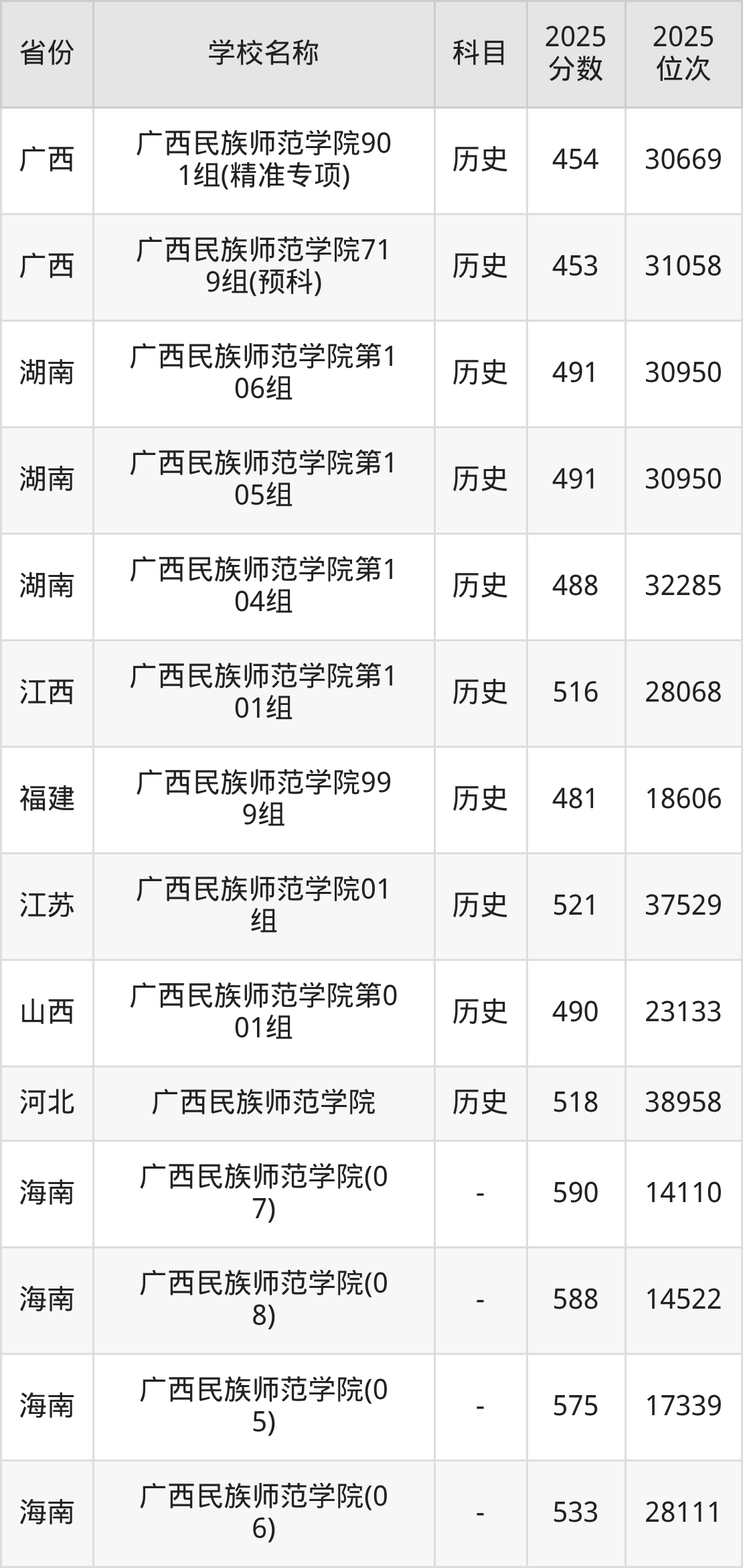 广西民族师范学院2025年有18个专业组面向广西壮族自治区内首选了历史科目的考生招生: