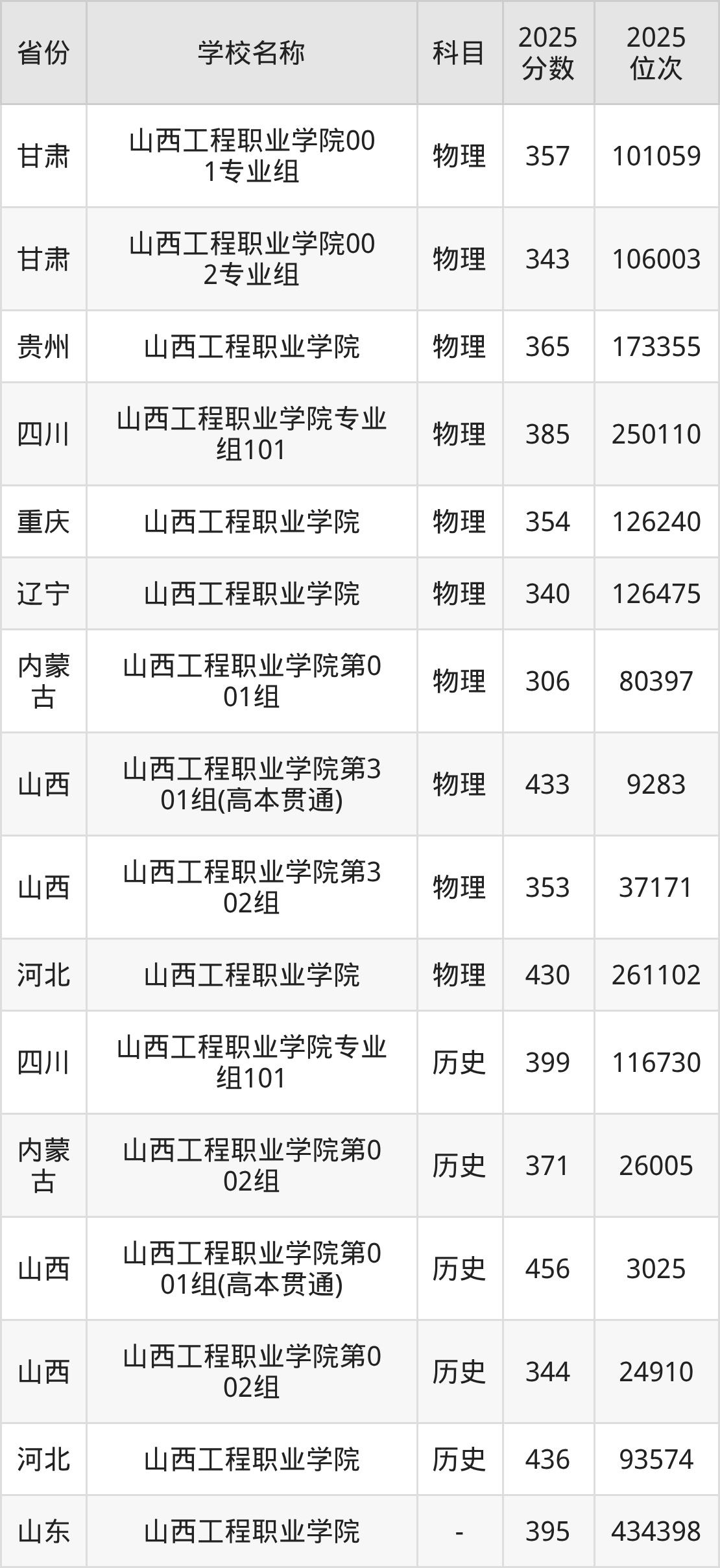 山西工程职业学院2025年有2个专业组面向山西省内首选了物理科目的考生招生: