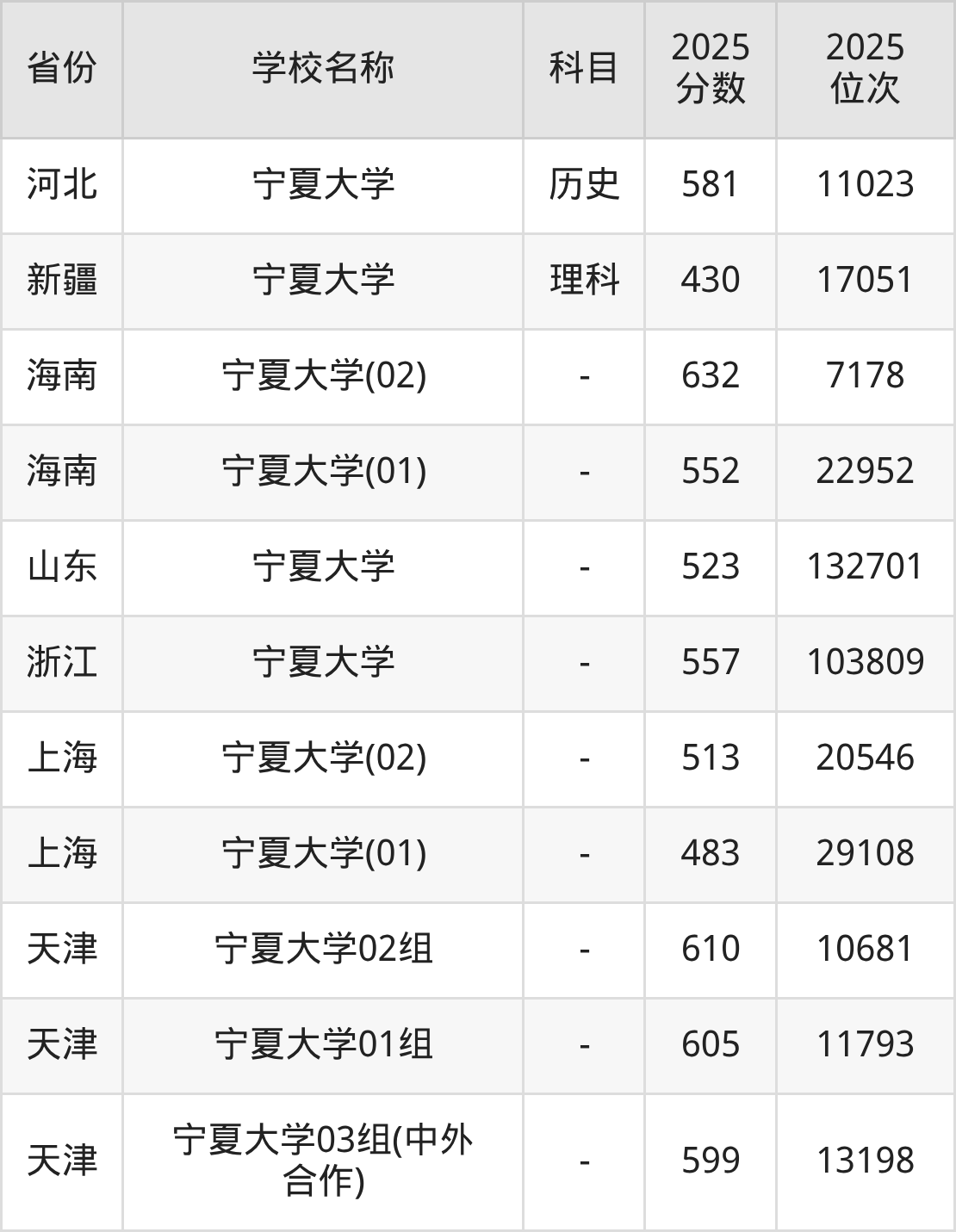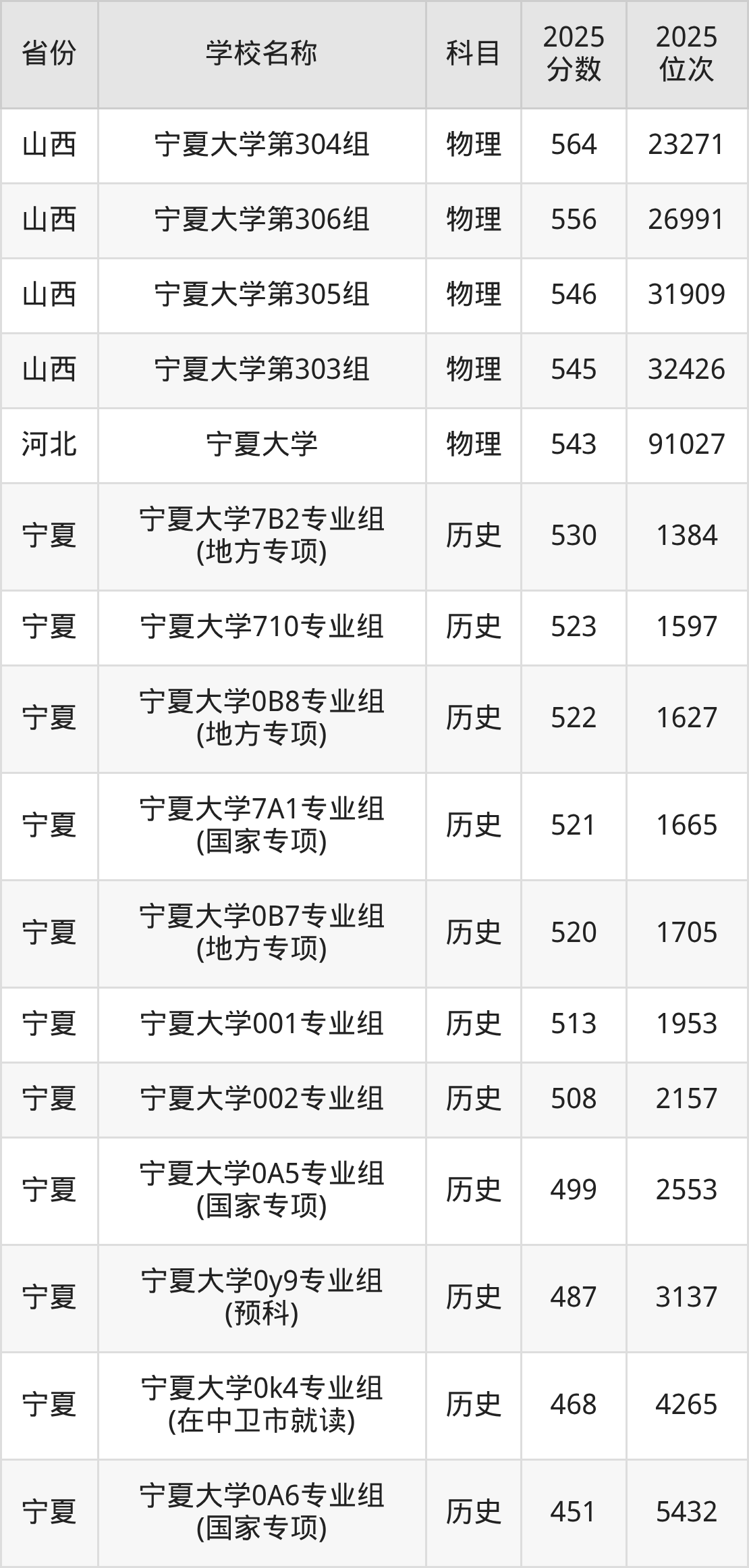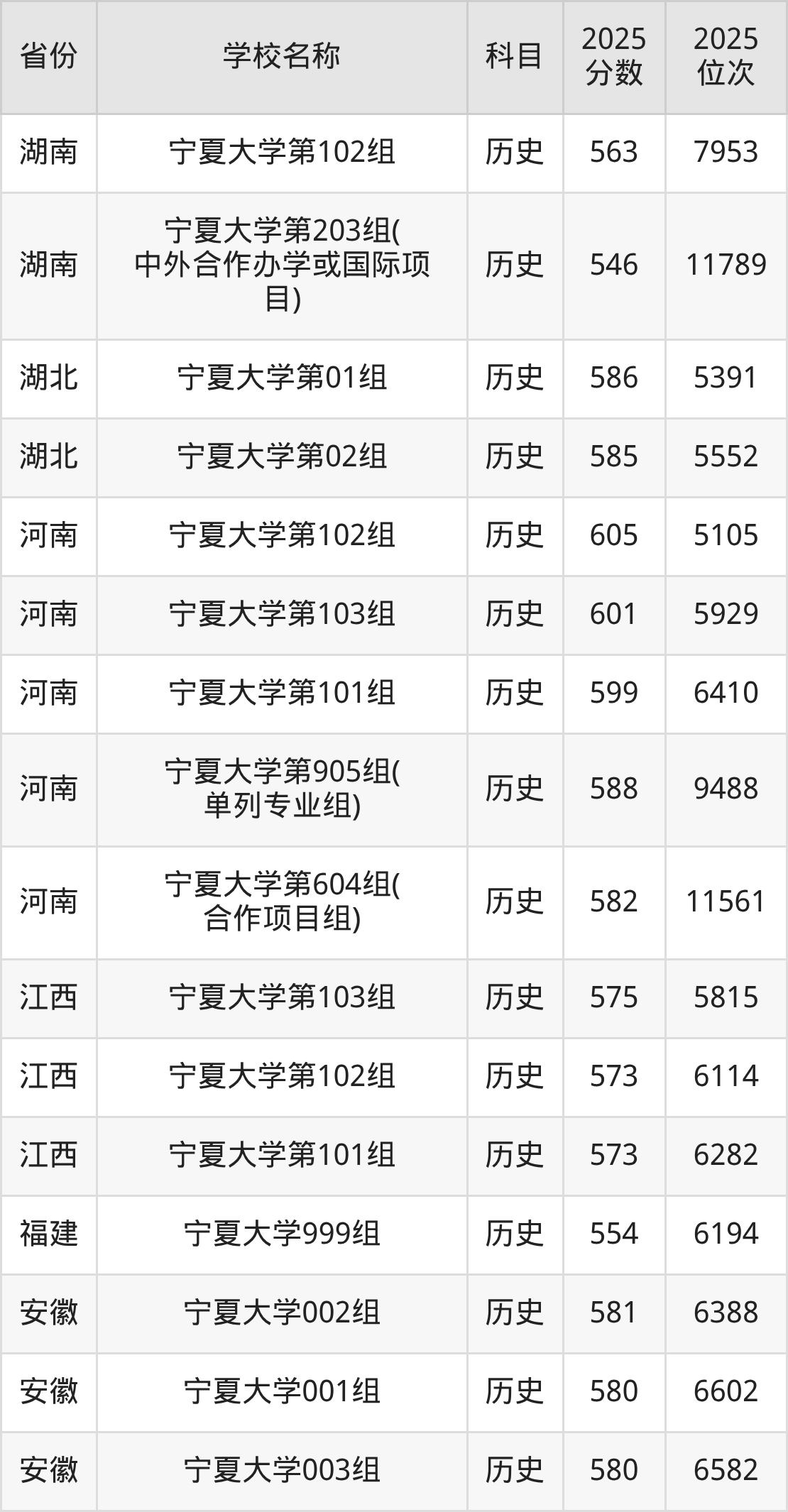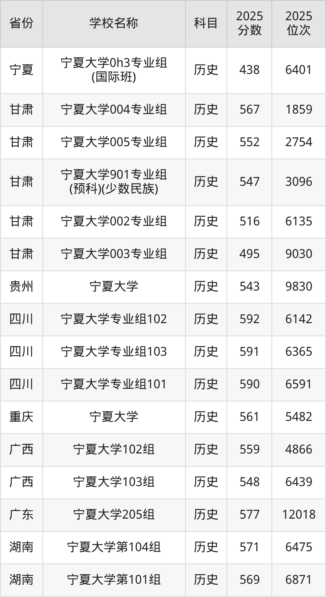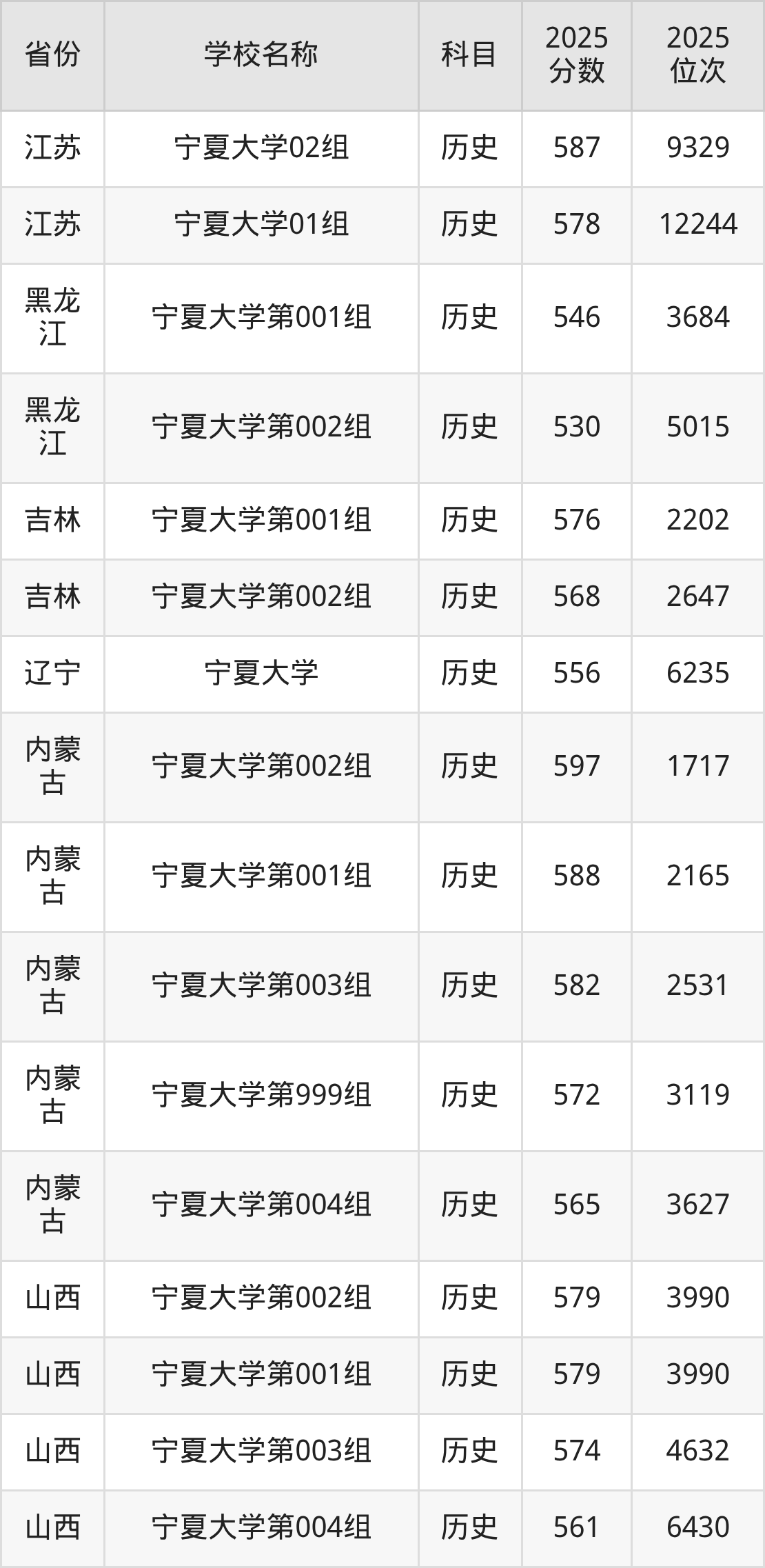 宁夏大学2025年有12个专业组面向宁夏回族自治区内首选了历史科目的考生招生: