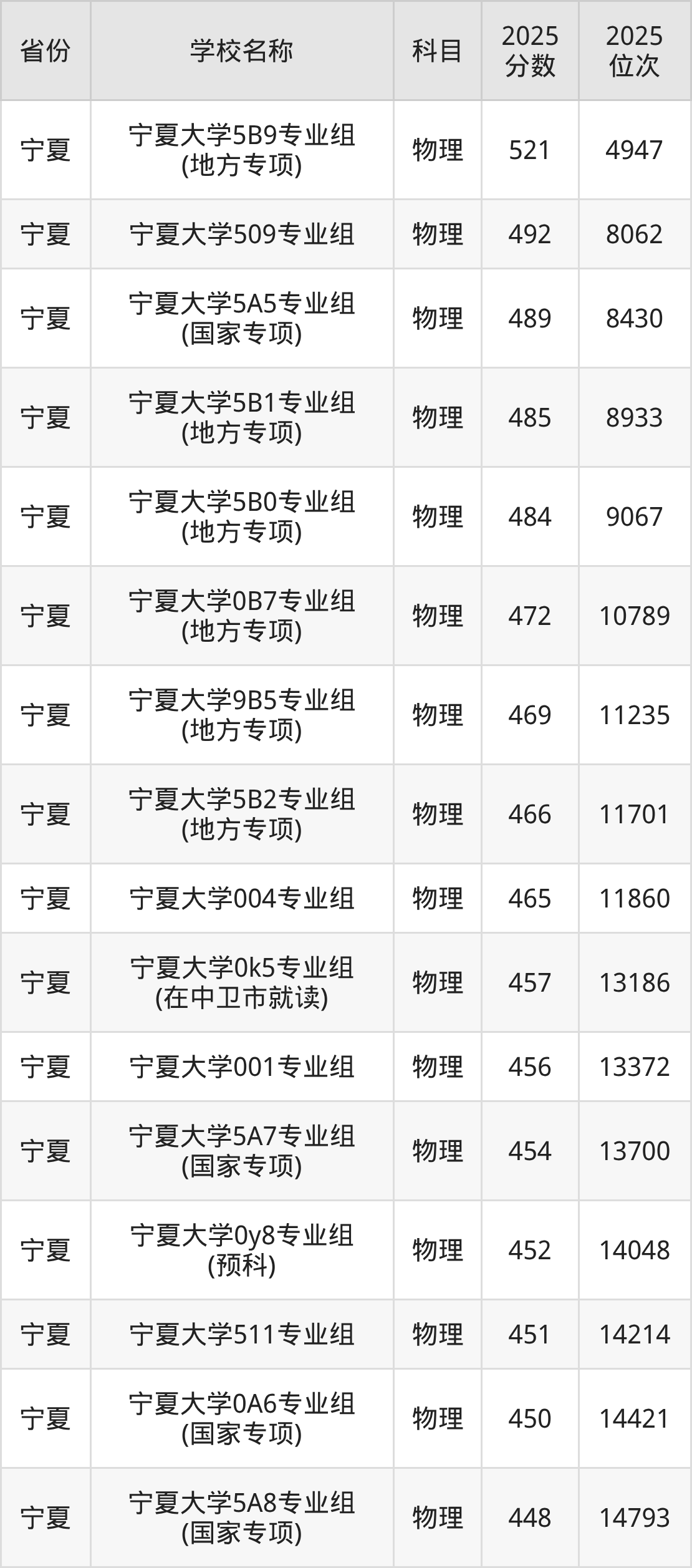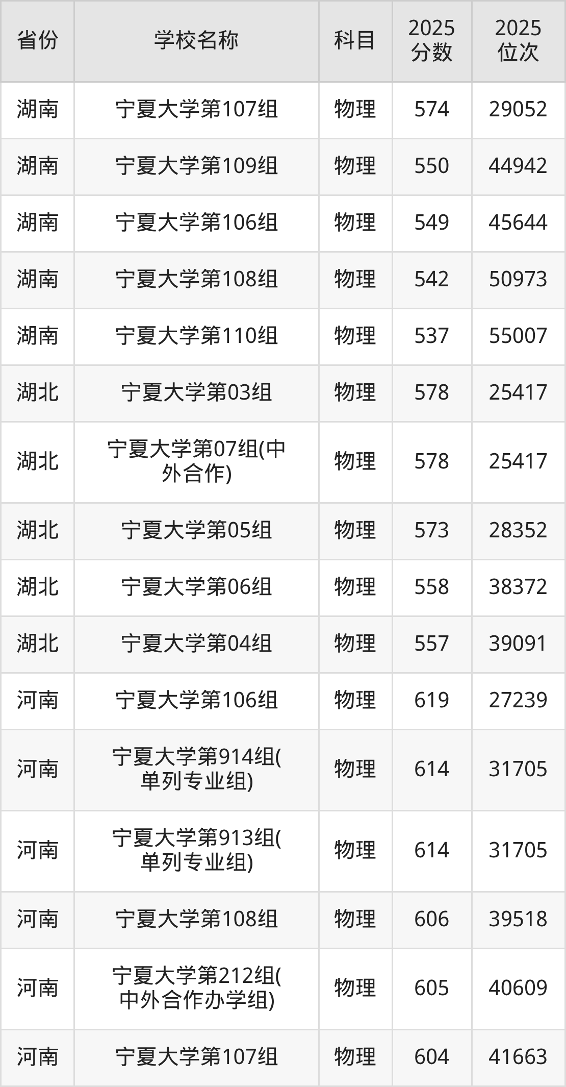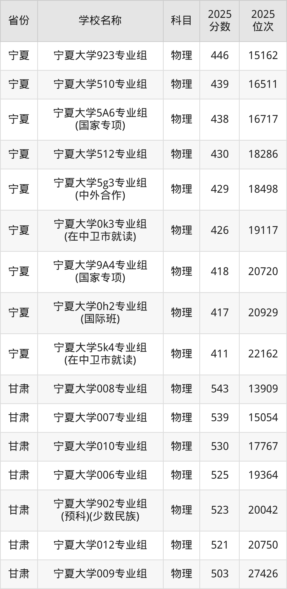 宁夏大学2025年有25个专业组面向宁夏回族自治区内首选了物理科目的考生招生: