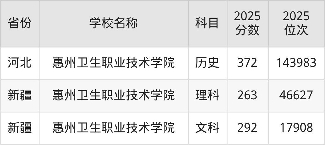 再看广东高考2025年专科批次线,历史类是215分、物理类是200分。通过对比发现:惠州卫生职业技术学院2025年历史类最低分比专科线高225分,物理类最低分比专科线高182分。2026届广东高考生,可通过每一次模考划线,来判断自己的成绩是否有机会被惠州卫生职业技术学院录取。
