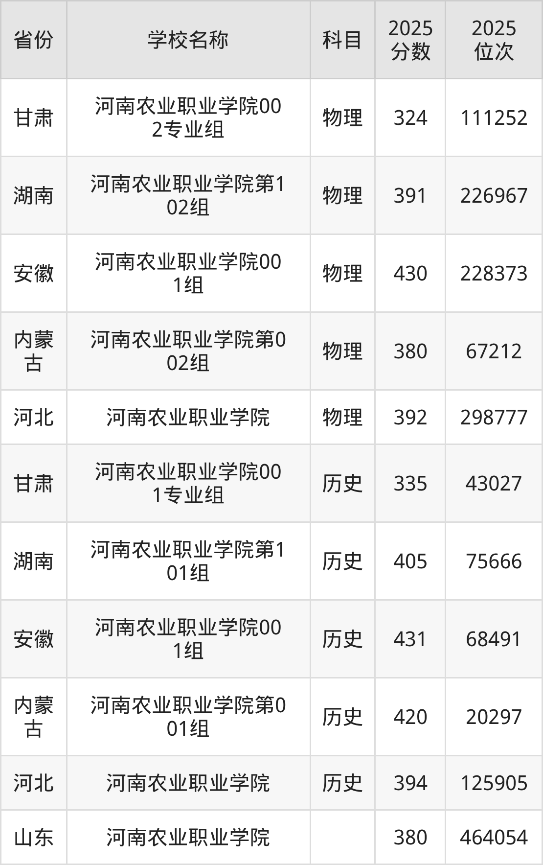 2025年河南农业职业学院在全国各省专科的最低录取分数线在324~431分之间。安徽物理类高考生最低430分能上河南农业职业学院、河北物理类高考生最低392分能上河南农业职业学院……下文将展示河南农业职业学院在全国6个高考省份中的专科最低投档录取分汇总!