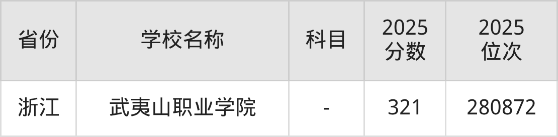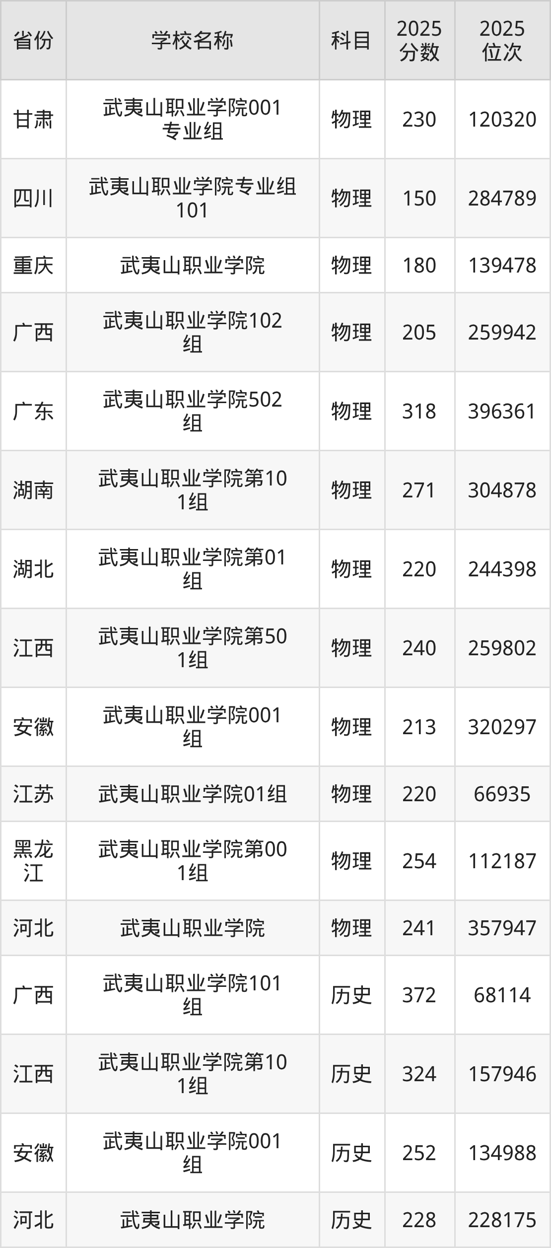 2025年武夷山职业学院在全国各省专科的最低录取分数线在150~372分之间。浙江高考生最低321分能上武夷山职业学院、广东物理类高考生最低318分能上武夷山职业学院……下文将展示武夷山职业学院在全国13个高考省份中的专科最低投档录取分汇总!