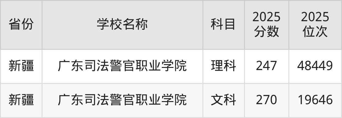 再看广东高考2025年专科批次线,历史类是215分、物理类是200分。通过对比发现:广东司法警官职业学院2025年历史类最低分比专科线高209分,物理类最低分比专科线高195分。2026届广东高考生,可通过每一次模考划线,来判断自己的成绩是否有机会被广东司法警官职业学院录取。