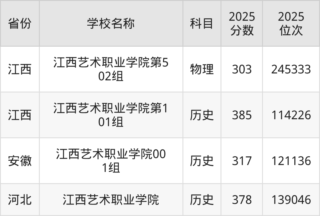 再看江西高考2025年专科批次线,历史类是290分、物理类是240分。通过对比发现:江西艺术职业学院2025年历史类最低分比专科线高95分,物理类最低分比专科线高63分。2026届江西高考生,可通过每一次模考划线,来判断自己的成绩是否有机会被江西艺术职业学院录取。
