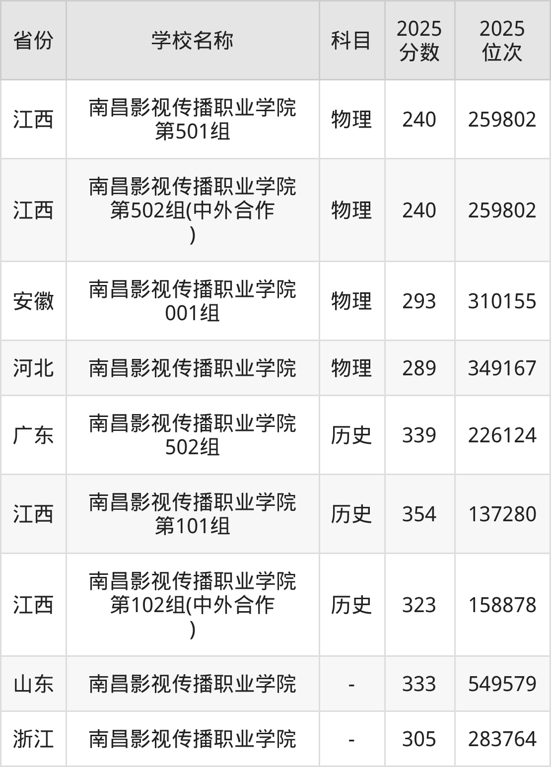 再看江西高考2025年专科批次线,历史类是290分、物理类是240分。通过对比发现:南昌影视传播职业学院2025年历史类最低分比专科线高33分,物理类最低分与专科线相等。2026届江西高考生,可通过每一次模考划线,来判断自己的成绩是否有机会被南昌影视传播职业学院录取。