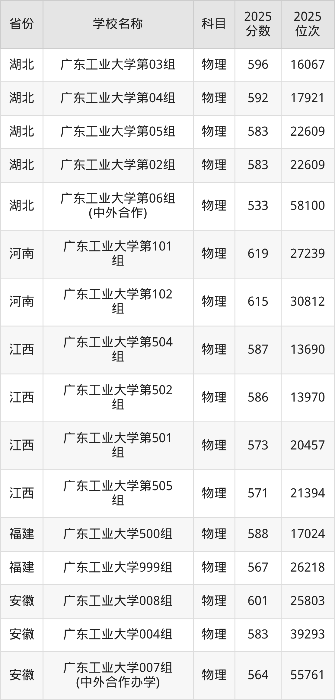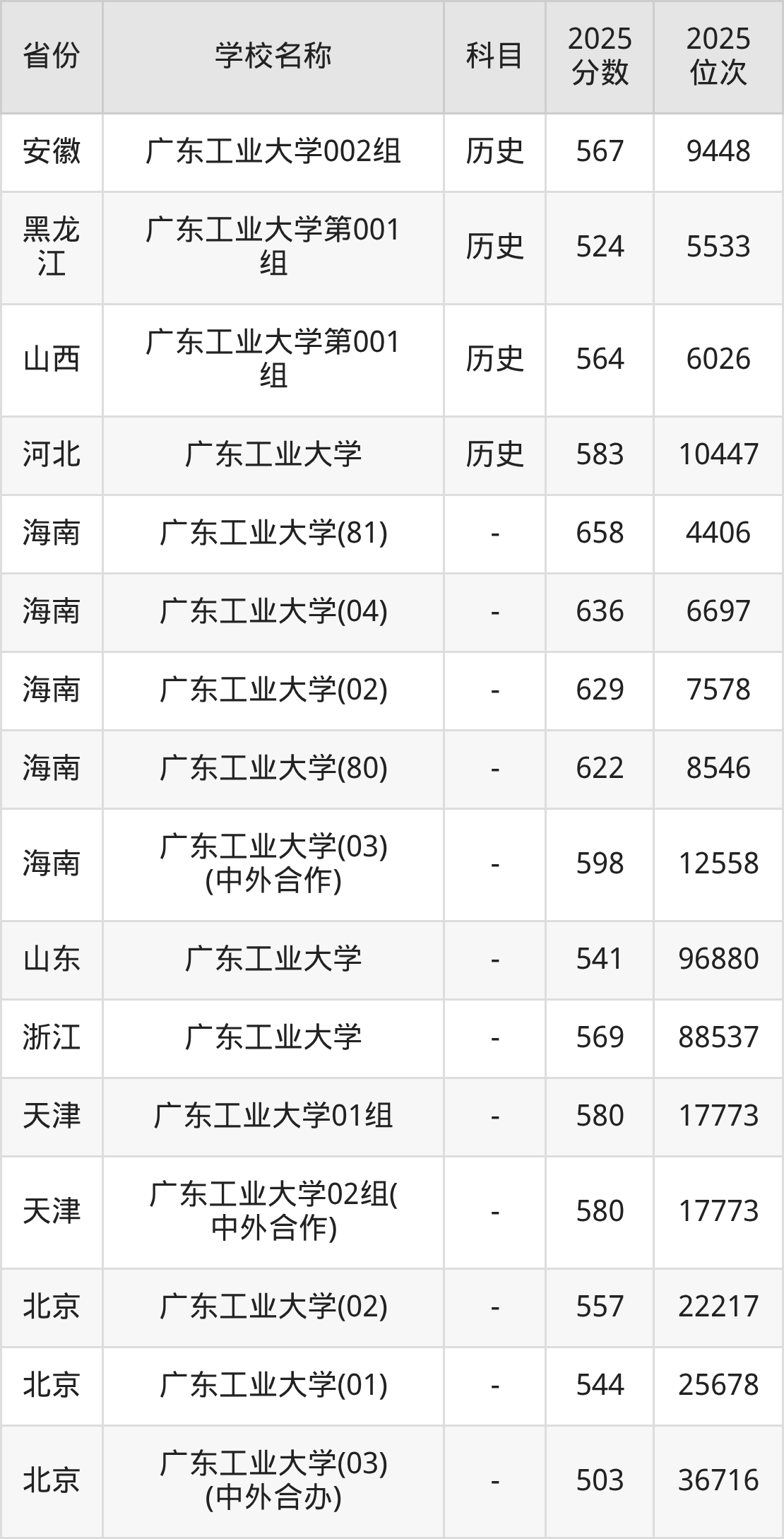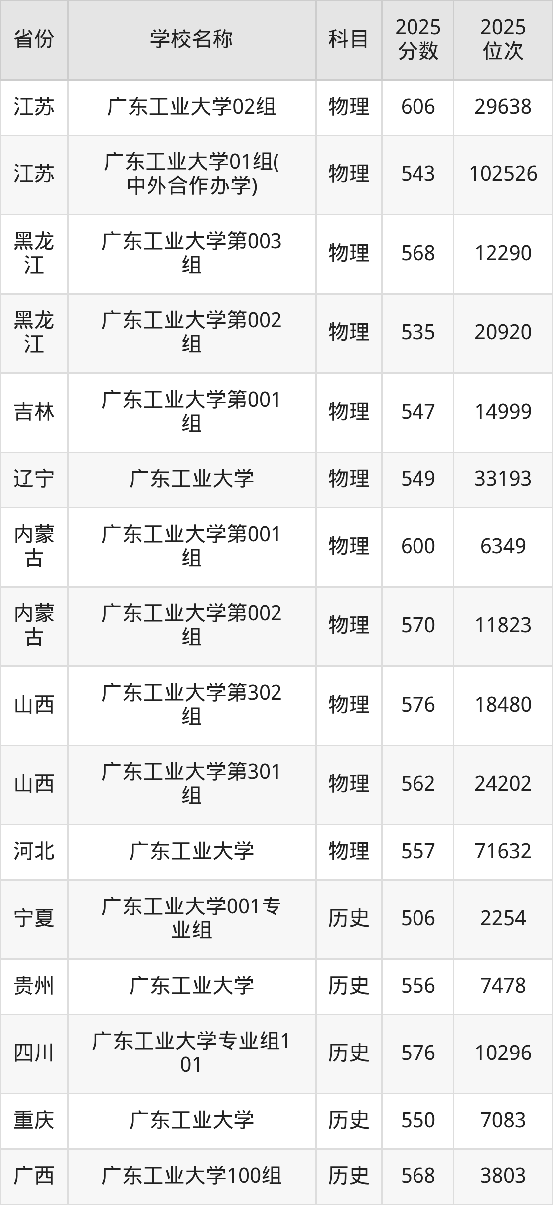 二、广东工业大学各专业录取分数线
