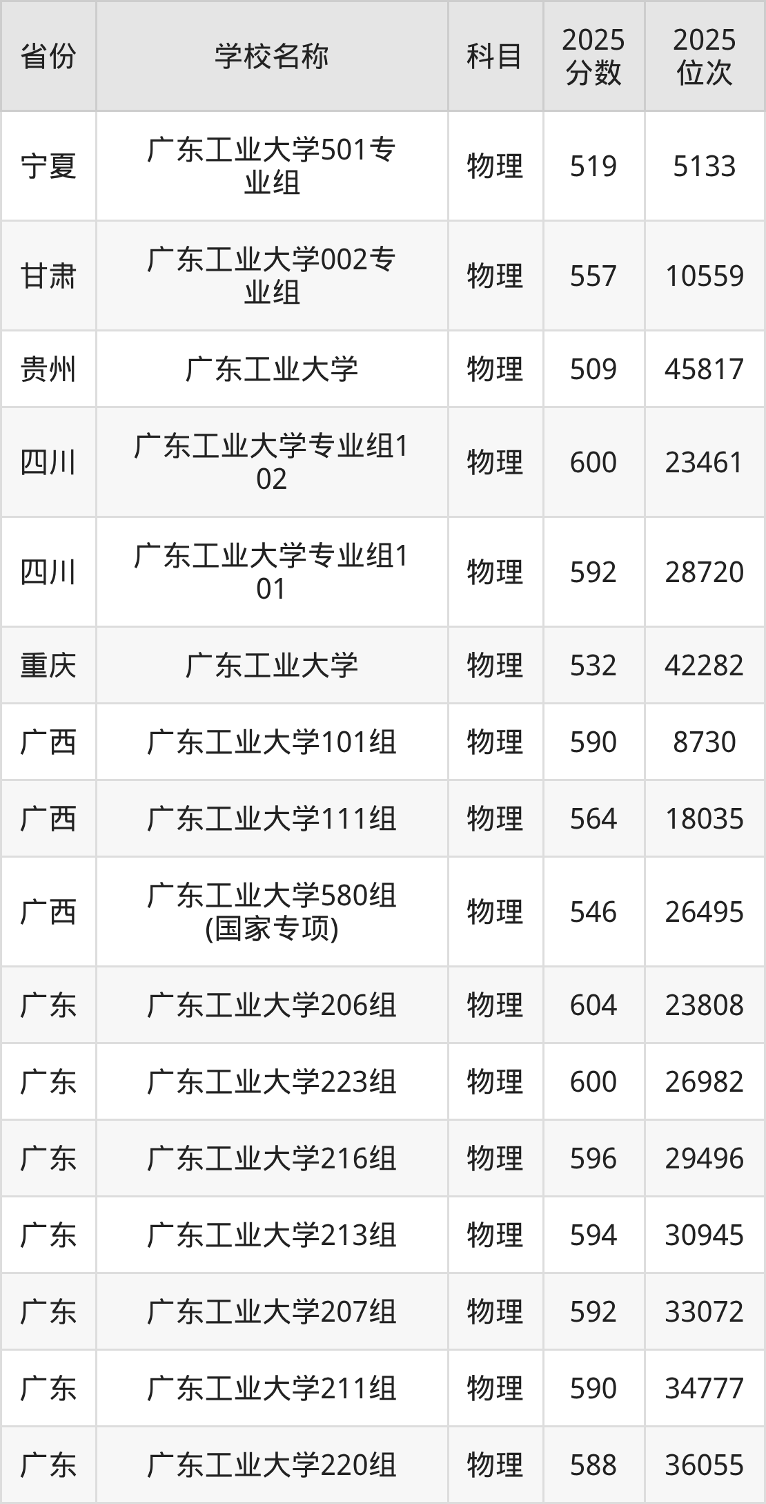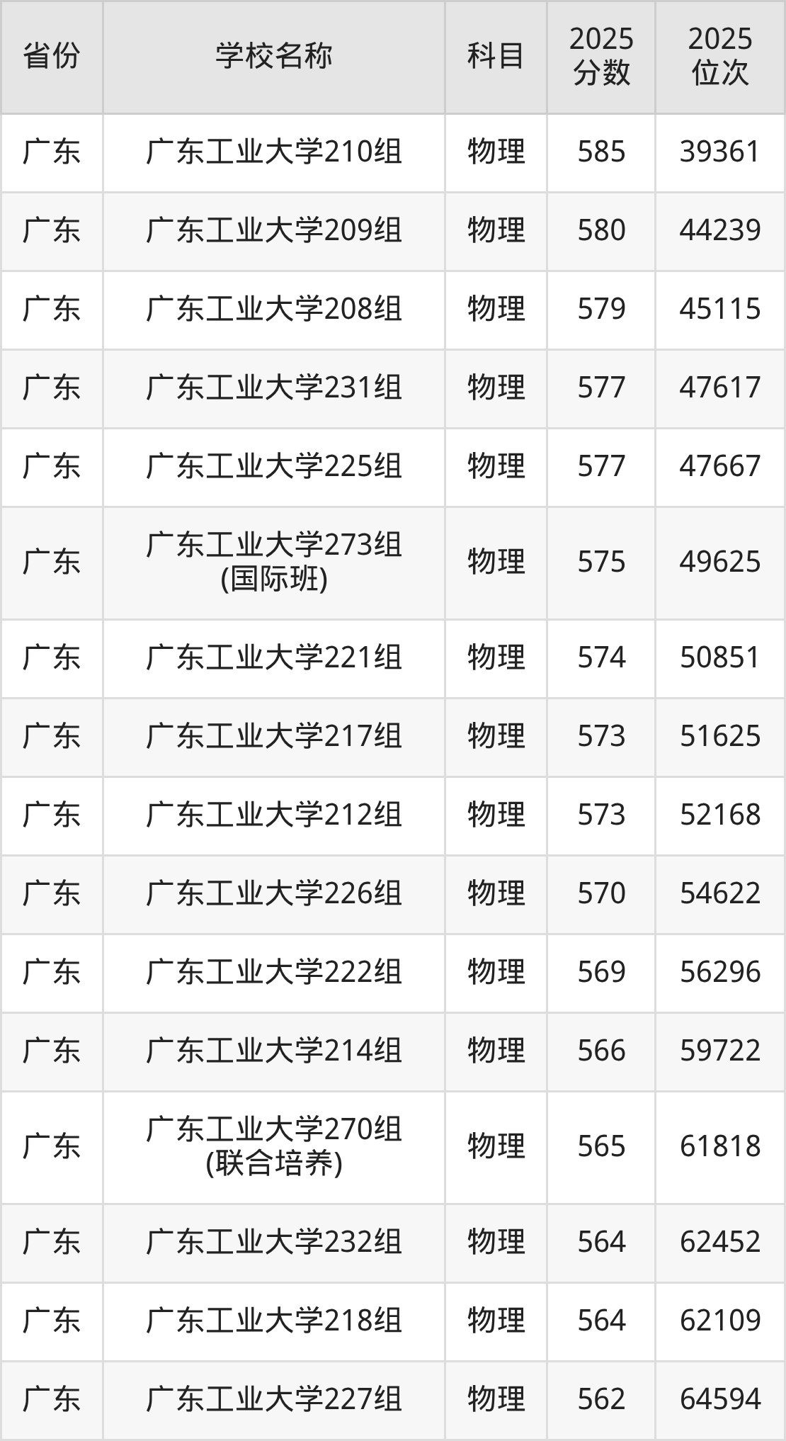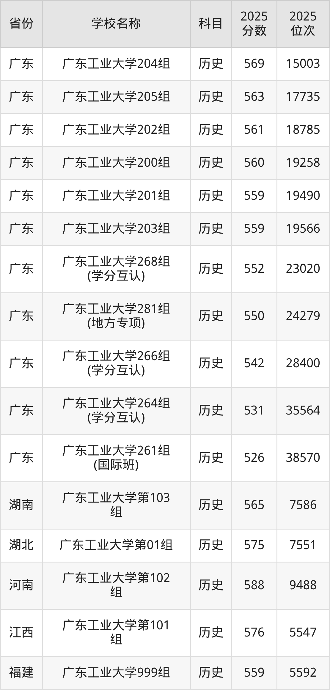 二、广东工业大学各专业录取分数线