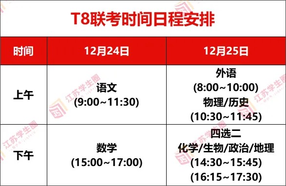 12月25日:上午8:00-10:00考外语,10:30-11:45考物理/历史(二选一);下午14:30-17:30考“四选二”科目(化学/生物/政治/地理,考生根据选科组合选择2门)。