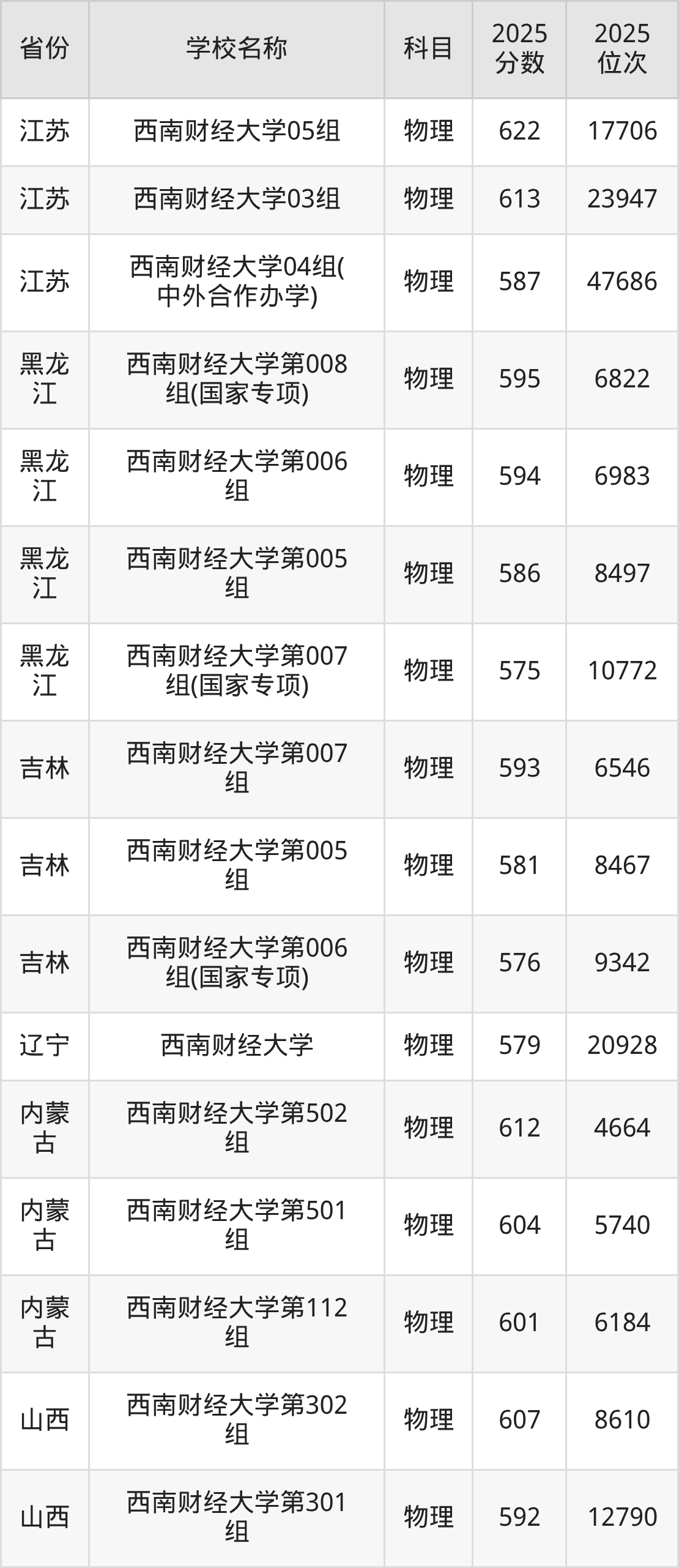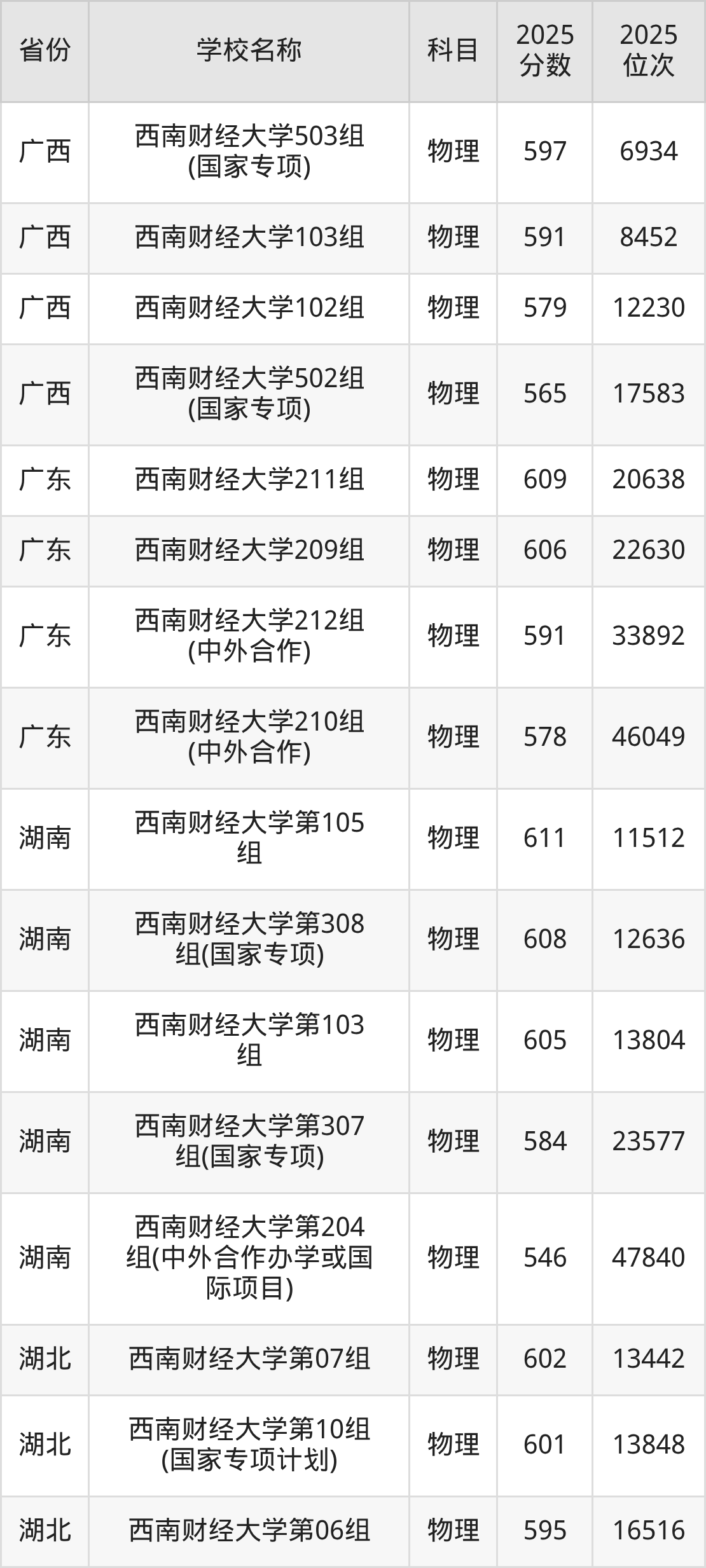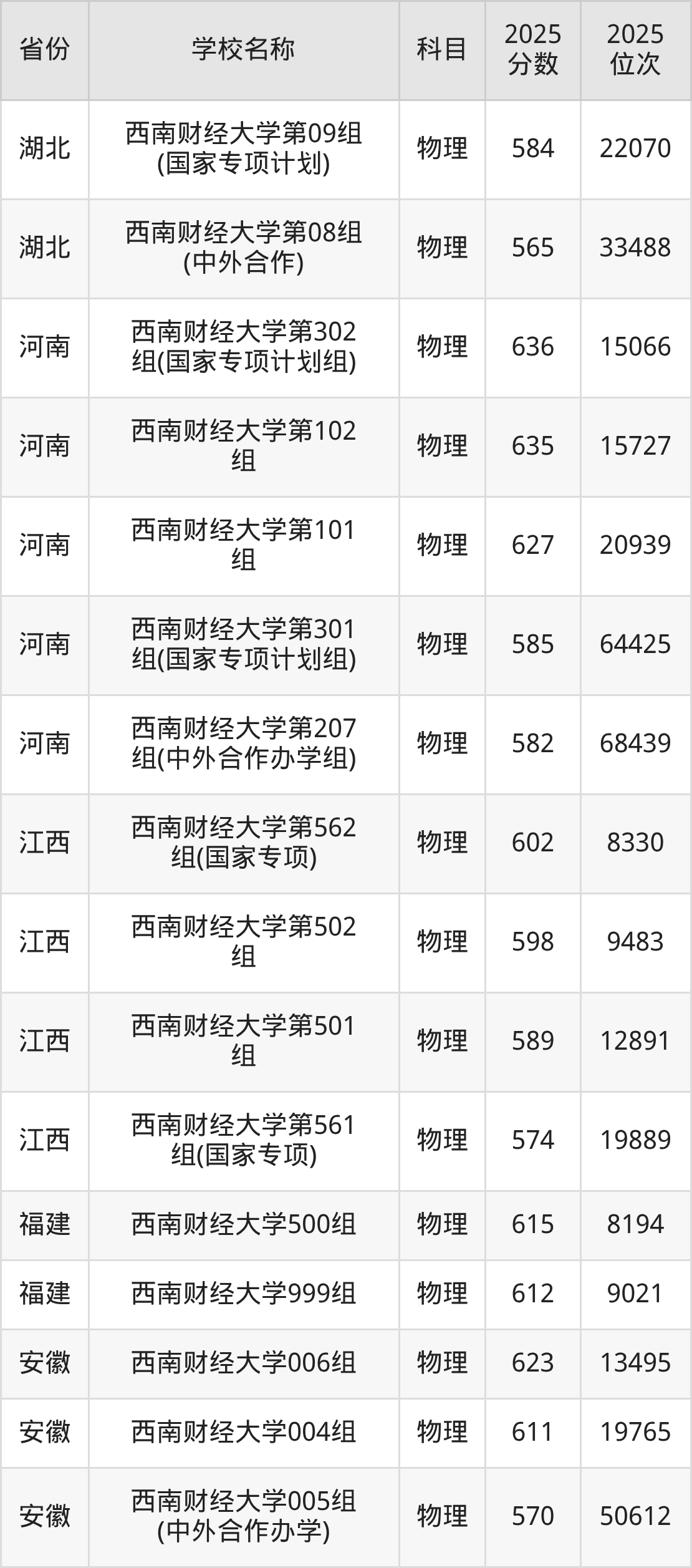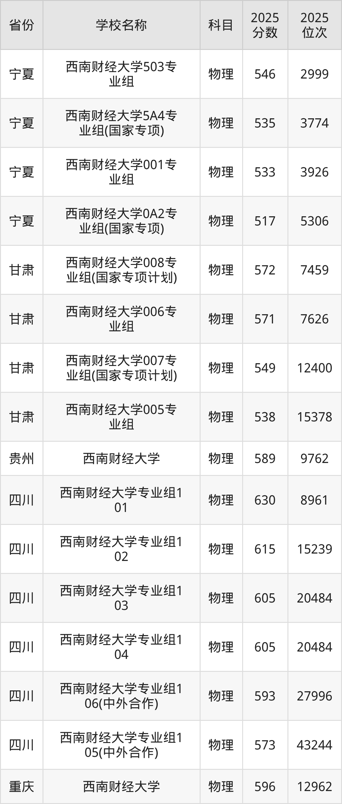 西南财经大学2025年有7个专业组面向四川省内首选了物理科目的考生招生: