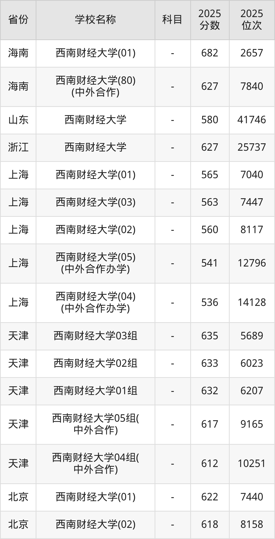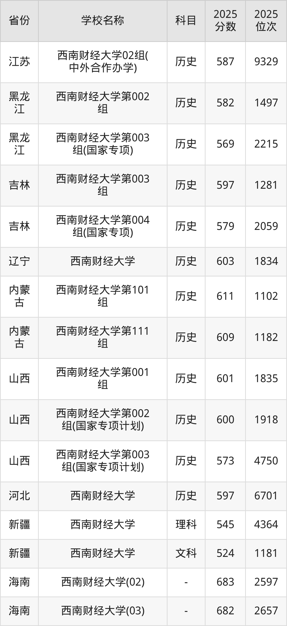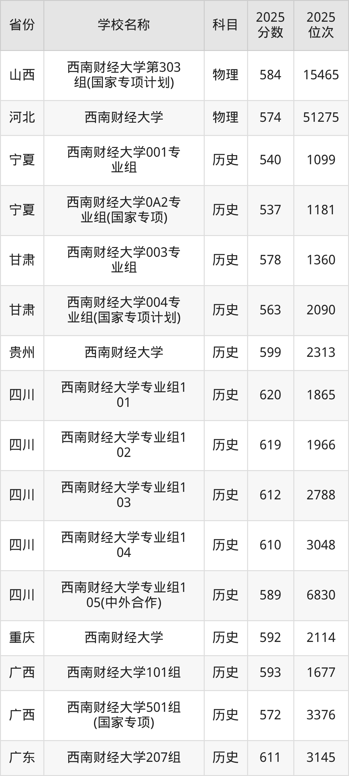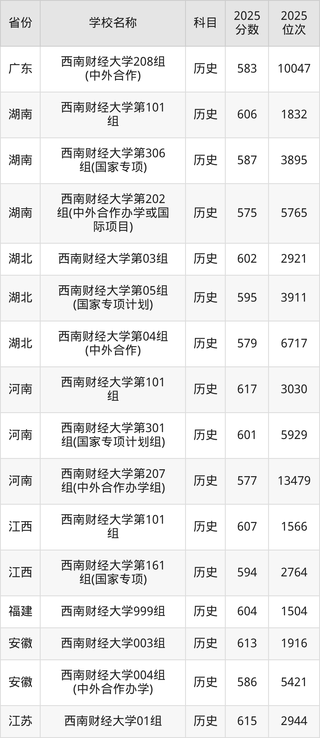 西南财经大学2025年有6个专业组面向四川省内首选了历史科目的考生招生: