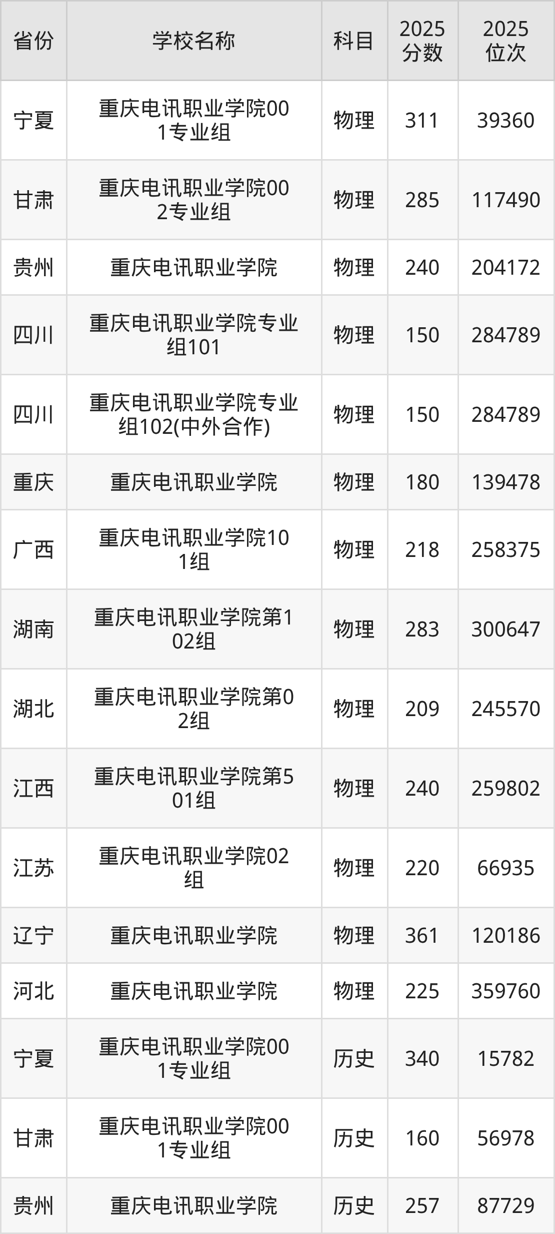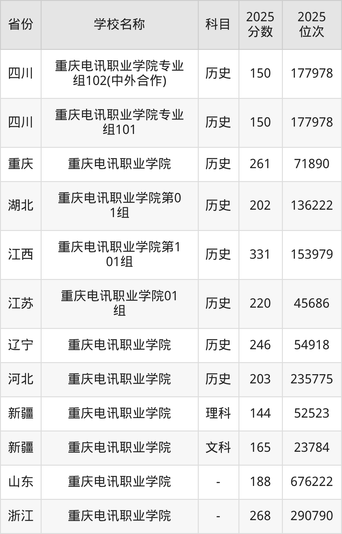 2025年重庆电讯职业学院在全国各省专科的最低录取分数线在144~361分之间。辽宁物理类高考生最低361分能上重庆电讯职业学院、宁夏物理类高考生最低311分能上重庆电讯职业学院……下文将展示重庆电讯职业学院在全国15个高考省份中的专科最低投档录取分汇总!
