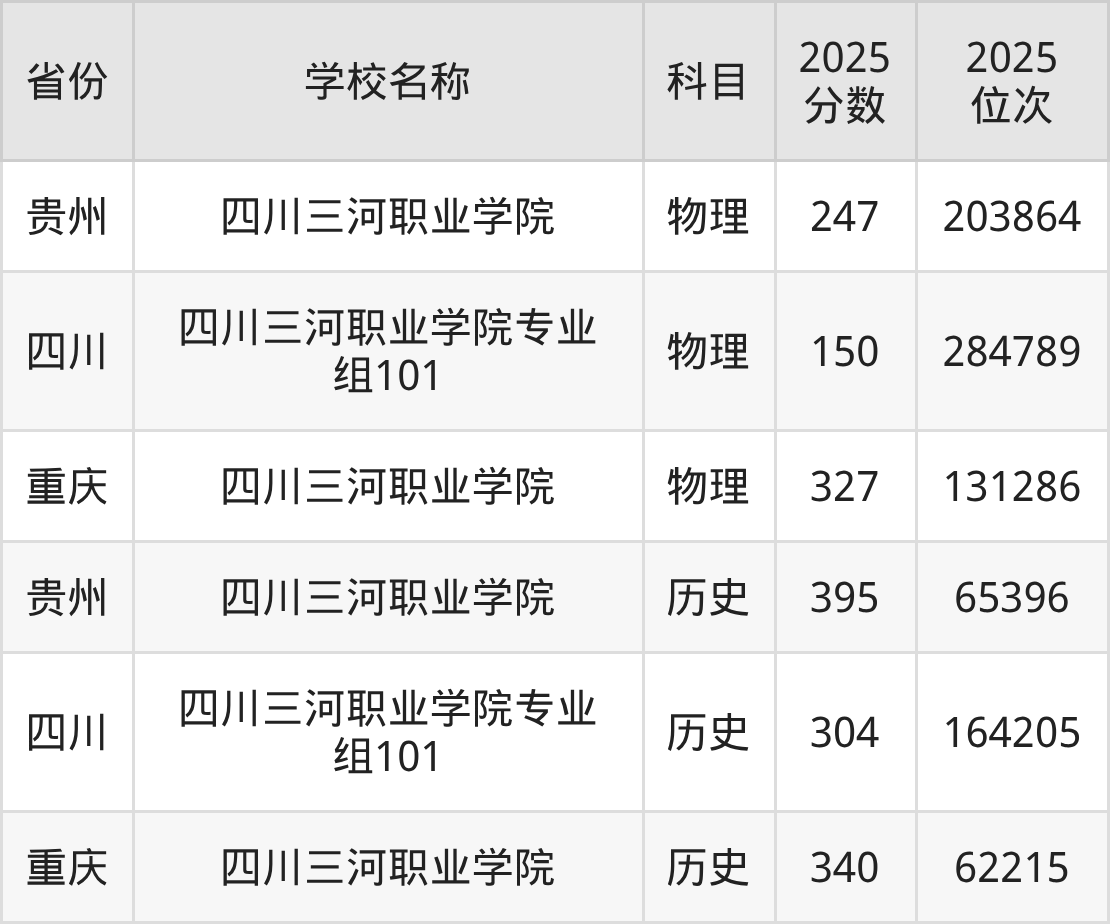 再看四川高考2025年专科批次线,历史类是150分、物理类是150分。通过对比发现:四川三河职业学院2025年历史类最低分比专科线高154分,物理类最低分与专科线相等。2026届四川高考生,可通过每一次模考划线,来判断自己的成绩是否有机会被四川三河职业学院录取。