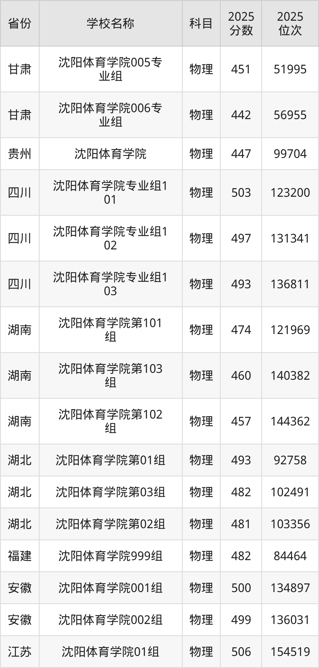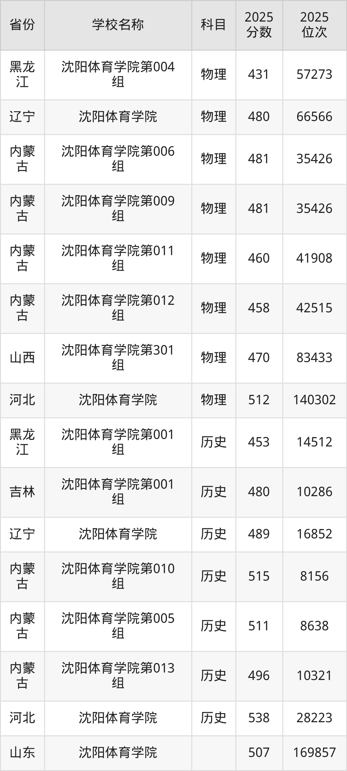 二、沈阳体育学院各专业录取分数线