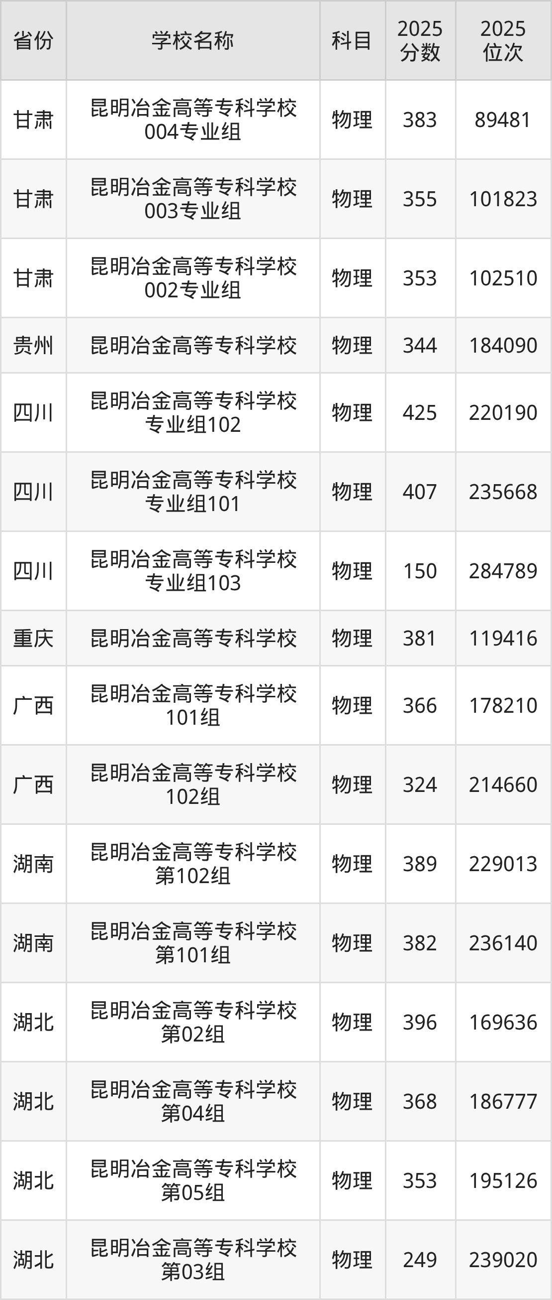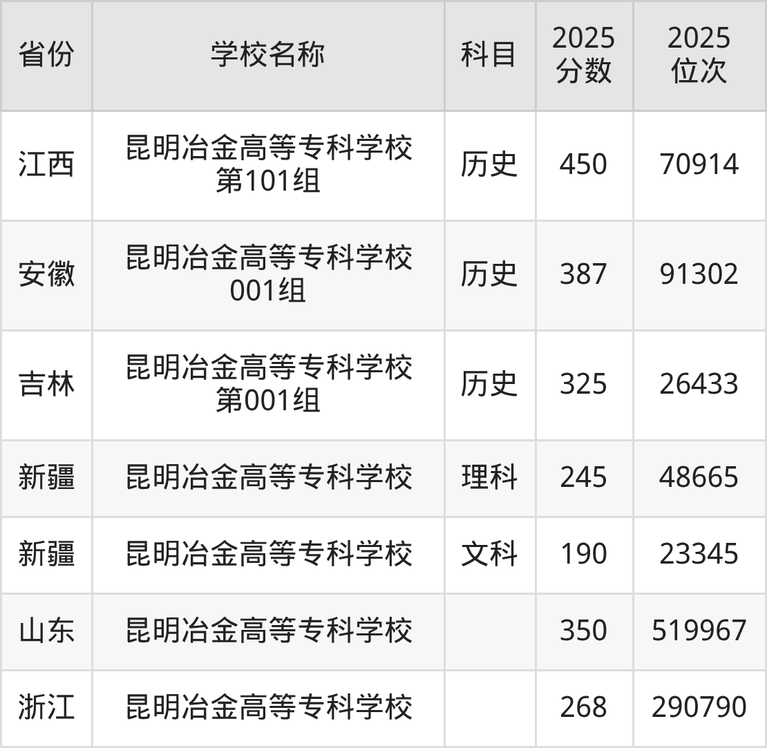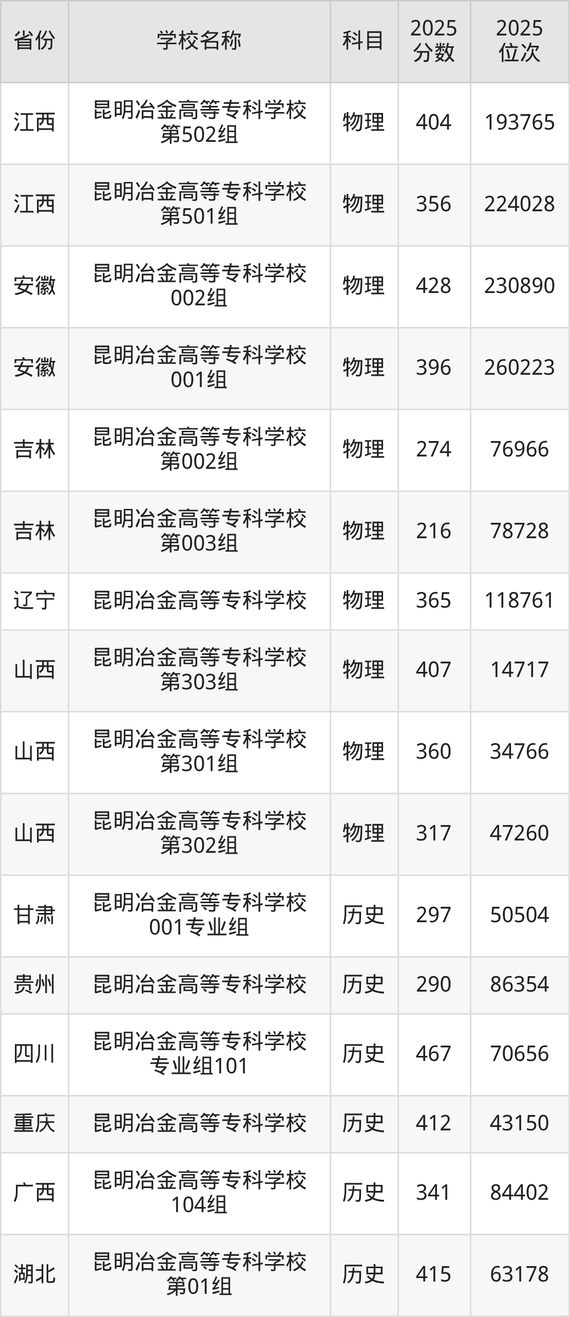 2025年昆明冶金高等专科学校在全国各省专科的最低录取分数线在150~467分之间。安徽物理类高考生最低428分能上昆明冶金高等专科学校、四川物理类高考生最低425分能上昆明冶金高等专科学校……下文将展示昆明冶金高等专科学校在全国15个高考省份中的专科最低投档录取分汇总!