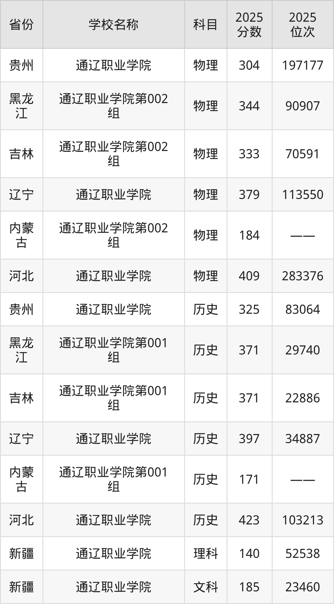 一、2025通辽职业学院录取分数线